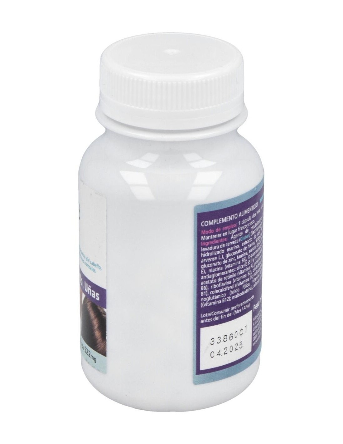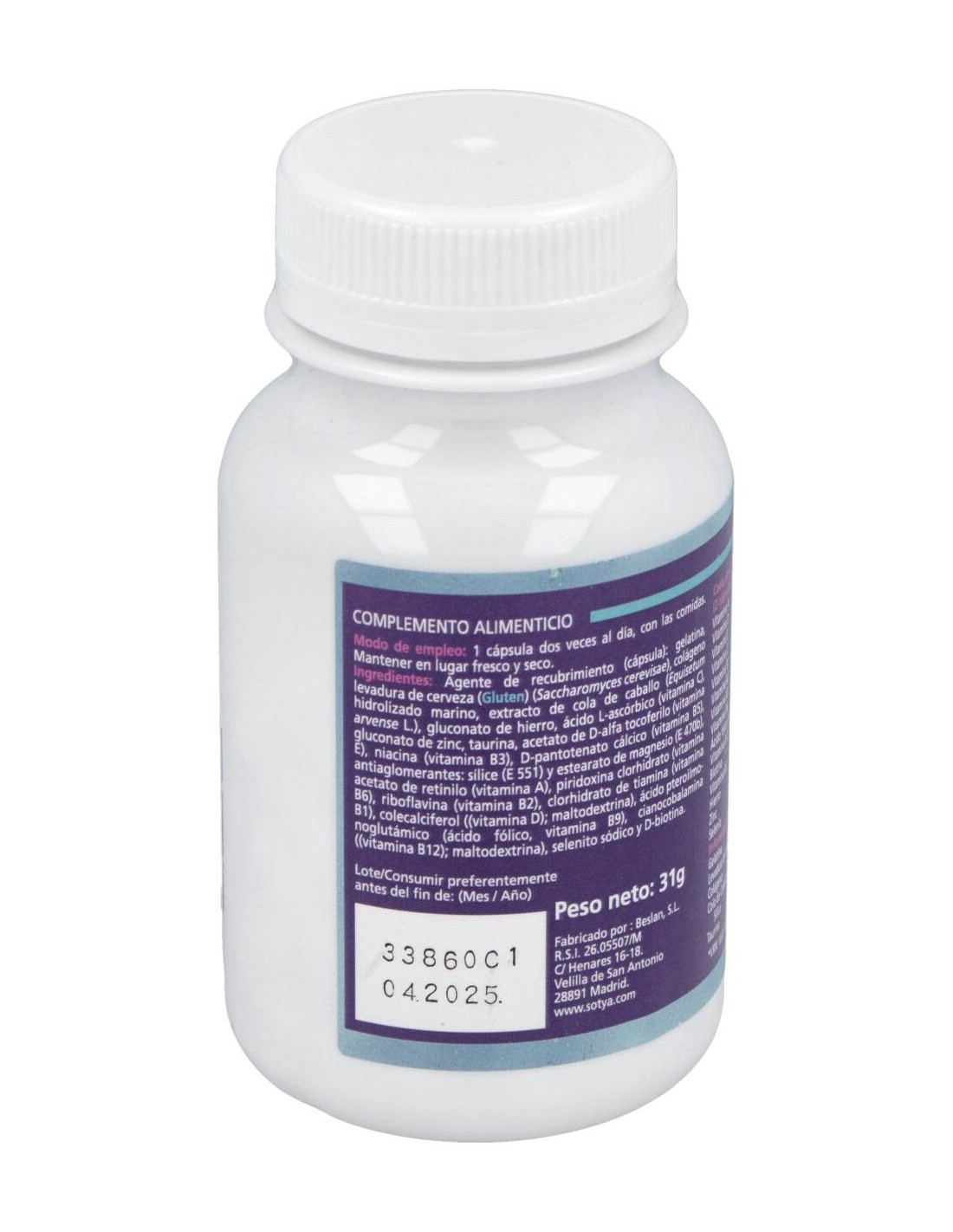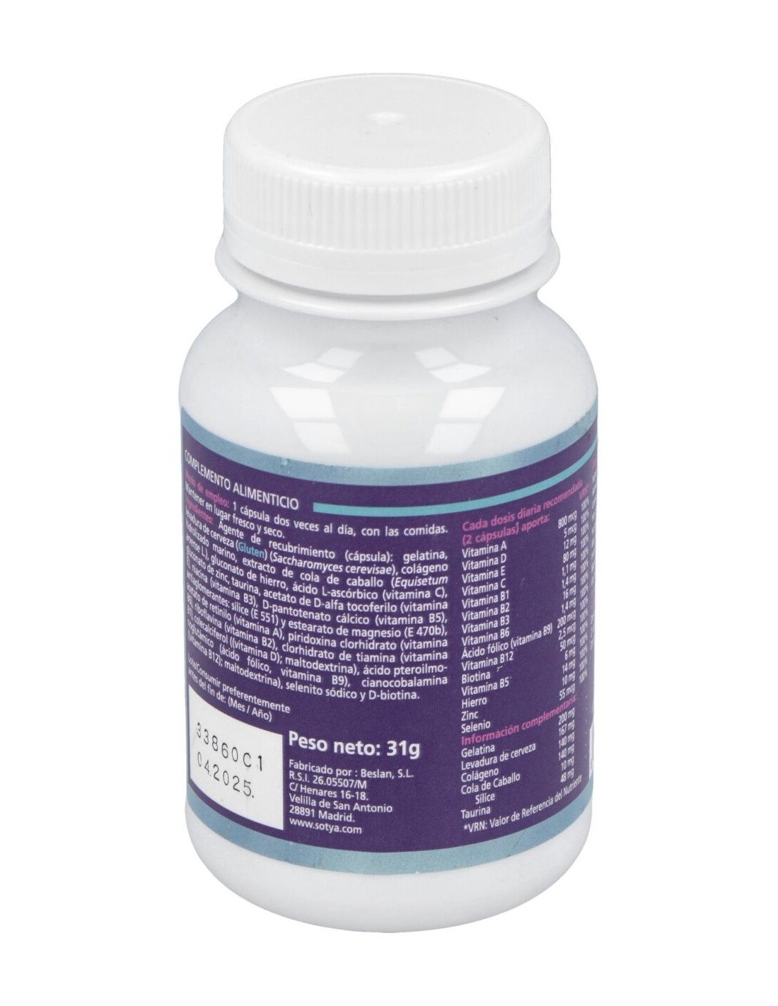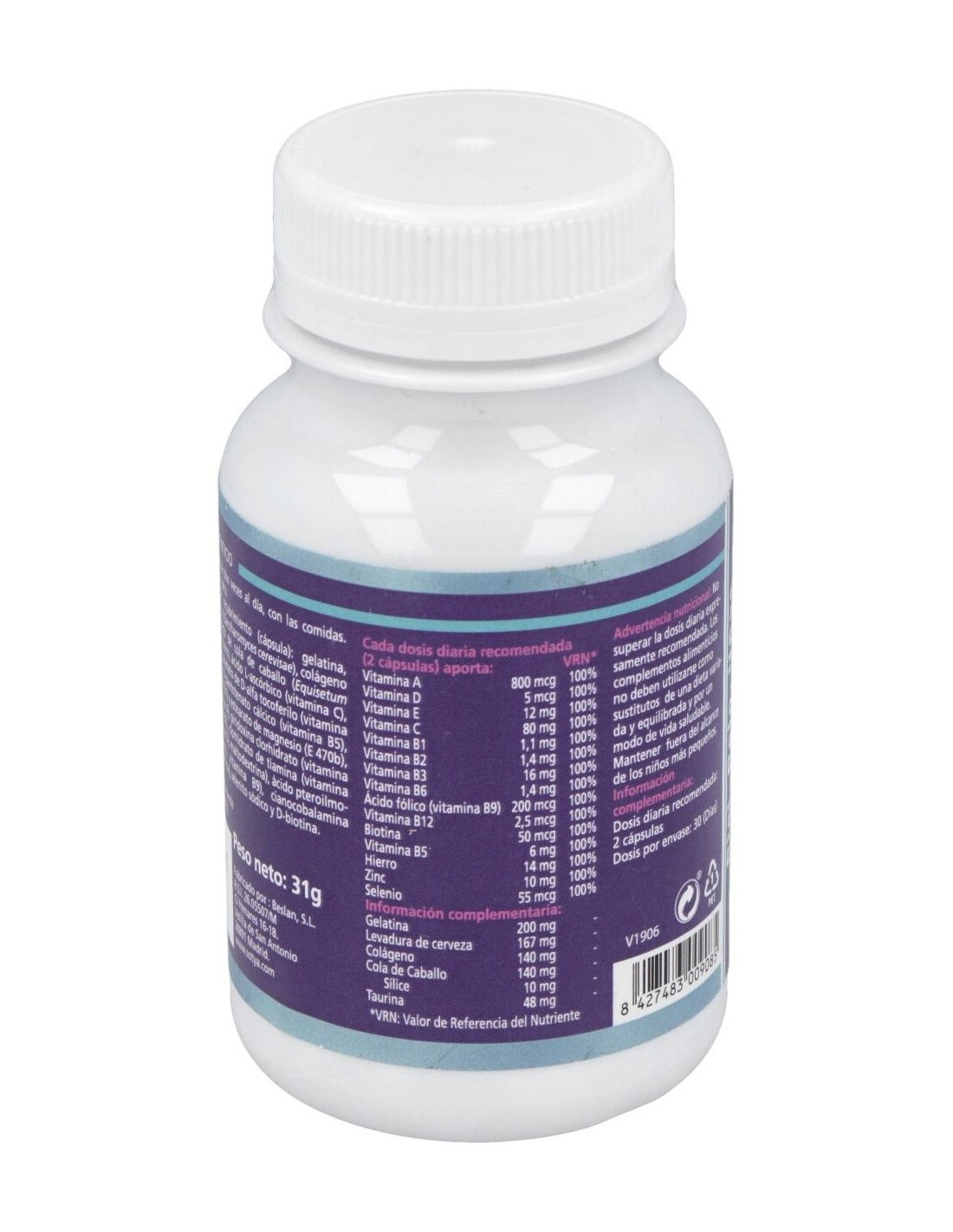 Levadura de cerveza desactivada 77.5 mg, Gelatina hidrolizada de pesacado 75 mg, Colégeno marino 75 mg, Cola de caballo extracto 5:1 75 mg, Vitamina C (Ácido ascórbico) 30 mg, Taurina 25 mg, Gluconato de hierro 35 mg, Zinc (gluconato) 25 mg, Selenio (Levadura) 10 mg, Vitamina B3 (Nicotinamida) 9 mg, Vitamina E (D-alfa tocoferol acetato) 5 mg, Vitamina B5 (Ácido pantoténico) 3 mg, Vitamina B6 (Piridoxina HCL) 1 mg, Vitamina B2 (Riboflavina) 800 µg, Vitamina B9 (Ácido fólico) 100 µg, Biotina 75 µg, Vitamina D (Ergocalciferol) 2,5 µg, Vitamina B12 (Cianocobalamina) 0,5. µg
