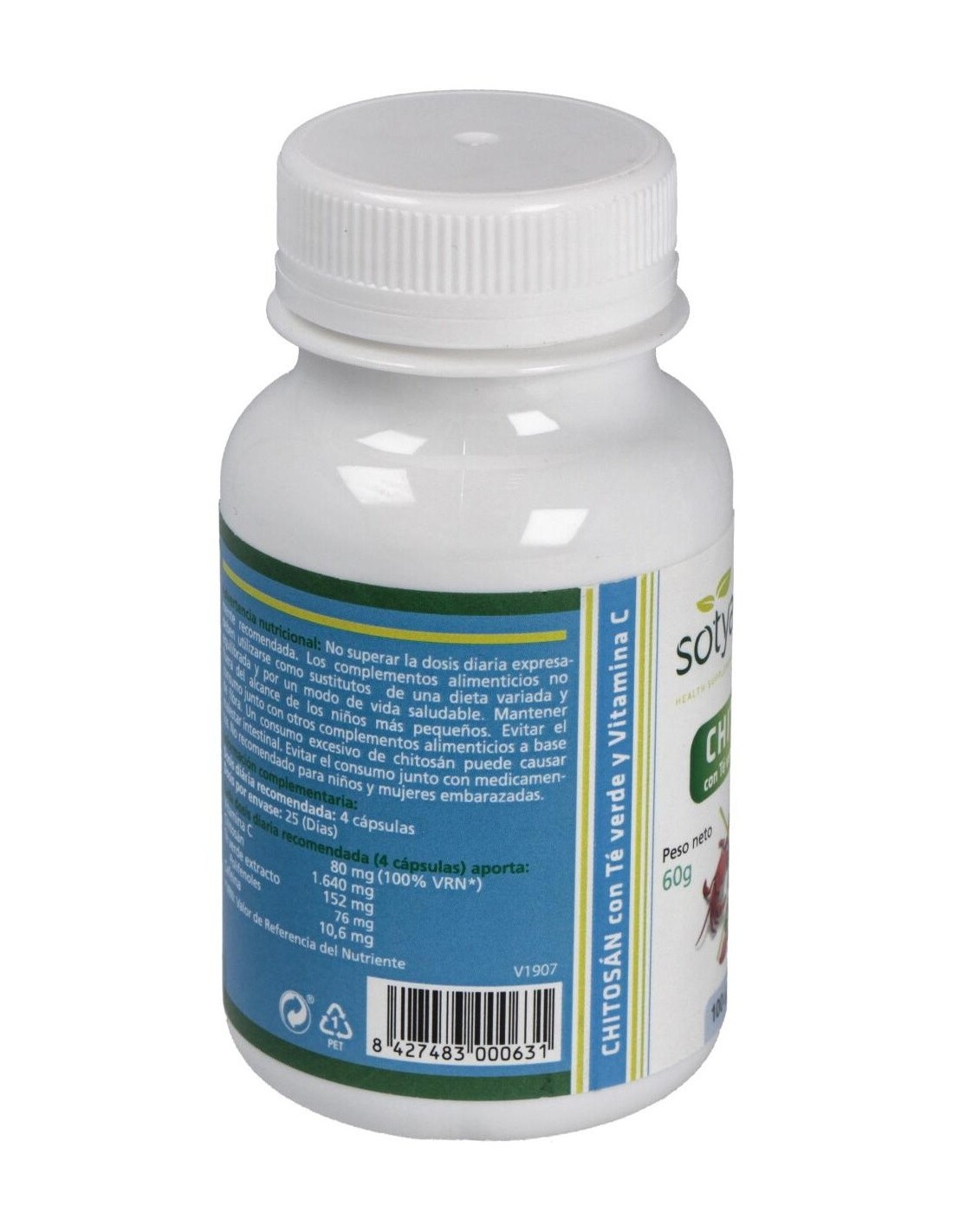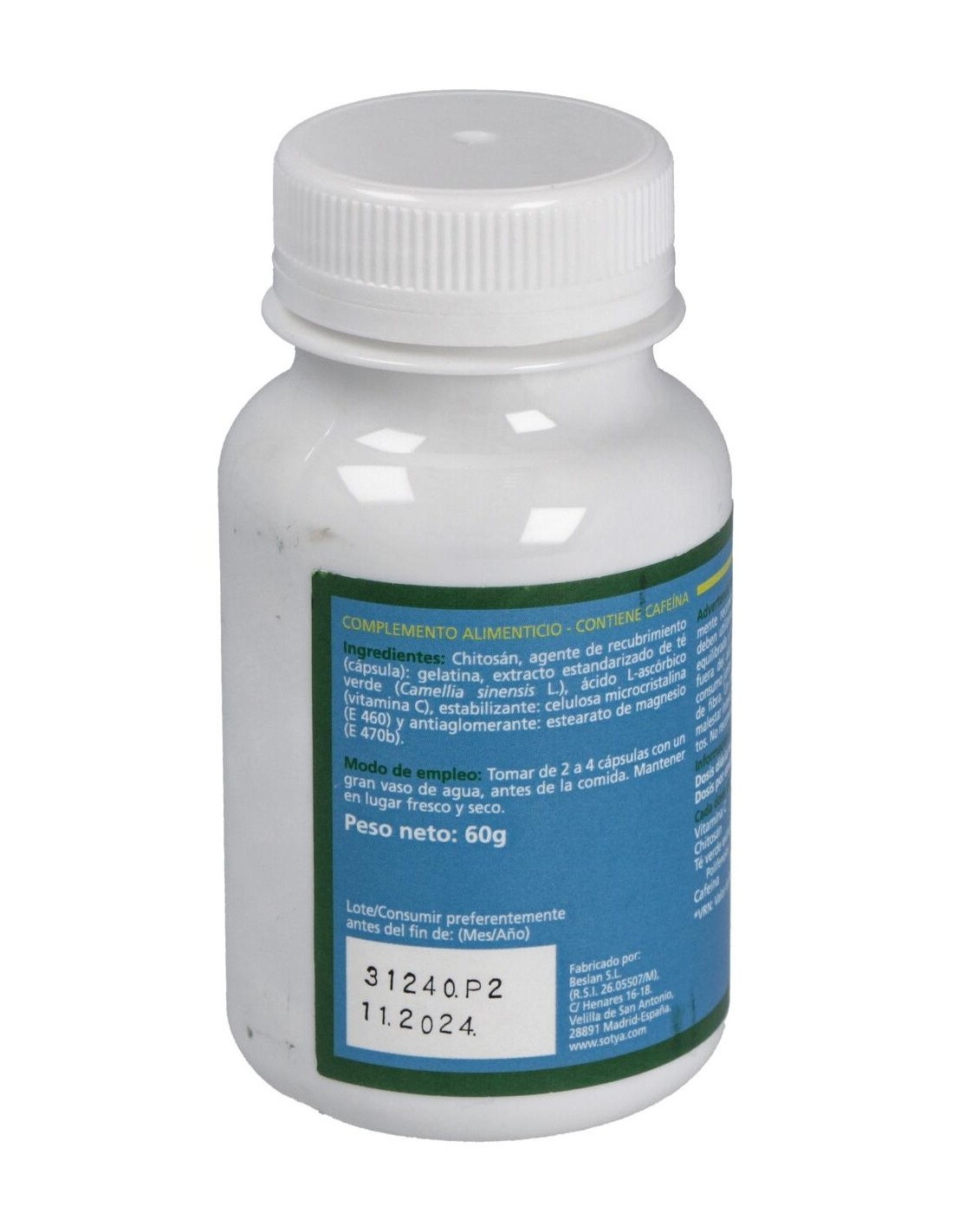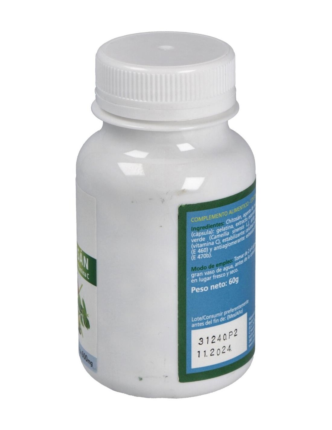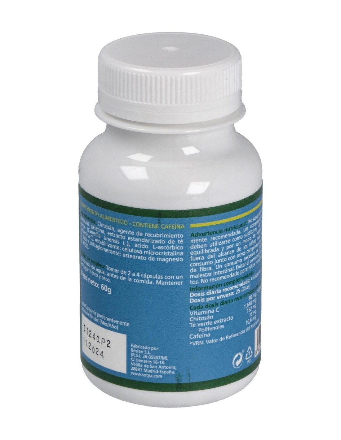 Cada cápsula contiene 410mg de chitosán, 37mg de extracto de té verde (50% polifenoles, 30% catequinas), 20mg de vitamina C (16% CDR). Cápsula vegetal de celulosa.