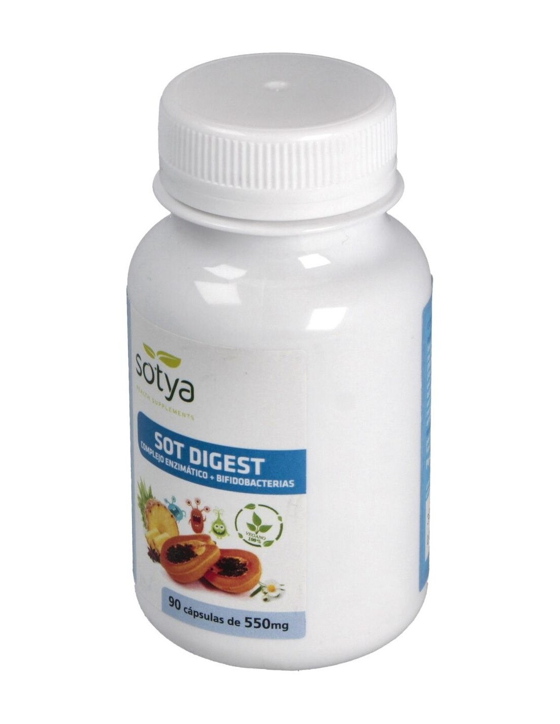 Sotya Sot Digest 550mg es un complemento alimenticio que engloba un conjunto de ingredientes que te ayudarán a facilitar la digestión y absorber mejor los nutrientes: enzimas digestivas, papaya y piña, bifidobacterias.