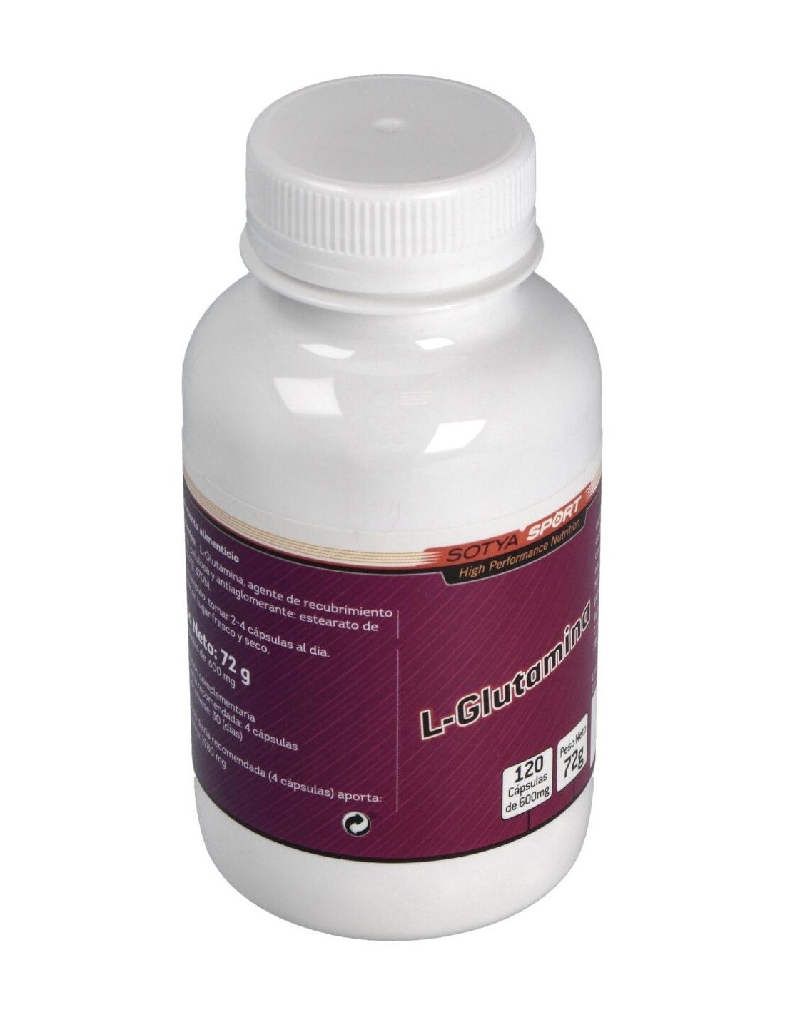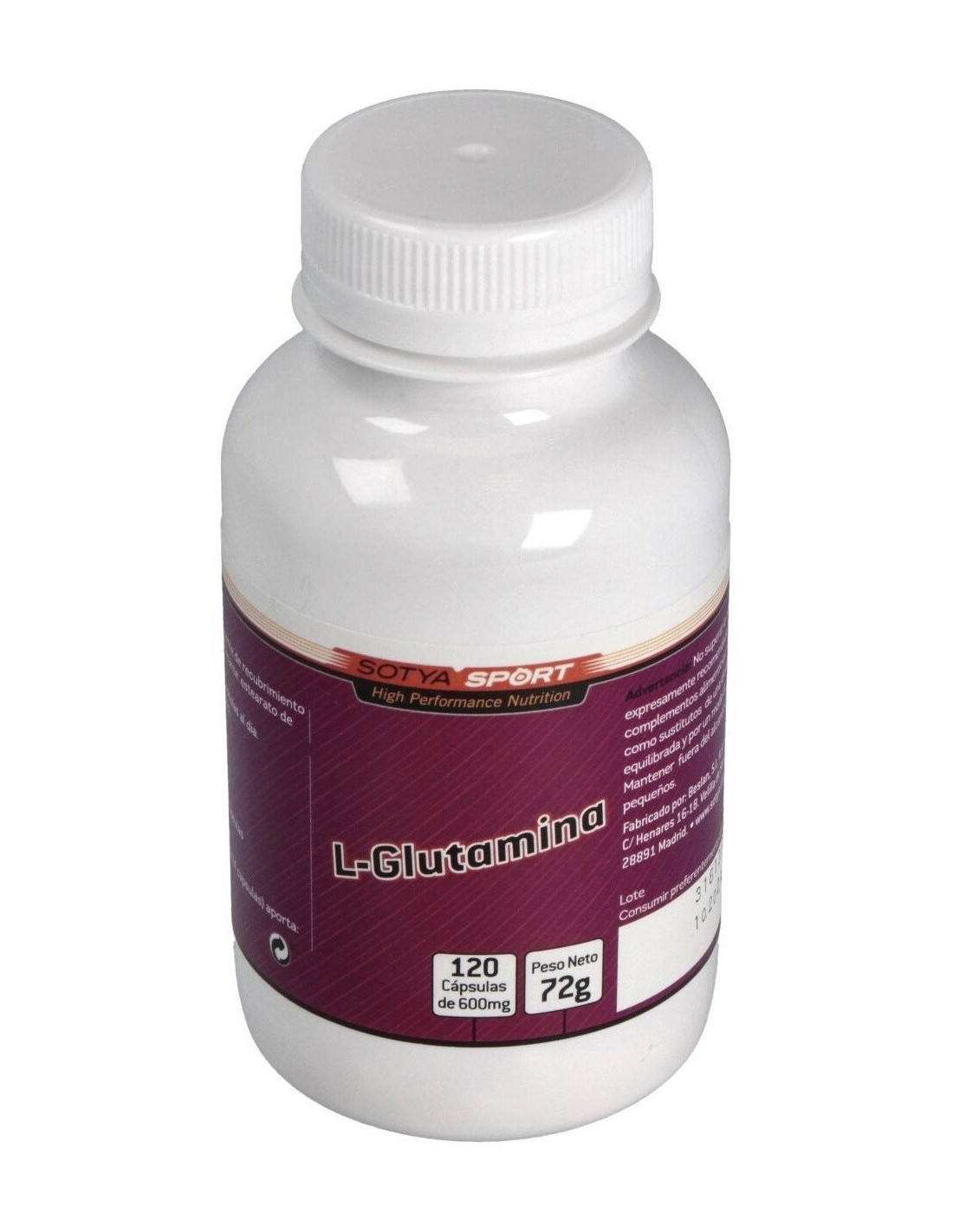 Sotya L-glutamina 600mg es un complemento alimenticio que te ayudará a reforzar y reparar las fibras musculares después de la práctica de deporte o de un ejercicio físico intenso. Ademas, neutralizará el exceso de ácido en los músculos, como el ácido láctico, responsable de la aparición de las molestas """"agujetas"""".
