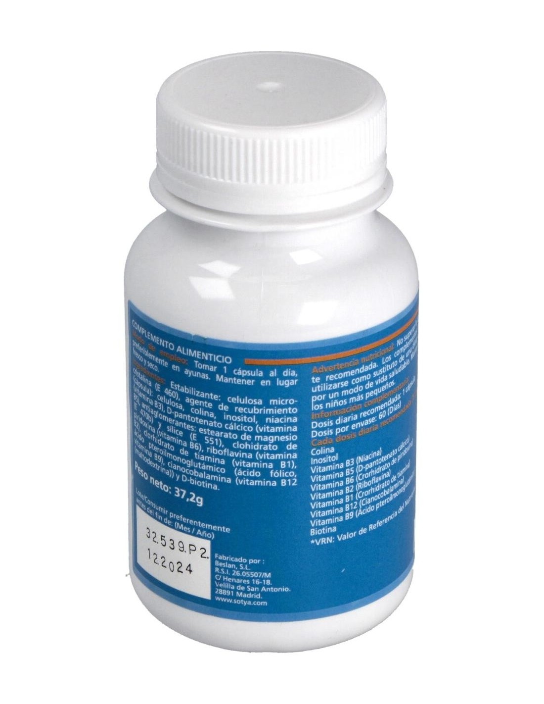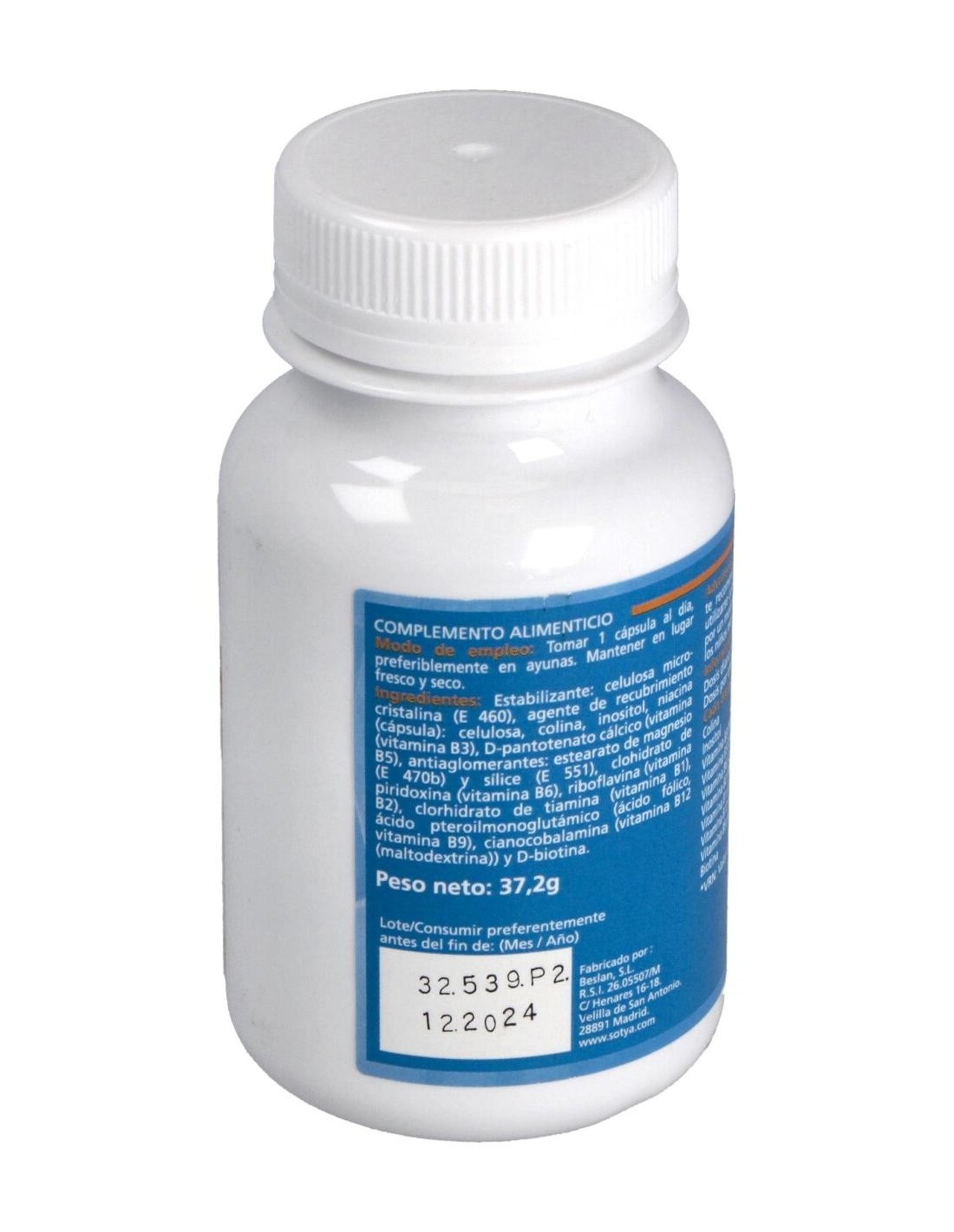 Cada cápsula contiene levadura de cerveza (370mg), colina (50mg), inositol (50mg), vitamina B3 (18mg), vitamina B5 (6mg), vitamina B6 (2mg), vitamina B2 (1.6mg), vitamina B1 (1.4mg), vitamina B9 (0.2mg), vitamina B12 (0.001mg), biotina (0.00015mg). Una cápsula aporta el 100% de la CDR de todas las vitaminas del complejo B.