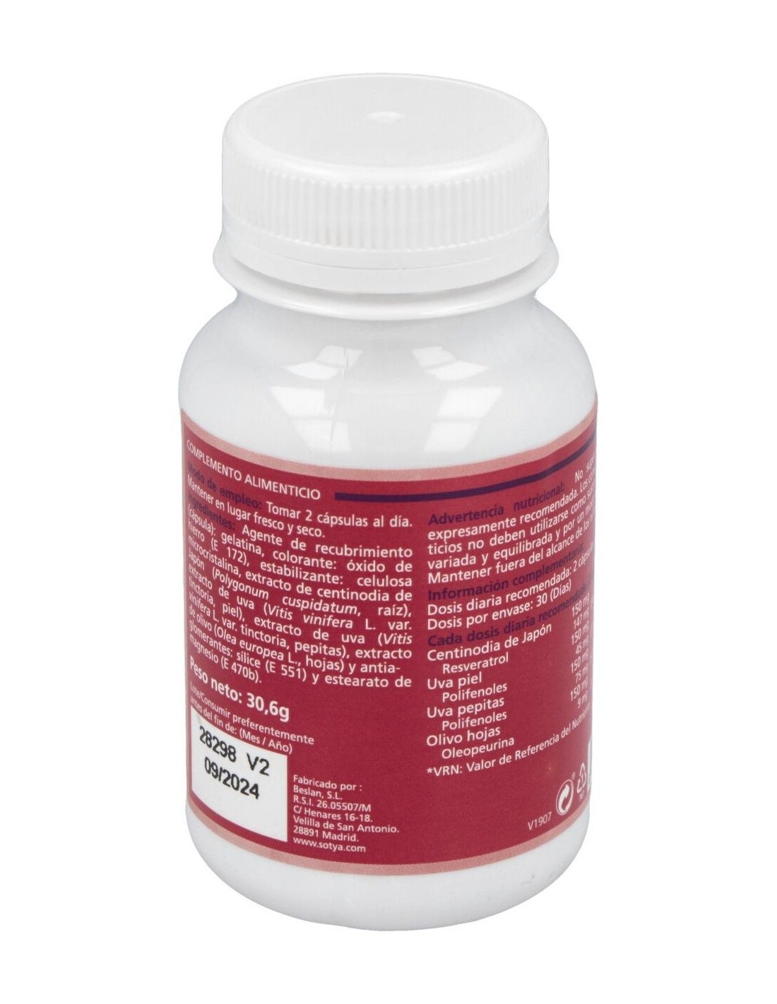 Con efecto astringente, antiséptico y diurético, Sotya Resverasot es un complemento alimenticio con un poder antioxidante excepcional de origen totalmente vegetal y que ayuda principalmente a combatir los radicales libres de nuestro organismo.
