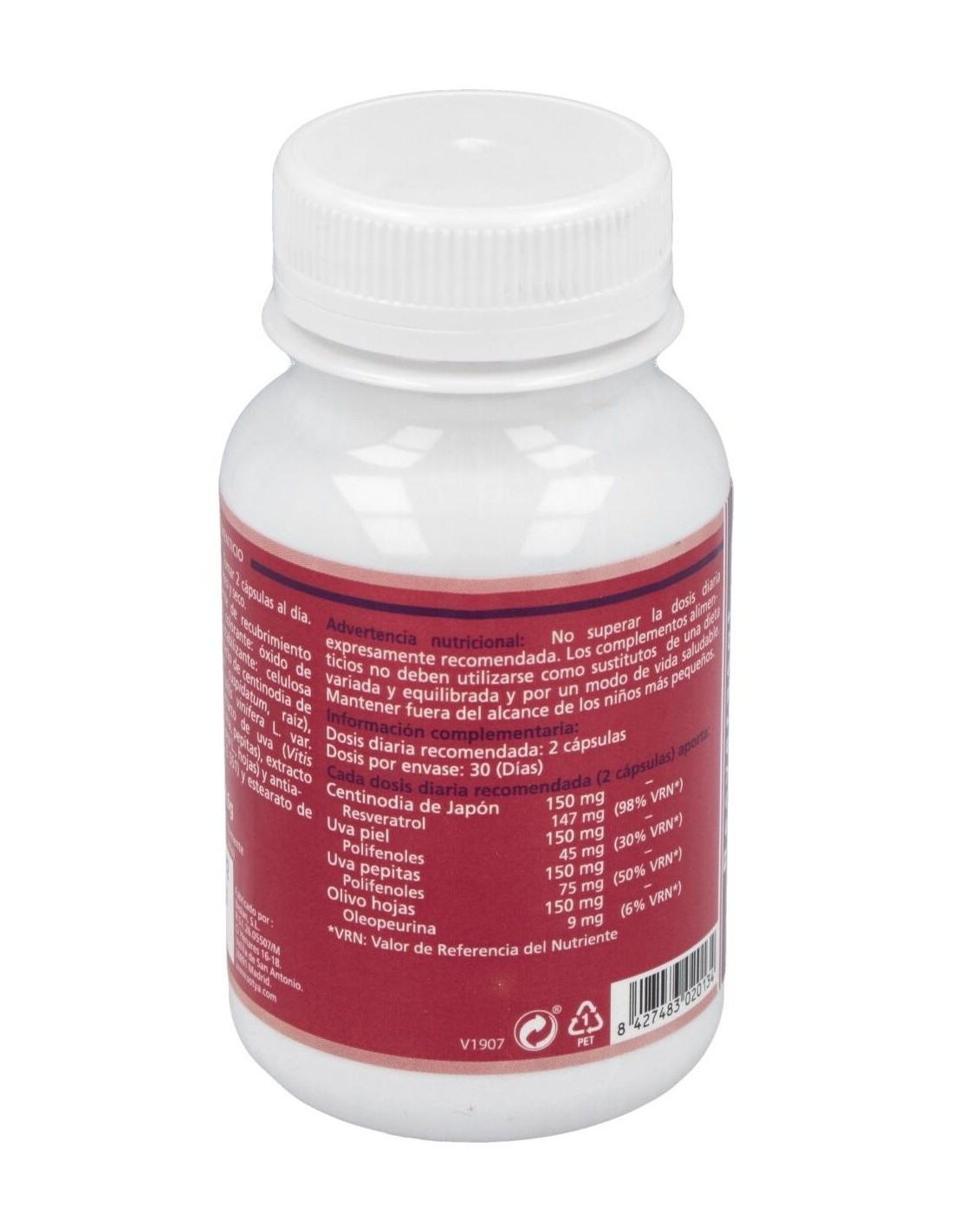 Piel de uva y pepita de uva (vitis vinifera L. var. tinctoria 400mg; 60mg resveratrol y 180mg de polifenoles), oliva (olea europea L. 300mg; 20mg oleopeurina), agente de carga (celulosa microcristalina) y antiaglomerantes (dióxido de silice y estearato de magnesio). Cápsula: celulosa.