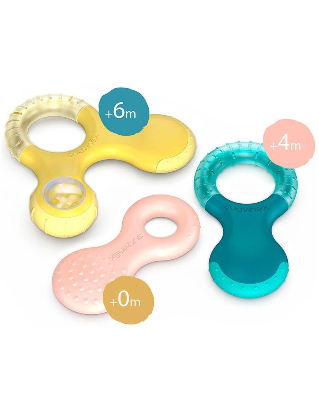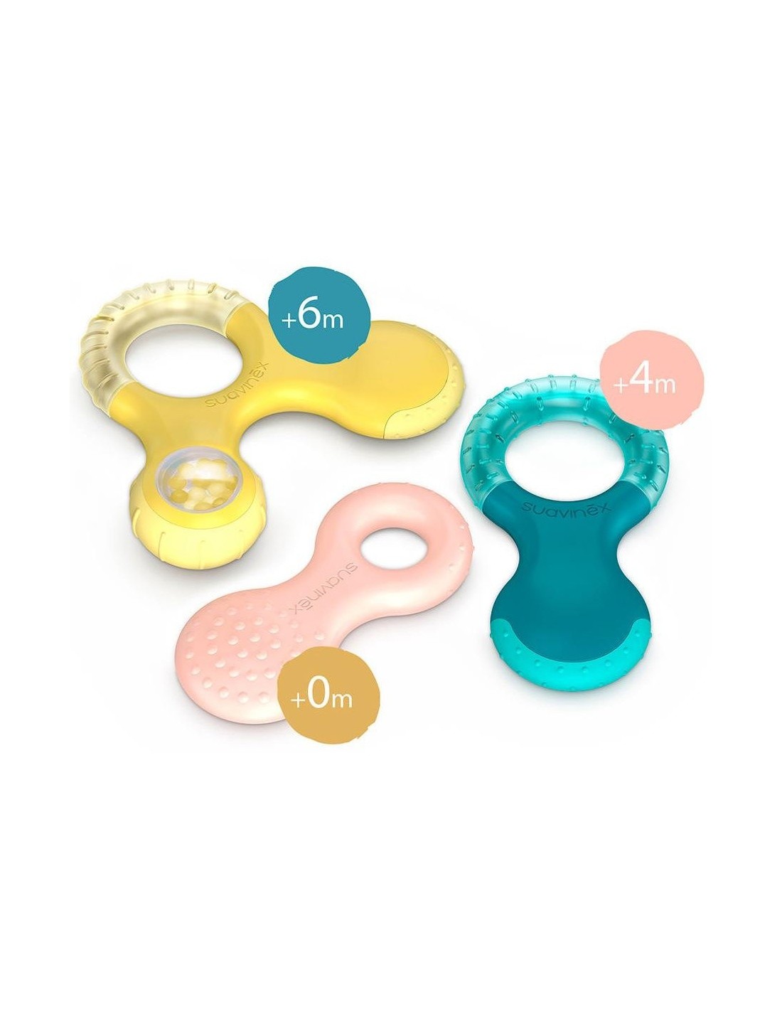 Mordedores seguros, ergonómicos, ligeros y muy divertidos, pensados para cada etapa de la dentición del bebé. Recomendado a partir de 0 meses.