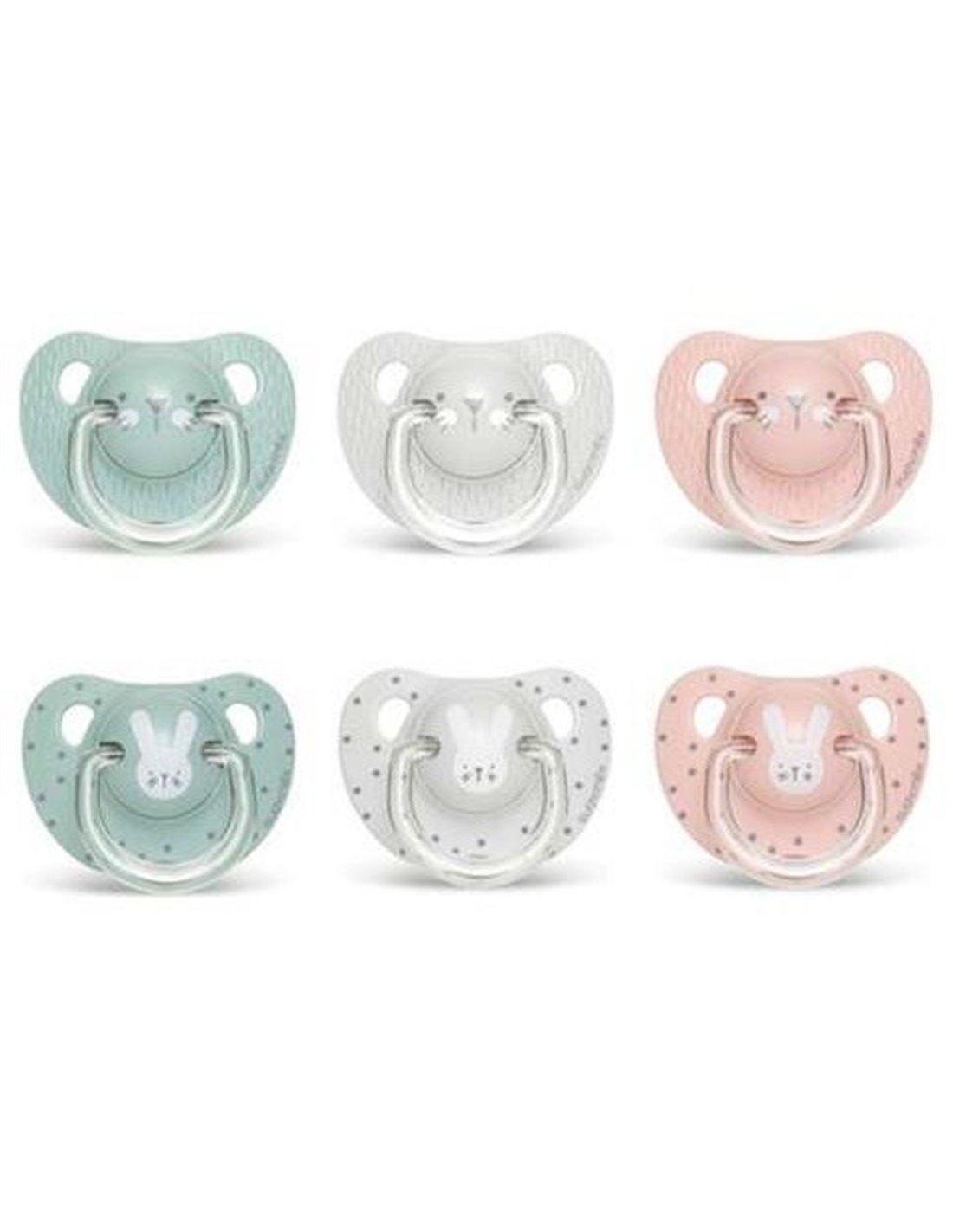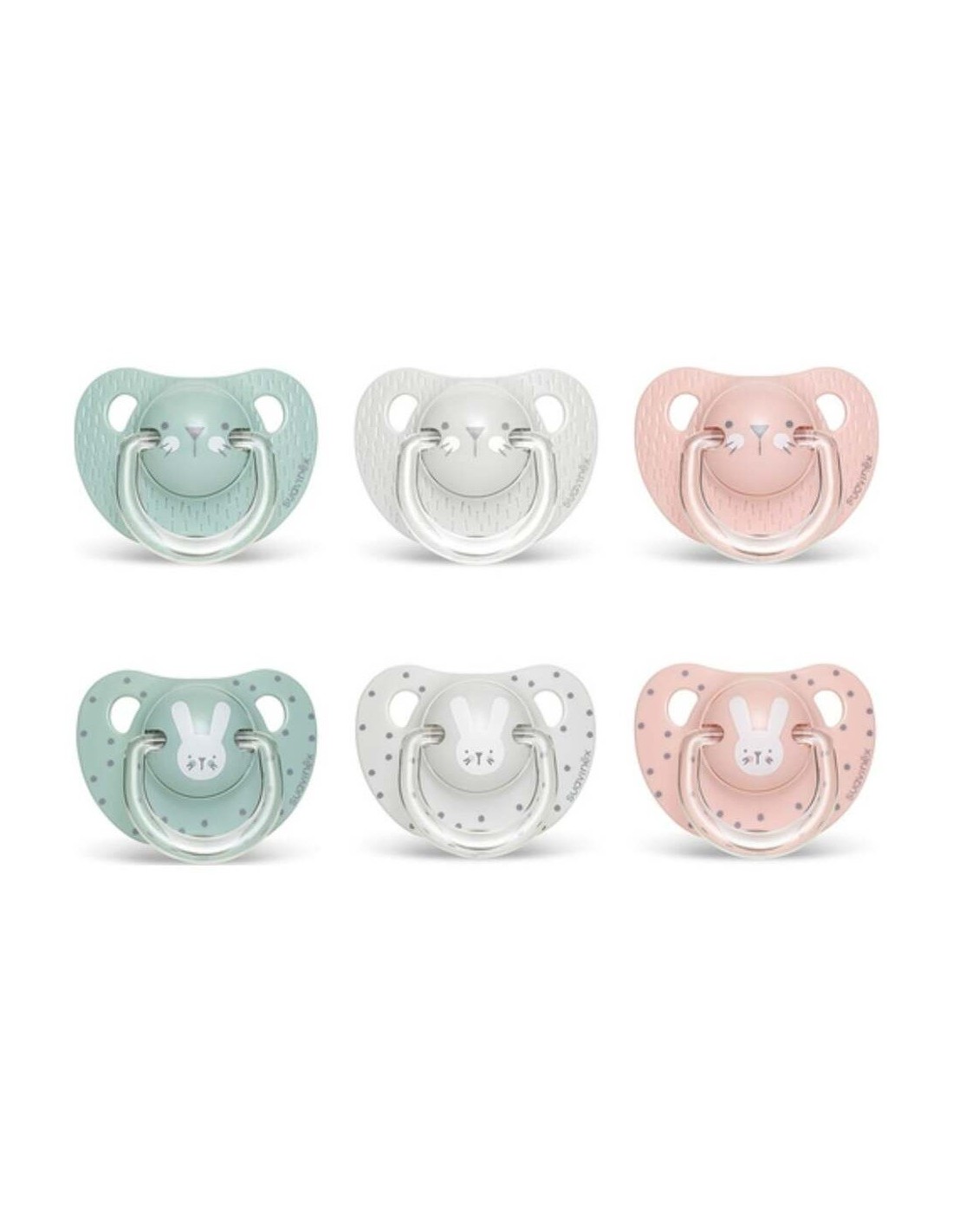 Chupetes de silicona reversible suave con divertidos diseños para bebés mayores a dieciocho meses. Fabricados anatómicamente para brindar una sensación natural y para no introducirse en la boca de manera espontánea. La tetina plana y simétrica del chupete permite un crecimiento y desarrollo de toda la boca del bebé, otorgando más espacio a la lengua y permitiendo el cierre casi completo de la boca. *El color y diseño del producto pueden variar según la disponibilidad.