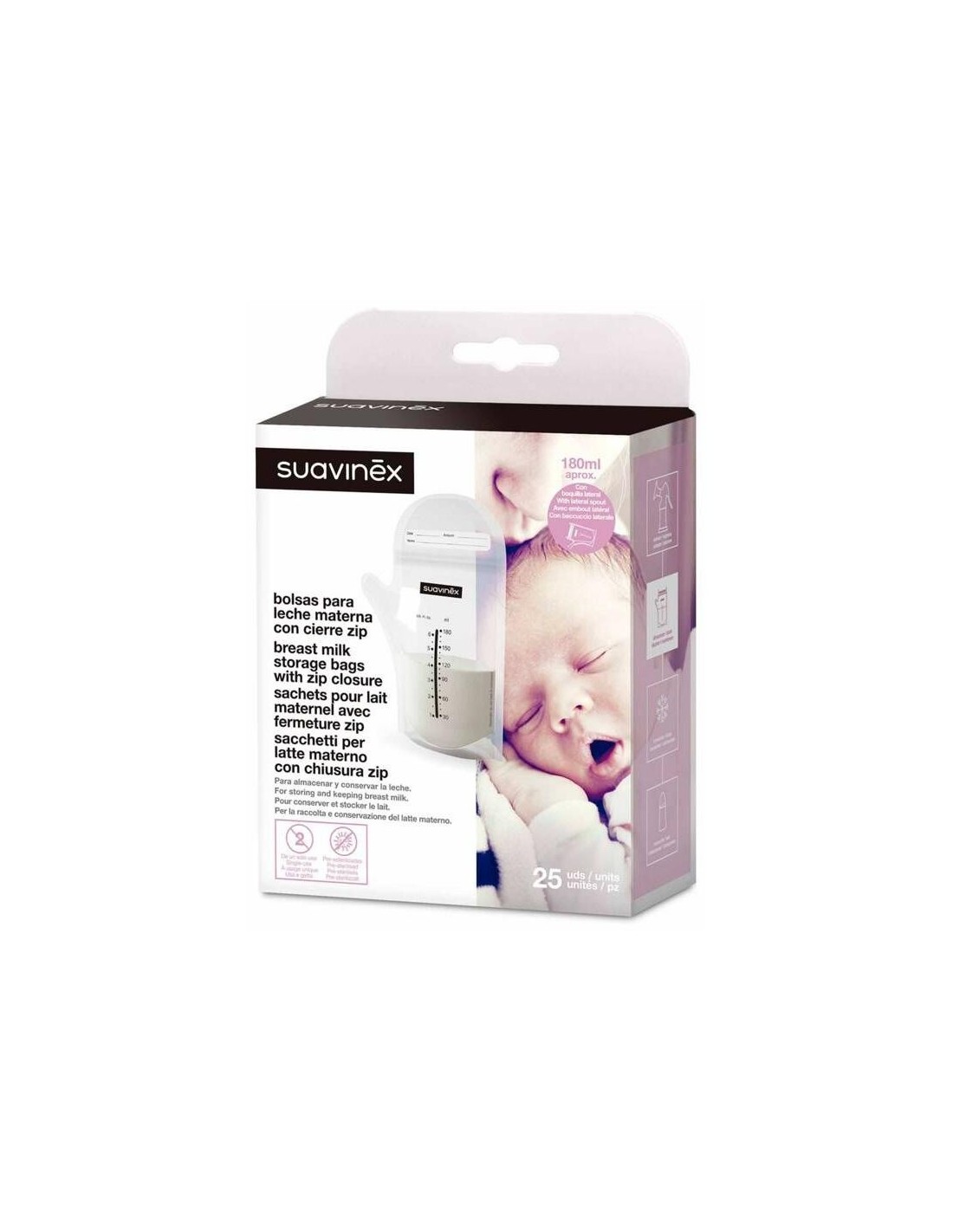 SUAVINEXPack de 25 bolsas de almacenaje para leche materna con cierre de tipo zip, con capacidad de 180ml. Las bolsas de almacenaje permiten que la leche materna recién extraída se conserve de forma hermética en el frigorífico o en el congelador y esté lista para usarse cuando se necesite. Su cierre de zip permite que se pueda abrir y cerrar con facilidad al tiempo que evita las fugas. Compatibles con los calientabiberones específicos que permiten calentar bolsas de leche materna. Desechables y pre-esteirlizadas. Formato apilable para que ocupen poco espacio en la nevera o en el congelador.