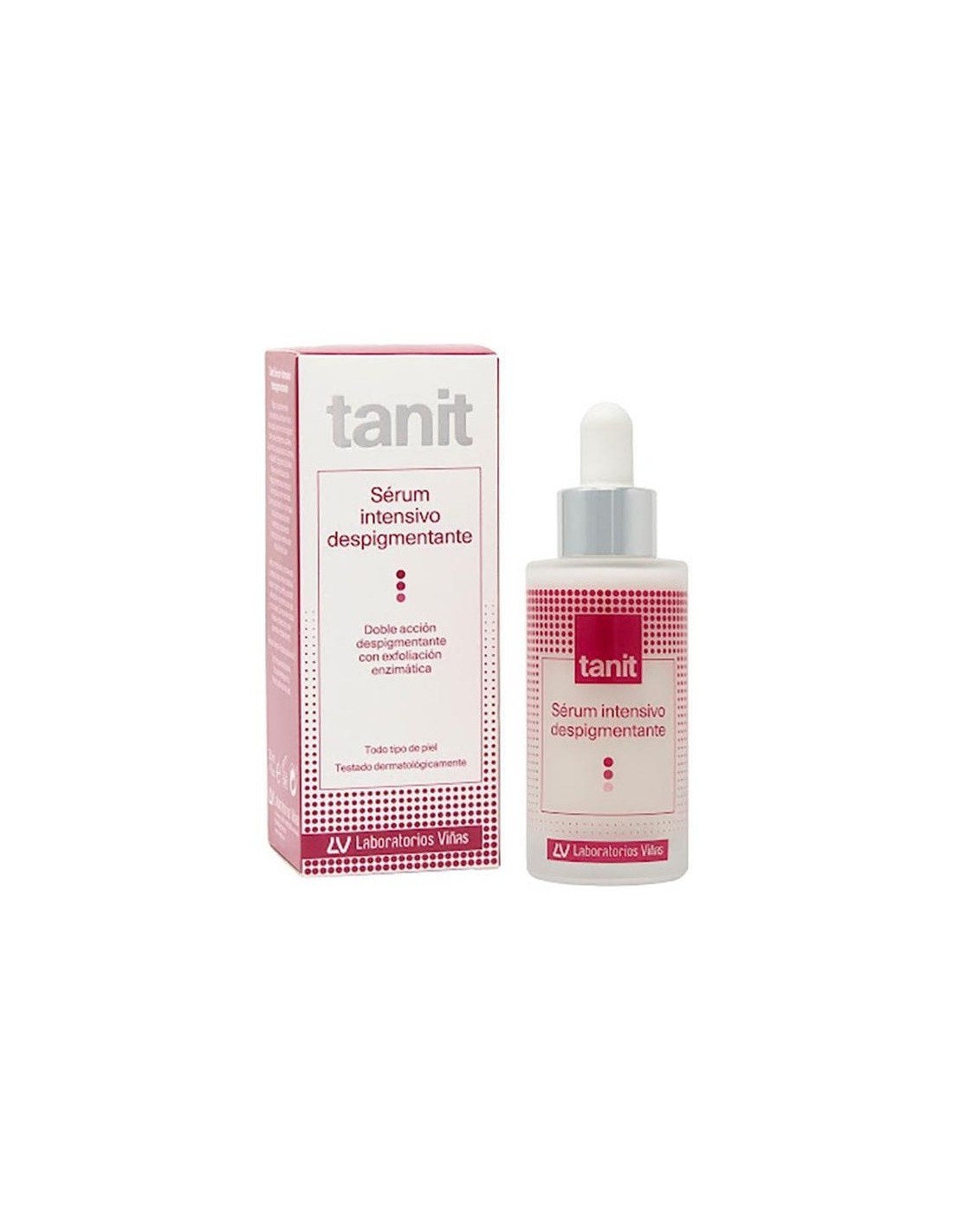 El laboratorio Viña ha desarrollado Tanit sérum intensivo despigmentante. Este suero intensivo está formulado para regular el proceso de melanogénesis, gracias a la Curcumina y el AlbaB2 Enzymatic Blocker, actuando sobre las manchas e irregularidades reduciendolas, unificando el tono de la piel del rostro y previniendo los signos del envejecimiento cutáneo.