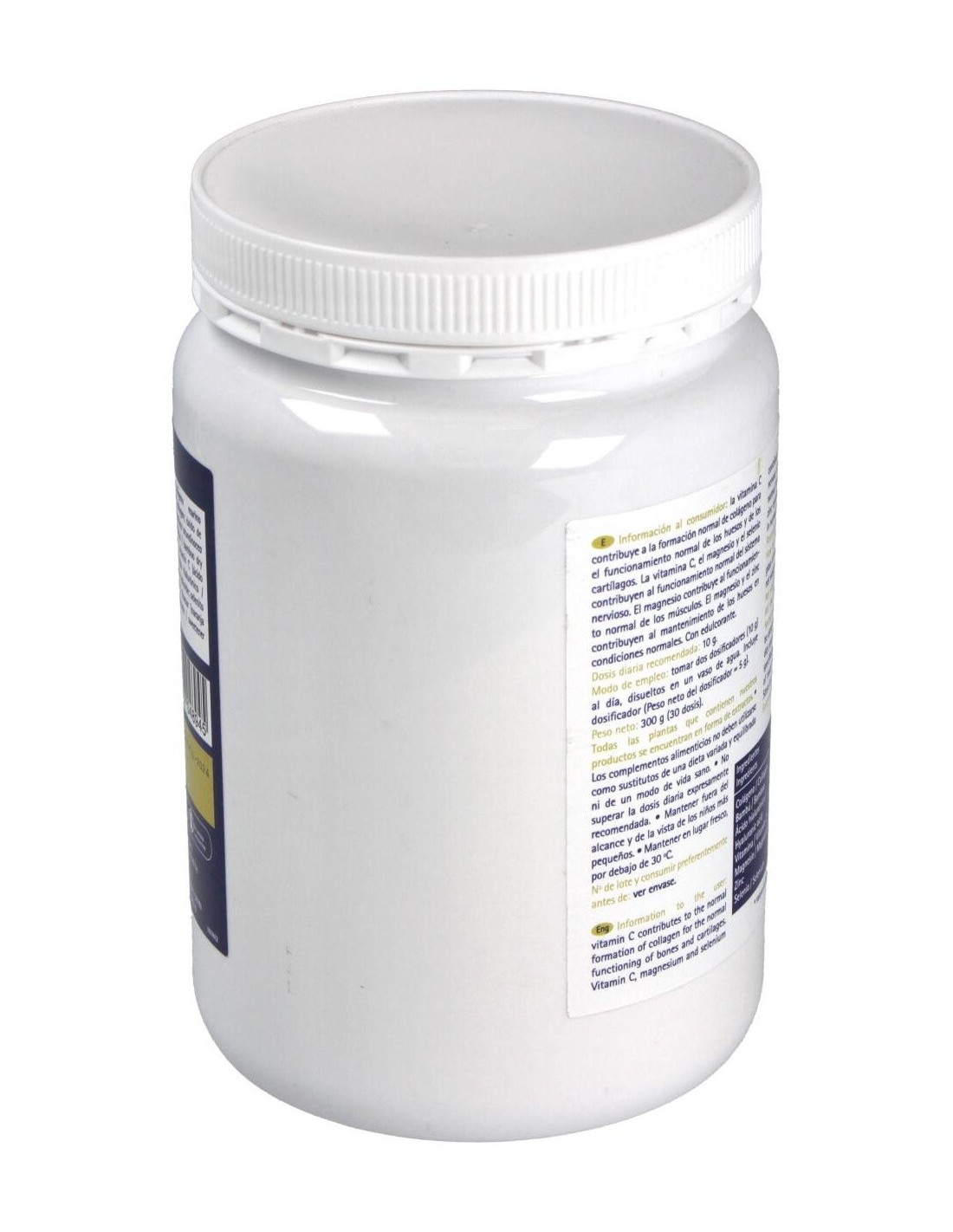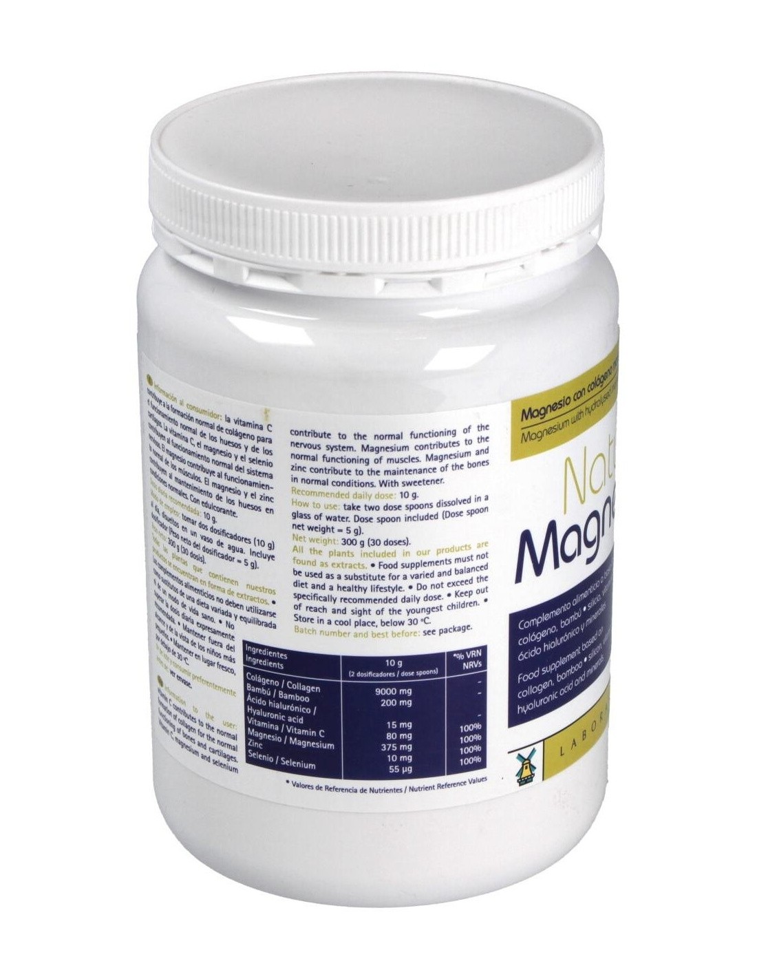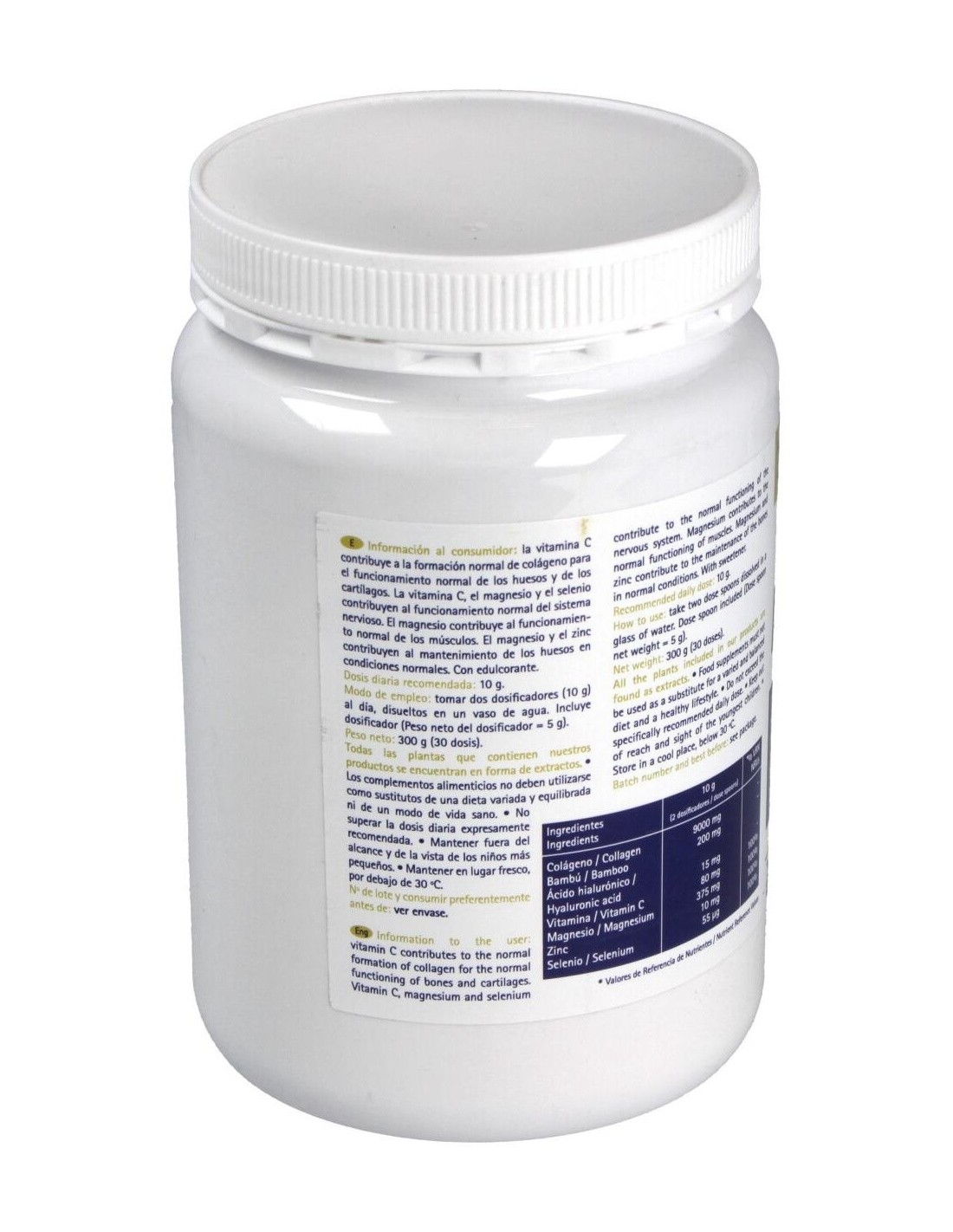 Colágeno hidrolizado, 9 g: óxido de magnesio, 622 mg: bambú (Bambusa arundinacea Retz. (Will) extracto seco, 75% silicio, 200 mg: vitamina C, 80 mg: ácido hialurónico, 15 mg: óxido de zinc, 375 mg: selenito sódico, 4 mg.