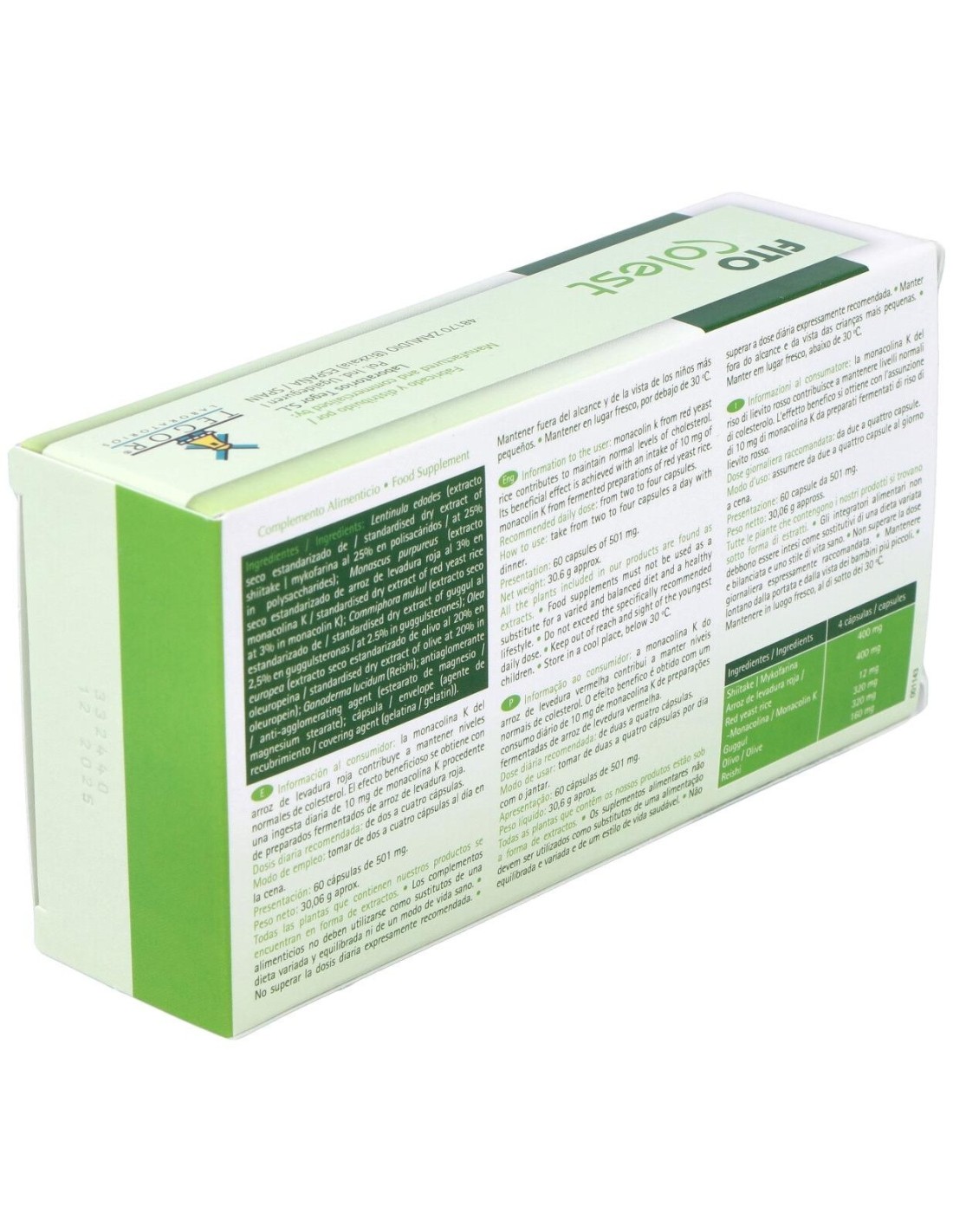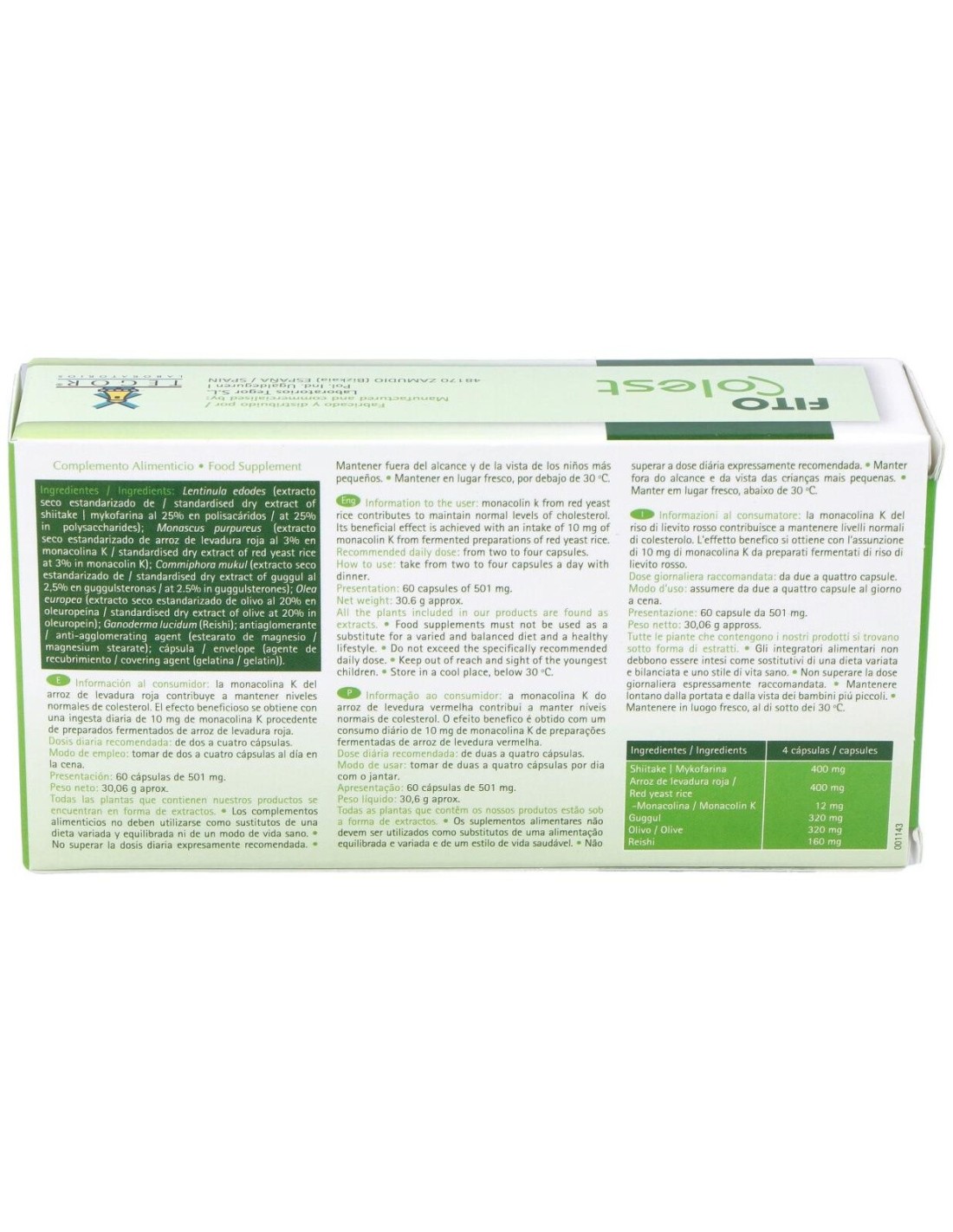Lentinus edodes (mykofarina), 100 mg: Monascus purpureus (levadura de arroz rojo), 100 mg: Commiphora mukul (guggul), 80 mg: Olea europaea, (olivo), 80 mg: Ganoderma lucidum (reishi), 40 mg.