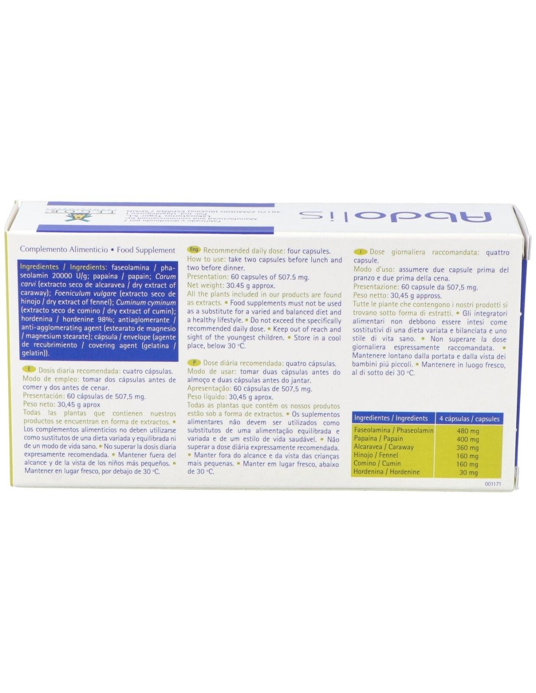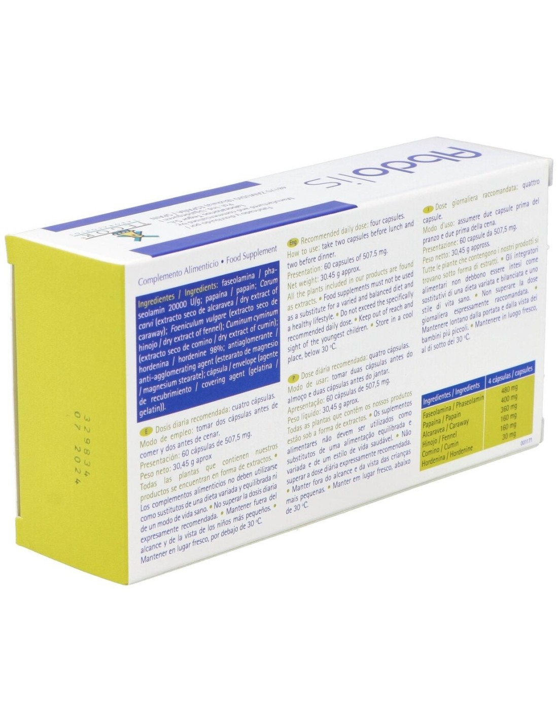 Faseolamina, 120 mg: papaína, 100 mg: Carum carvi (alcaravea), 90 mg: Foeniculum vulgare (hinojo), 40 mg: Cuminum cyminum (comino), 40 mg: hordenina 98%, 7,5 mg.