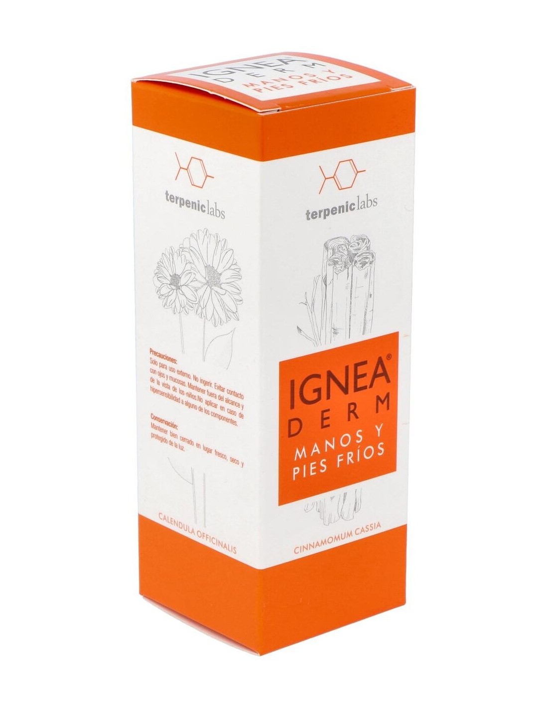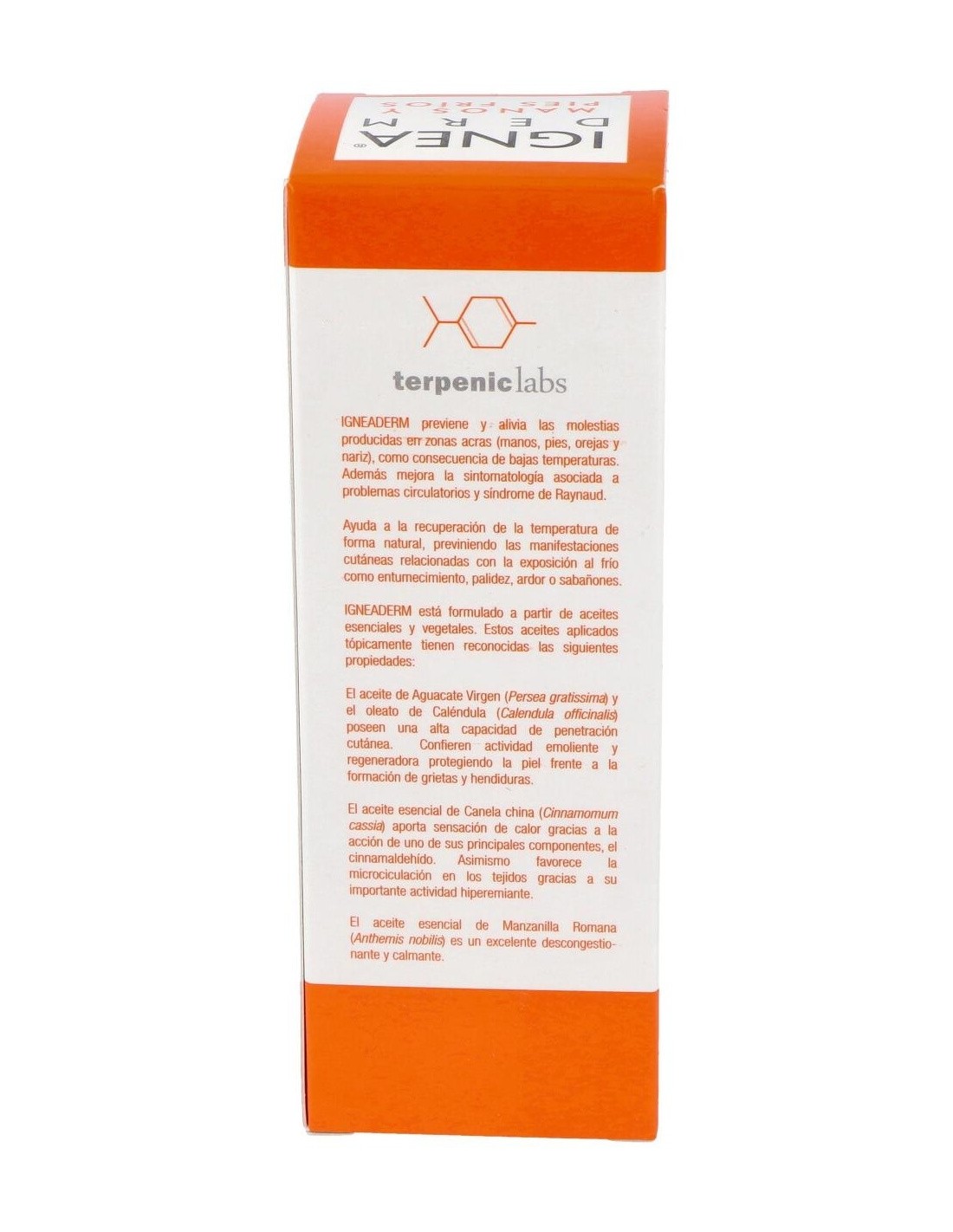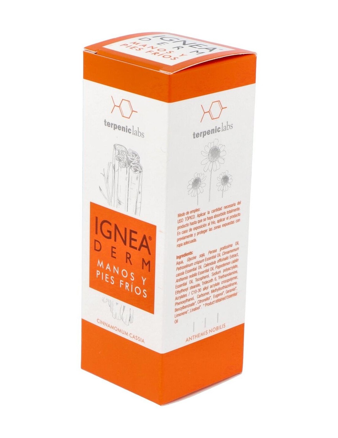 Terpenic Ignea Derm crema de manos y pies fríos 50ml es una crema hidratante que reduce las molestias producidas por las bajas temperaturas, tanto en manos y pies como en otras zonas del cuerpo, como nariz y orejas. Elaborada con ingredientes 100% naturales: aceite vegetal de aguacate virgen, oleato de caléndula, aceite esencial de corteza de canela y aceite esencial de manzanilla romana. Indicada para sabañones, ardor, entumecimiento, calambres y palidez.