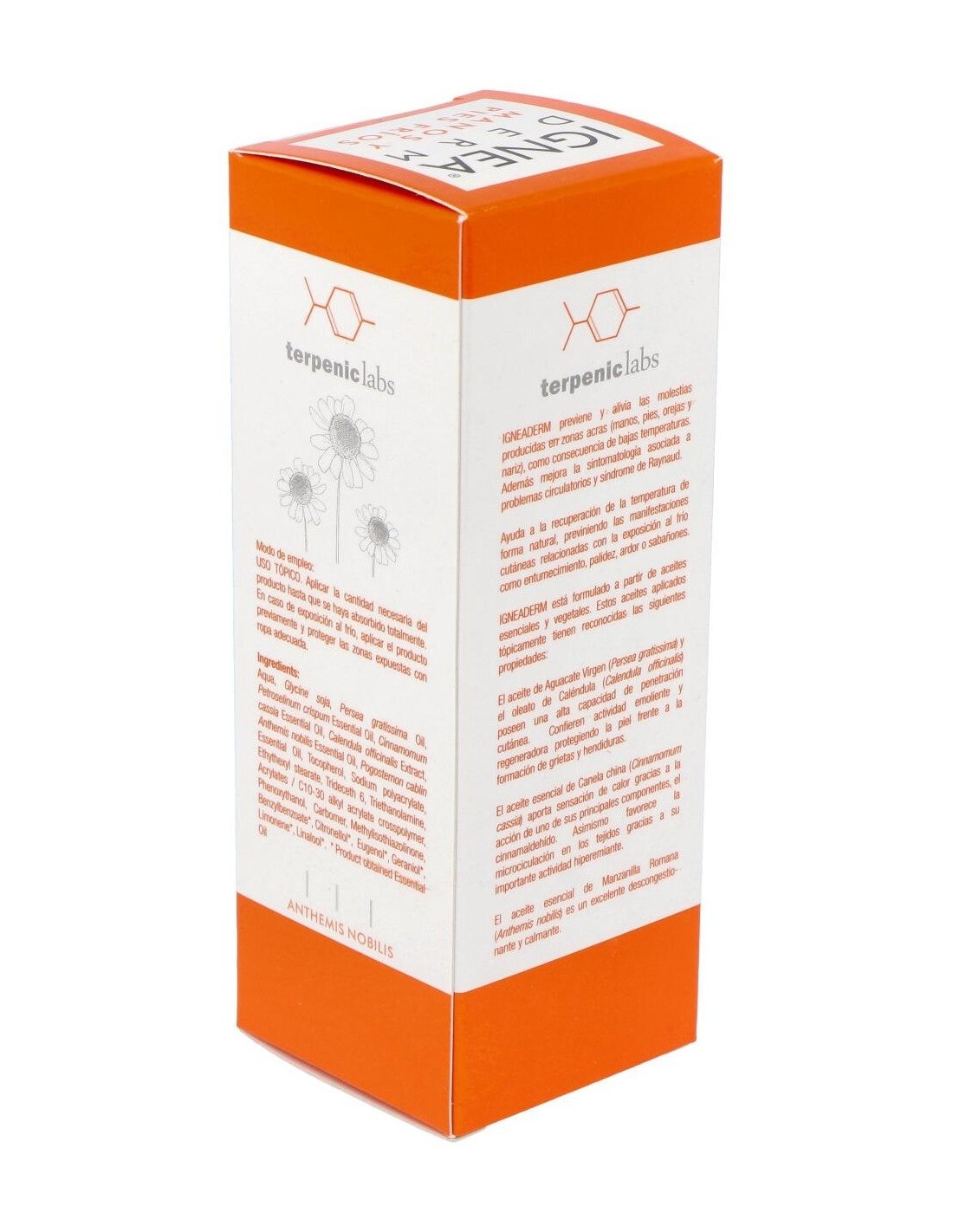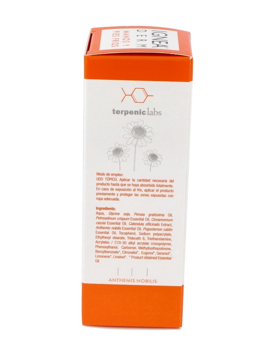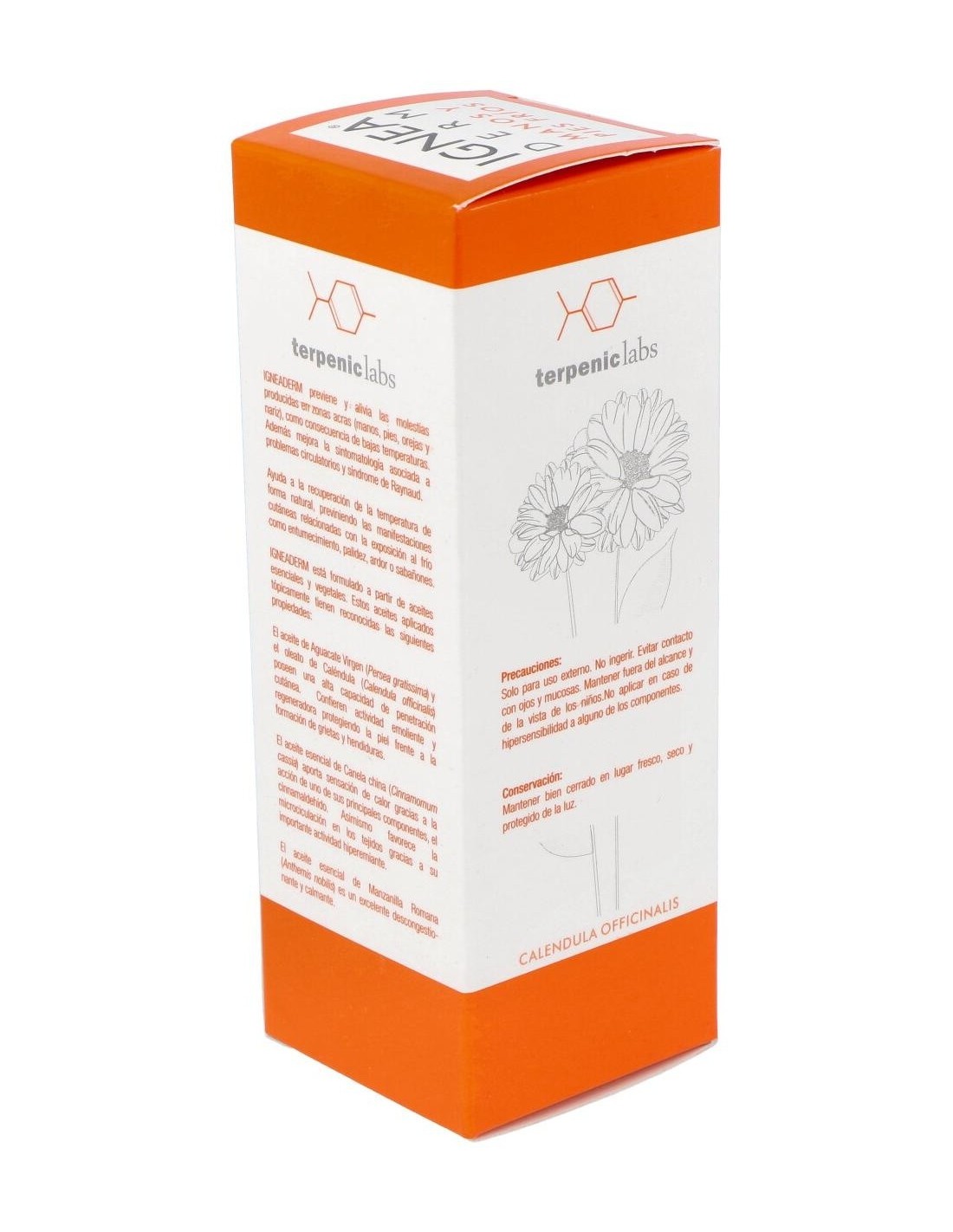 Terpenic Ignea Derm crema de manos y pies fríos 50ml es una crema hidratante que reduce las molestias producidas por las bajas temperaturas, tanto en manos y pies como en otras zonas del cuerpo, como nariz y orejas. Elaborada con ingredientes 100% naturales: aceite vegetal de aguacate virgen, oleato de caléndula, aceite esencial de corteza de canela y aceite esencial de manzanilla romana. Indicada para sabañones, ardor, entumecimiento, calambres y palidez.