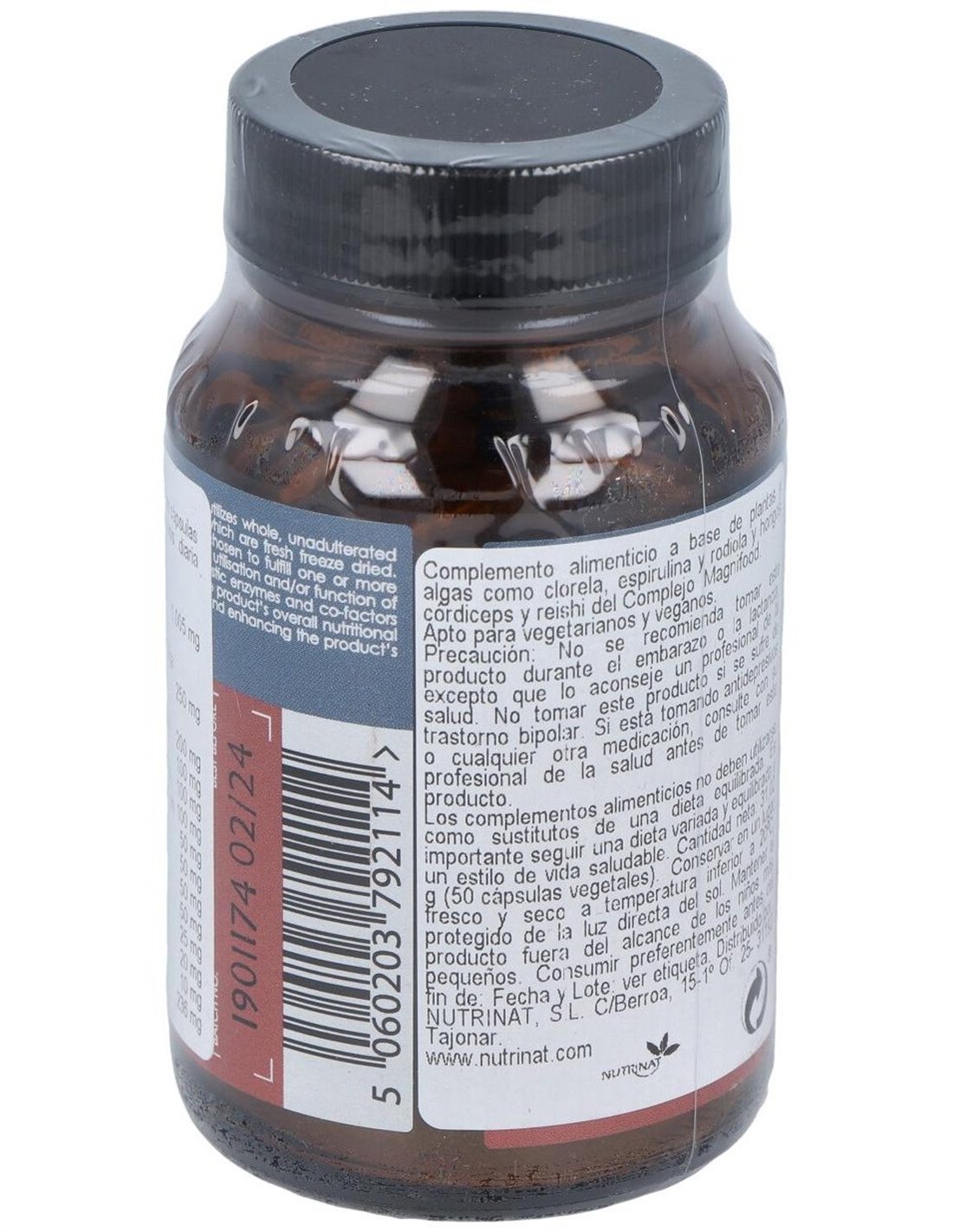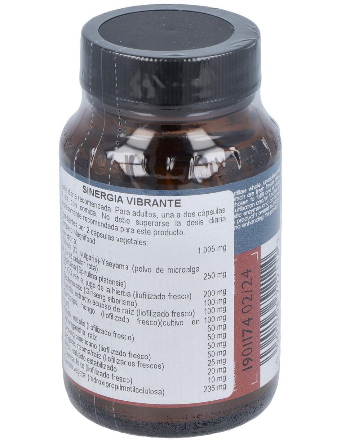 Complejo Magnifood 1.005mg. Que aporta: Chlorella (polvo de microalga de pared celular rota) 250mg, Espirulina 200mg, Cebada verde, hierba (liofilizada fresca) 100mg, Eleuterococo (ginseng siberiano), raíz 100mg, Rodiola, raíz (liofilizada fresca) 100mg, Cordiceps (liofilizado fresco, cultivado en arroz) 50mg, Reishi, micelio (liofilizado fresco) 50mg, Ashwagandha, raíz 50mg, Ginseng americano, raíz (liofilizado fresco) 50mg, Jengibre, rizoma/raíz (liofilizado fresco) 25mg, Arroz, salvado de arroz 20mg, Cayena, fruto (liofilizado fresco) 10mg. Otros componentes: Metilcelulosa (cápsula vegetal).