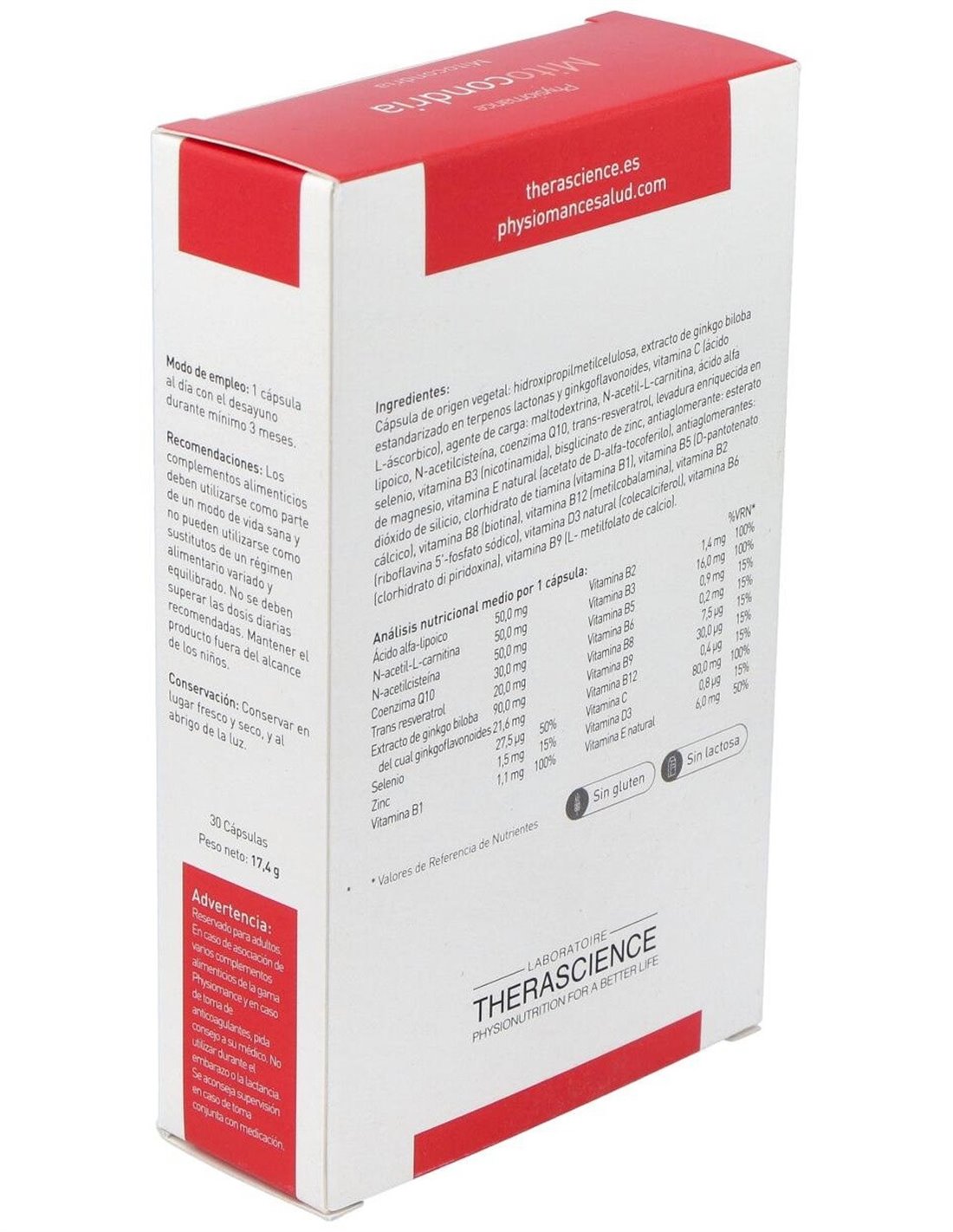 Cápsula de origen vegetal: hidroxipropilmetilcelulosa, extracto de ginkgo biloba estandarizado en terpenos lactonas y ginkgoflavonoides, vitamina C (ácido L áscorbico), agente de carga: maltodextrina, N-acetil-L-carnitina, ácido alfa lipoico, N-acetilcisteína, coenzima Q10, trans-resveratrol, levadura enriquecida en selenio, vitamina B3 (nicotinamida), bisglicinato de zinc, antiaglomerante: esterato de magnesio, vitamina E natural (acetato de D-alfa-tocoferilo), antiaglomerantes: dióxido de silicio, clorhidrato de tiamina (vitamina B1), vitamina B5 (D-pantotenato cálcico), vitamina B8 (biotina), vitamina B12 (metilcobalamina), vitamina B2 (riboflavina 5´-fosfato sódico), vitamina D3 natural (colecalciferol), vitamina B6 (clorhidrato di piridoxina), vitamina B9 (L- metilfolato de calcio).