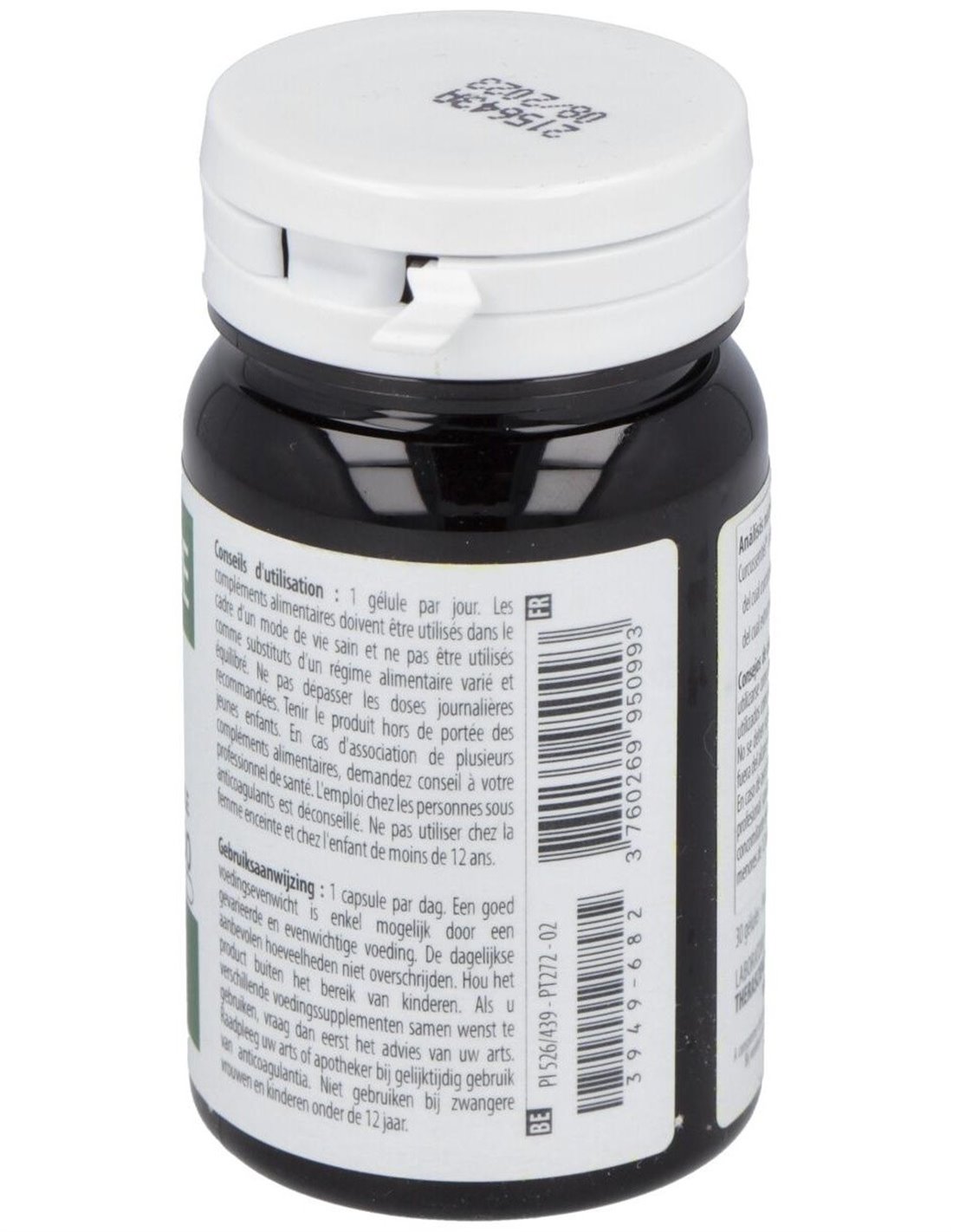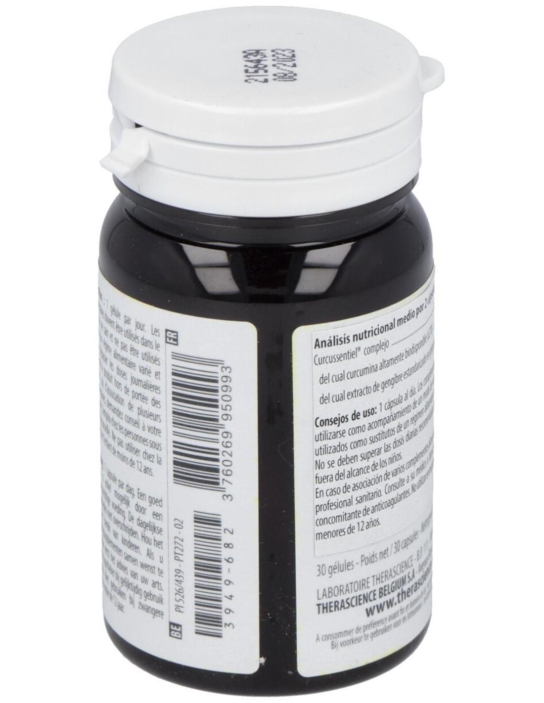 Curcussentiel® complejo (extracto seco de raíz de Curcuma longa L. encapsulado por fibras de galactomanano de fenogreco, extracto de raíz de jengibre estandarizado en gingeroles), cápsula de origen vegetal: hidroxipropilmetilcelulosa.