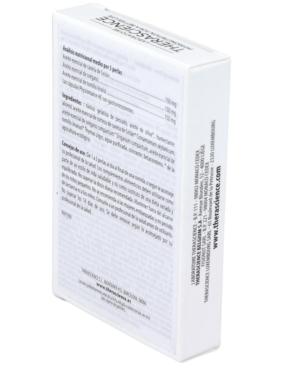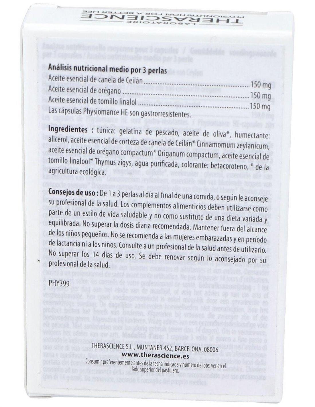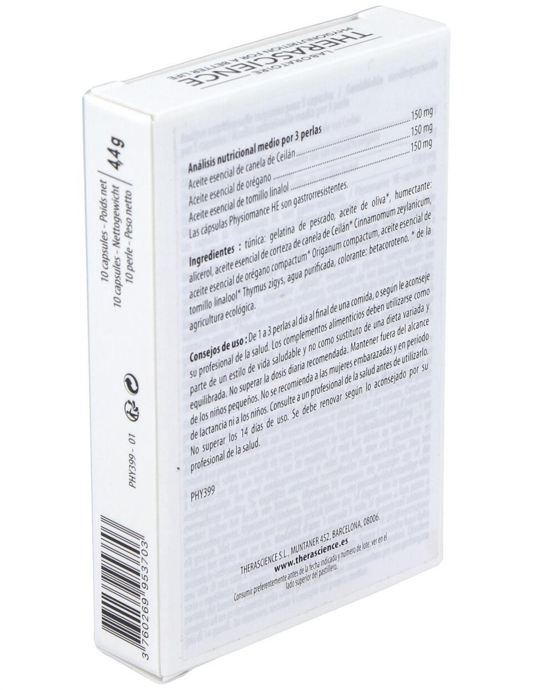 Cobertura: gelatina de pescado, aceite de oliva, humectante: glicerol, canela de Ceilán, aceite esencial de corteza de Cinnamomum zeylanicum, orégano compacto, aceite esencial de cabezuelas de Origanum compactum, aceite esencial de tomillo, linalol, flor de Thymus zigys, agua purificada, colorante: betacaroteno.