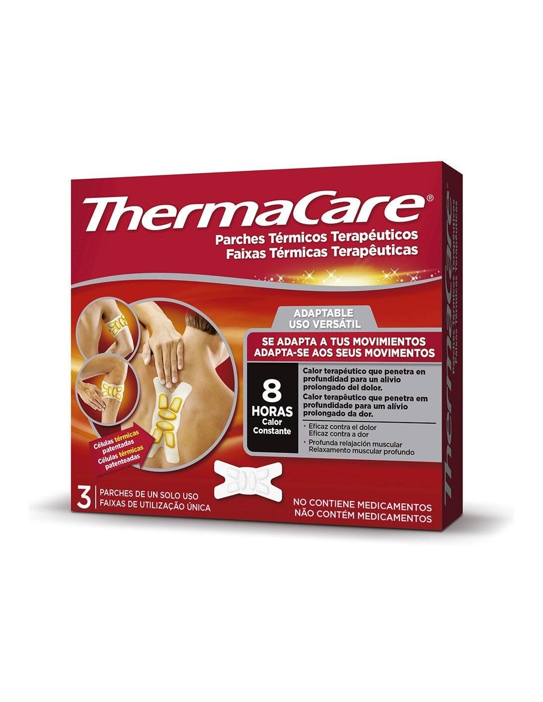THERMACAREThermaCare® Adaptable es adecuado para tratar el dolor muscular y articular localizado. Los parches, agradables para la piel y con 6 células de calor patentadas, se pueden usar de forma flexible y se adhieren a la piel a través de cuatro puntos adhesivos. 8 horas de calor terapéutico profundo. No solo se puede usar en la parte superior de la espalda, sino que también es adecuado en los brazos o las piernas.