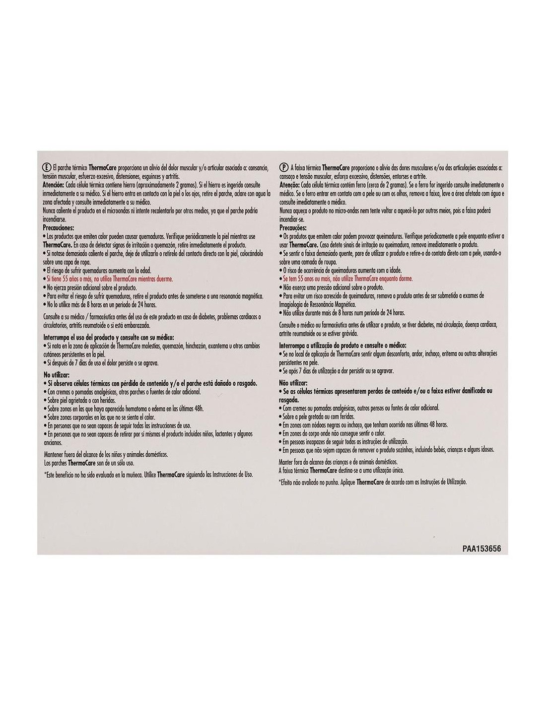 THERMACAREThermaCare® cuello, hombros y muñecas está indicado para tratar el dolor muscular y articular inespecífico en las zonas del cuello, los hombros y las muñecas. Los parches están constituidos por 10 células de calor patentadas y tienen una forma ergonómica para adherirse perfectamente a la piel a través de dos zonas adhesivas. Proporciona alivio prolongaodo durante 16 horas. Esto es, 8 horas mientras se lleva puesto y 8 horas adicionales después de quitárselo.