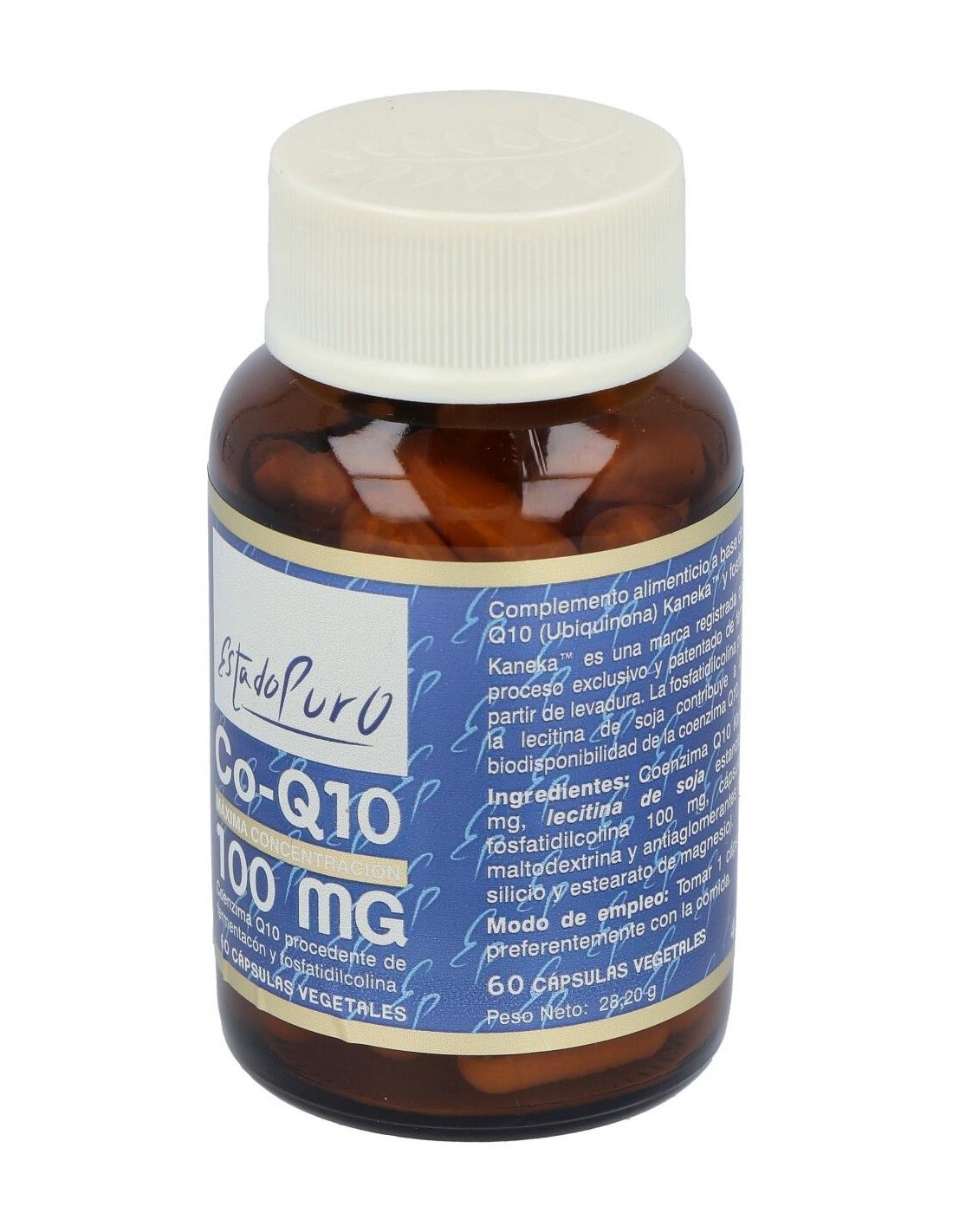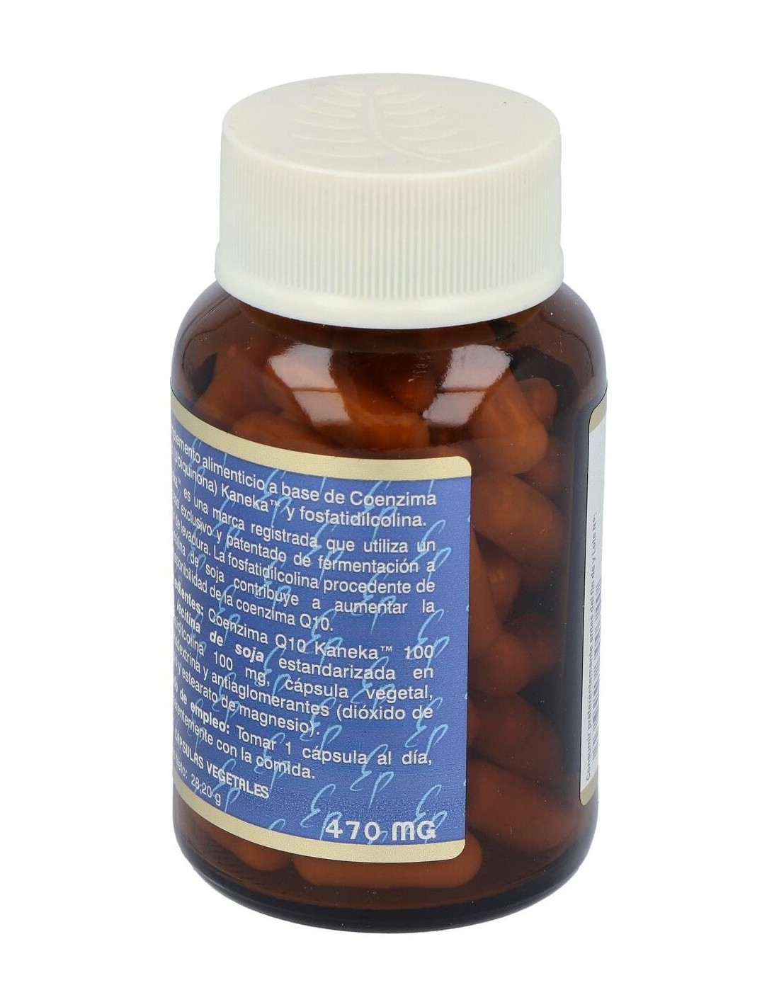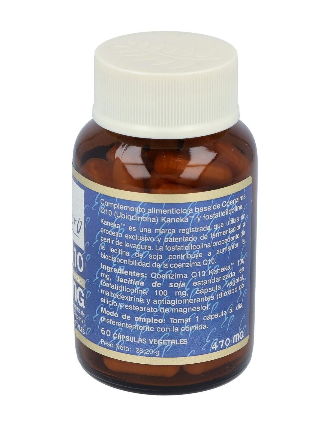 Coenzima Q10 Kaneka, Lecitina de Soja estandarizada en fosfatidilcolina. Cápsula vegetal, antiaglomerante (dióxido de silicio) y diluyentes (maltodextrina y estearato de magnesio).