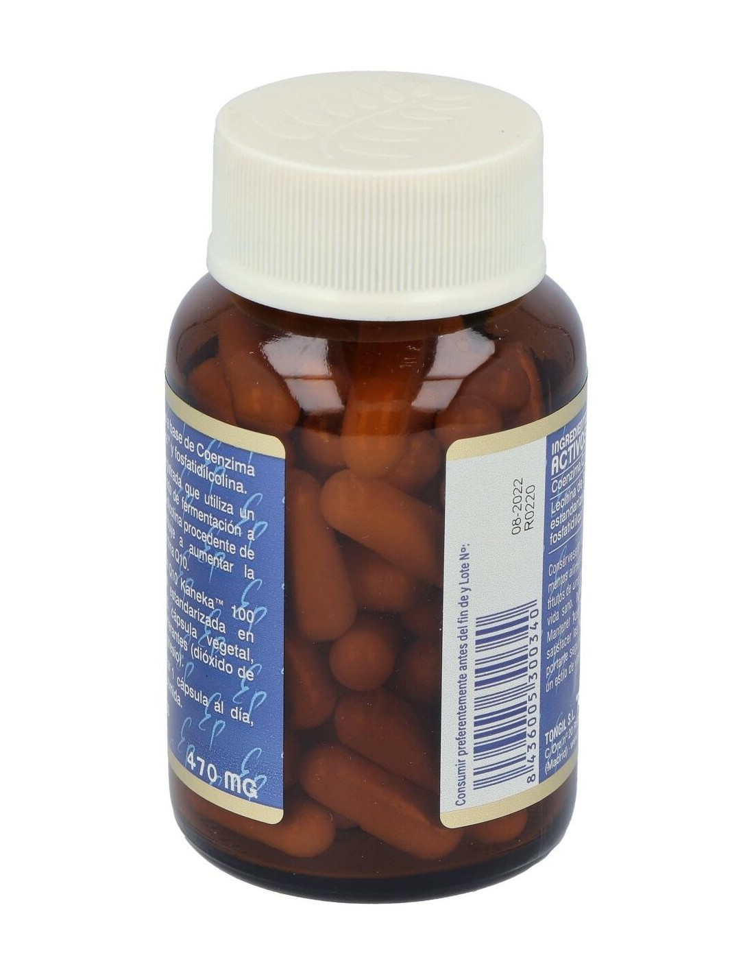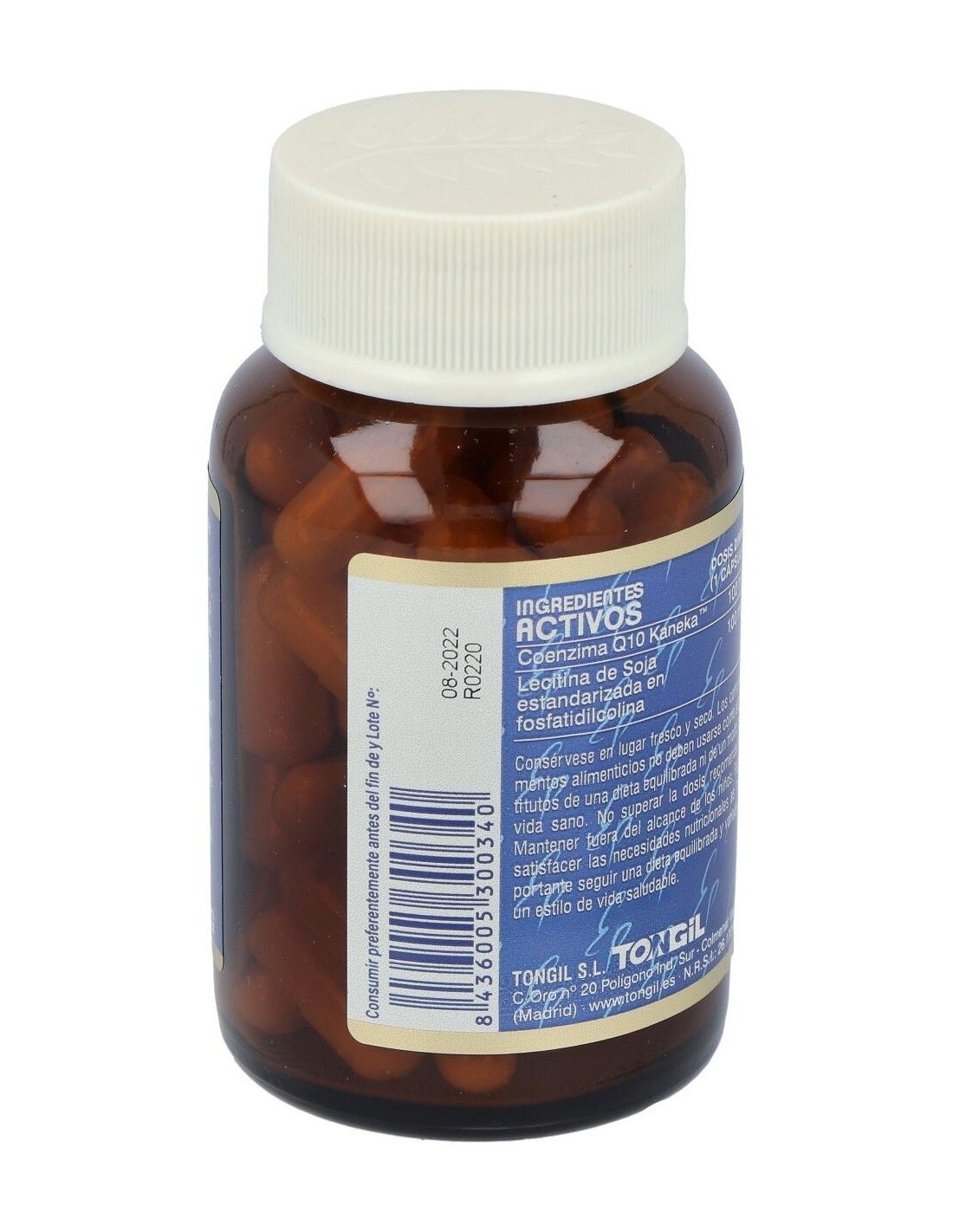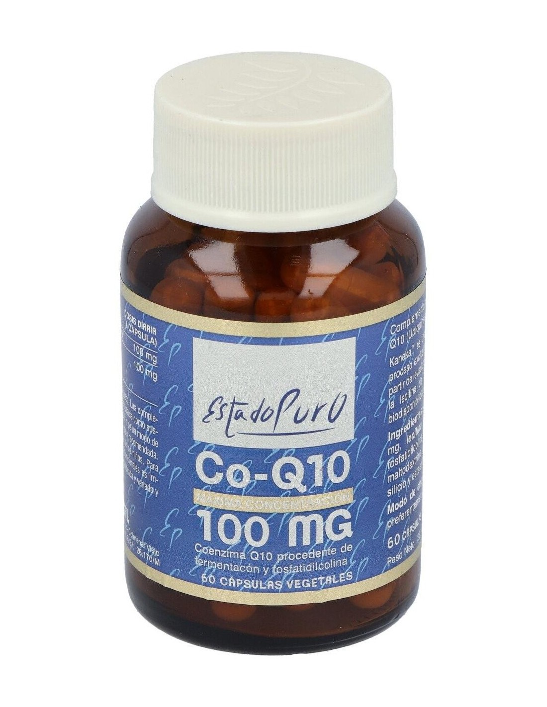Coenzima Q10 Kaneka, Lecitina de Soja estandarizada en fosfatidilcolina. Cápsula vegetal, antiaglomerante (dióxido de silicio) y diluyentes (maltodextrina y estearato de magnesio).
