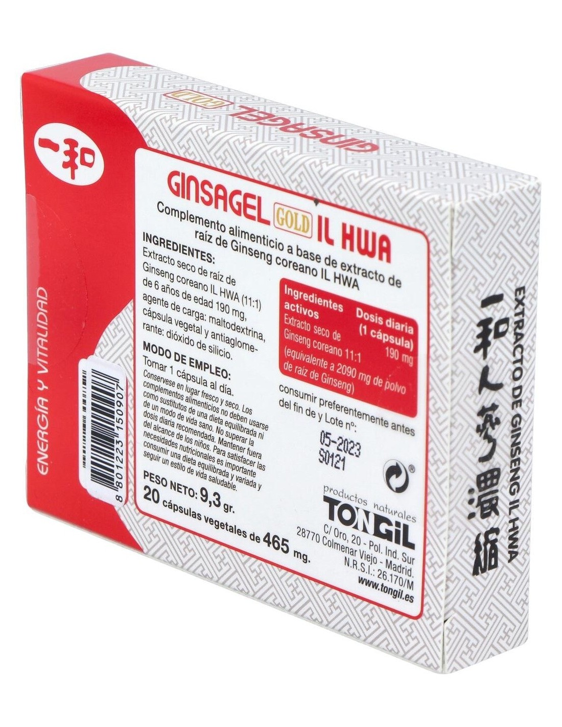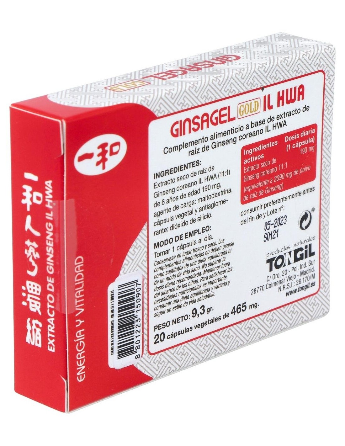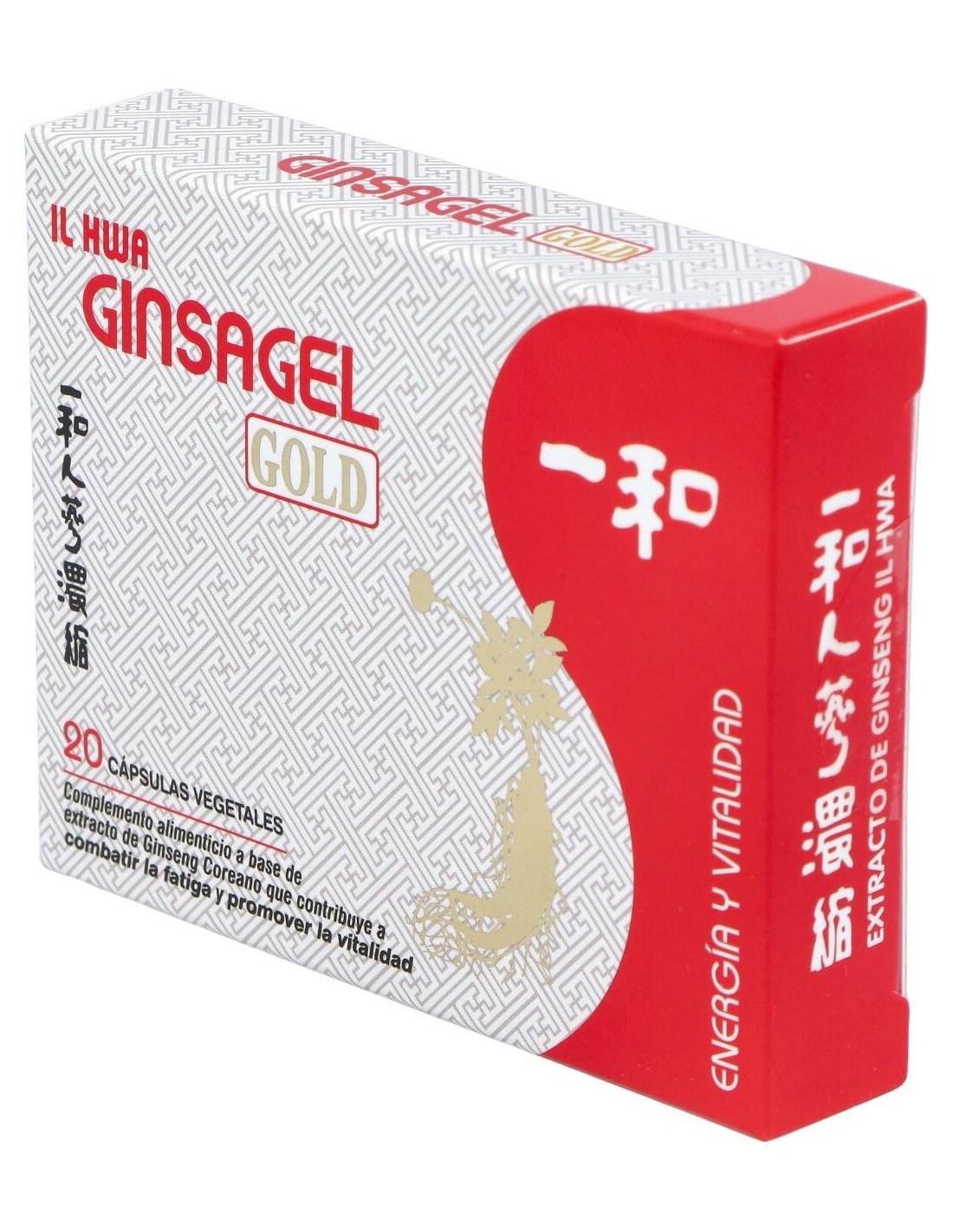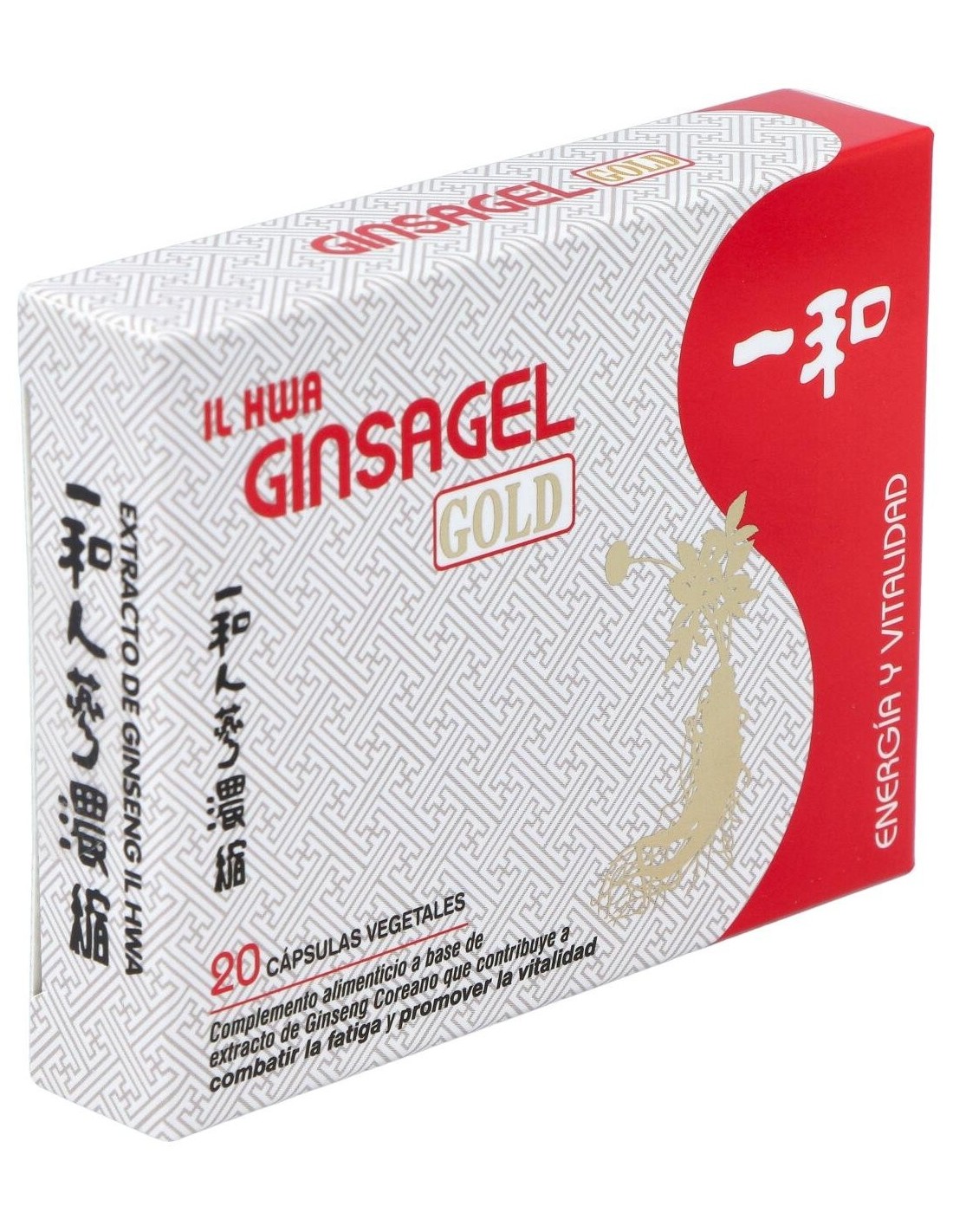 Extracto de Ginseng Coreano IL HWA 11:1(extracto seco 11:1 de raíz entera de Ginseng coreano IL HWA (Panax ginseng C.A Meyer) de 6 años de edad)................190 mg(equivalente a 2090 mg de polvo de raíz), agente de carga (maltodextrina), y antiaglomerante (dióxido de silicio).
