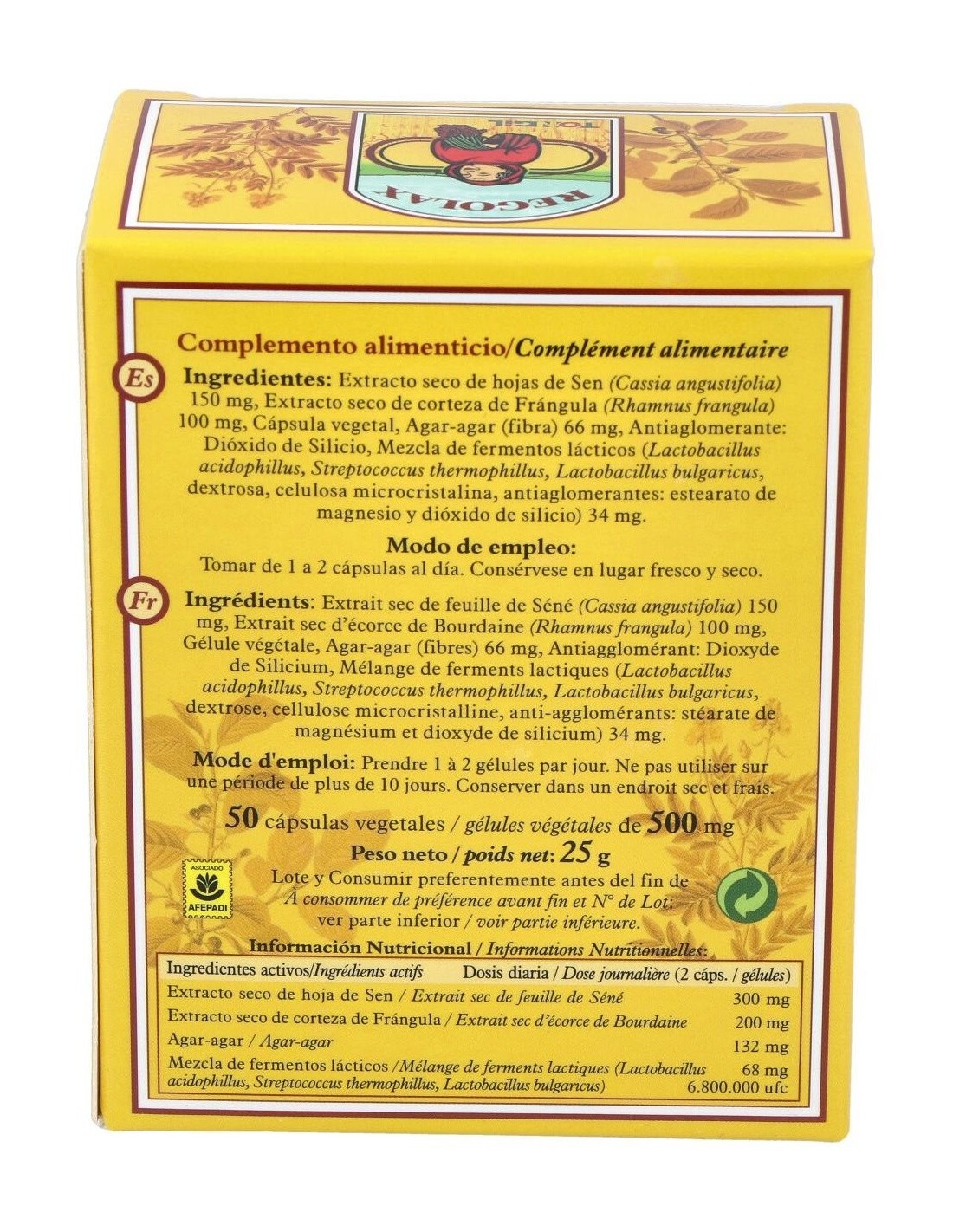 Tomar de 1 a 2 cápsulas diarias después de cenar o antes de acostarse, según necesidad, hasta regular el tránsito intestinal. Se aconseja beber bastante agua o zumos durante el día, así como incluir paulatinamente fibra vegetal en la alimentación (pan integral, salvado, etc...), hasta que finalmente el uso del producto no sea necesario.