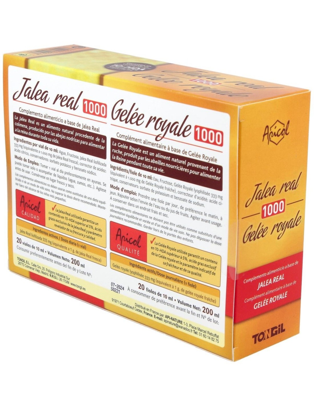 Complemento alimenticio a base de jalea real y miel, para el cuidado y mantenimiento de la salud del cuerpo. La jalea real ayuda a proteger y estimular el sistema inmune y fortalecer las defensas. Aporta mucha energía y vitalidad. Contribuye a mejorar y proteger las funciones cognitivas y el rendimiento físico. Ayuda a estimular la energía para el sistema nervioso gracias a su alto contenido de acetilcolina. Está indicada para momentos de cansancio o fatiga y también para estimular el apetito. Favorece al buen metabolismo energético y a disminuir la fatiga. Se presenta en ampollas bebibles. Recomendado para personas que quieran complementar una dieta equilibrada.