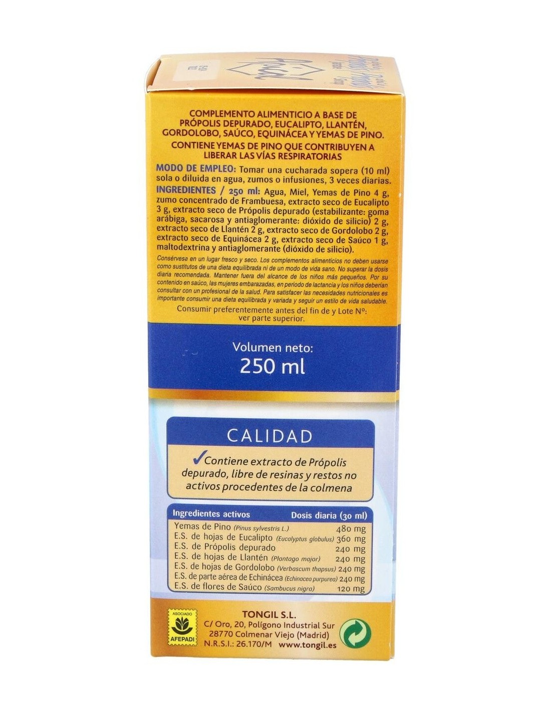 Complemento natural expectorante y balsámico elaborado con própolis depurado y extracto de planta que contribuyen a liberar las vías respiratorias. Está elaborado con Própolis depurado, Eucalipto, Llantén, Gordolobo, Sauco, Equinacea y Yemas de Pino. El Pino tiene una influencia beneficiosa sobre la garganta y las vías respiratorias obstruidas, ayuda a descongestionar la nariz y a respirar más libremente. La Echinácea y el Llantén alivian en caso de irritación de garganta y tienen un efecto suavizante y agradable sobre garganta, faringe y cuerdas vocales. La Echinácea contribuye a la correcta función de las defensas. Y contiene extracto de Própolis depurado, libre de resinas y restos no activos procedentes de la colmena.