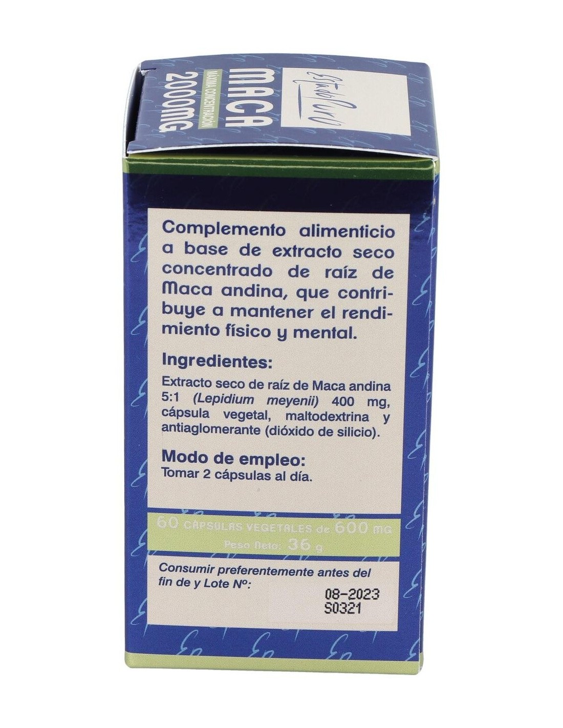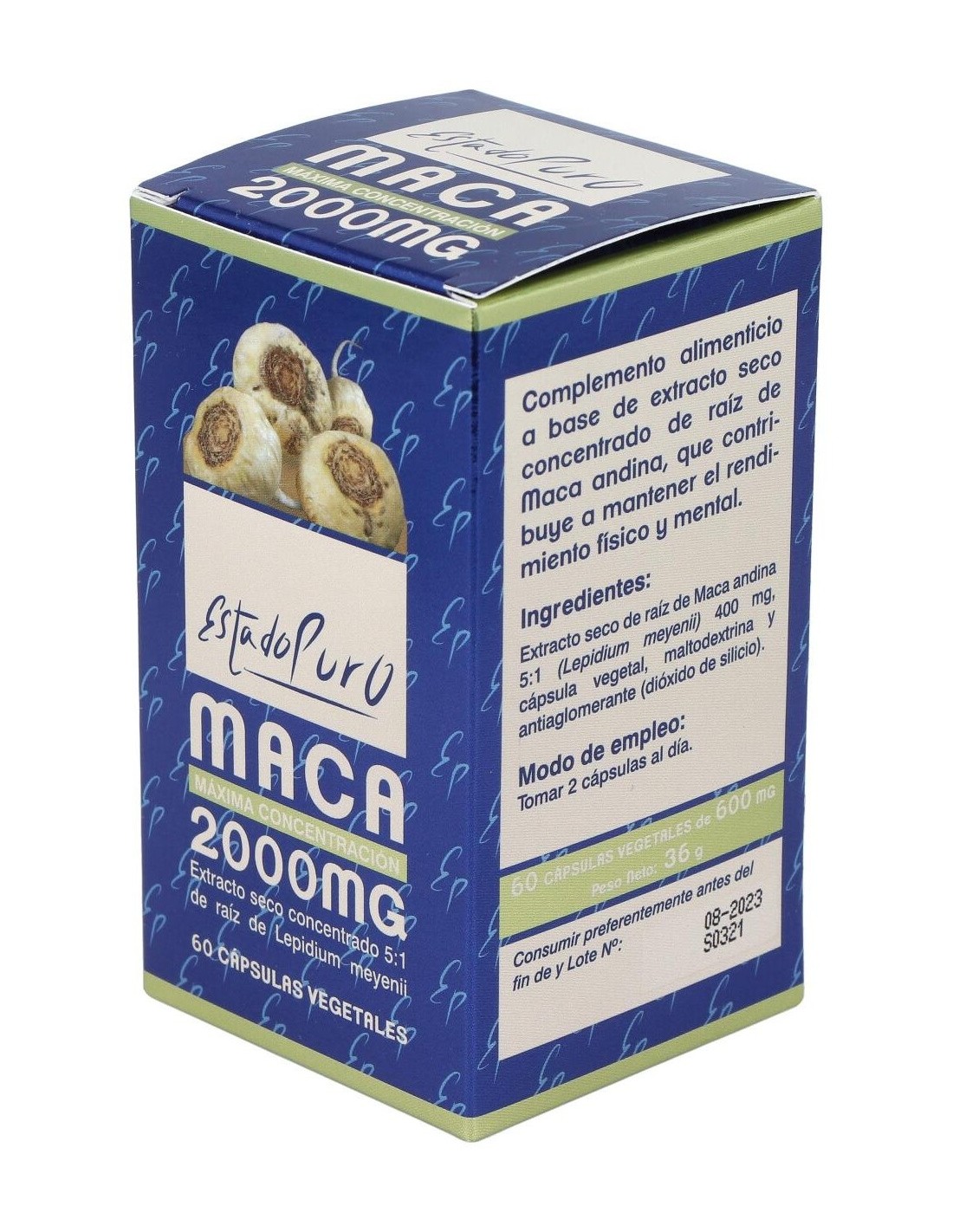 Extracto seco de Raíz de Maca andina (Lepidium meyenii) 5:1 (equivalente a 2000 mg de raíz de Maca)....................400 mg