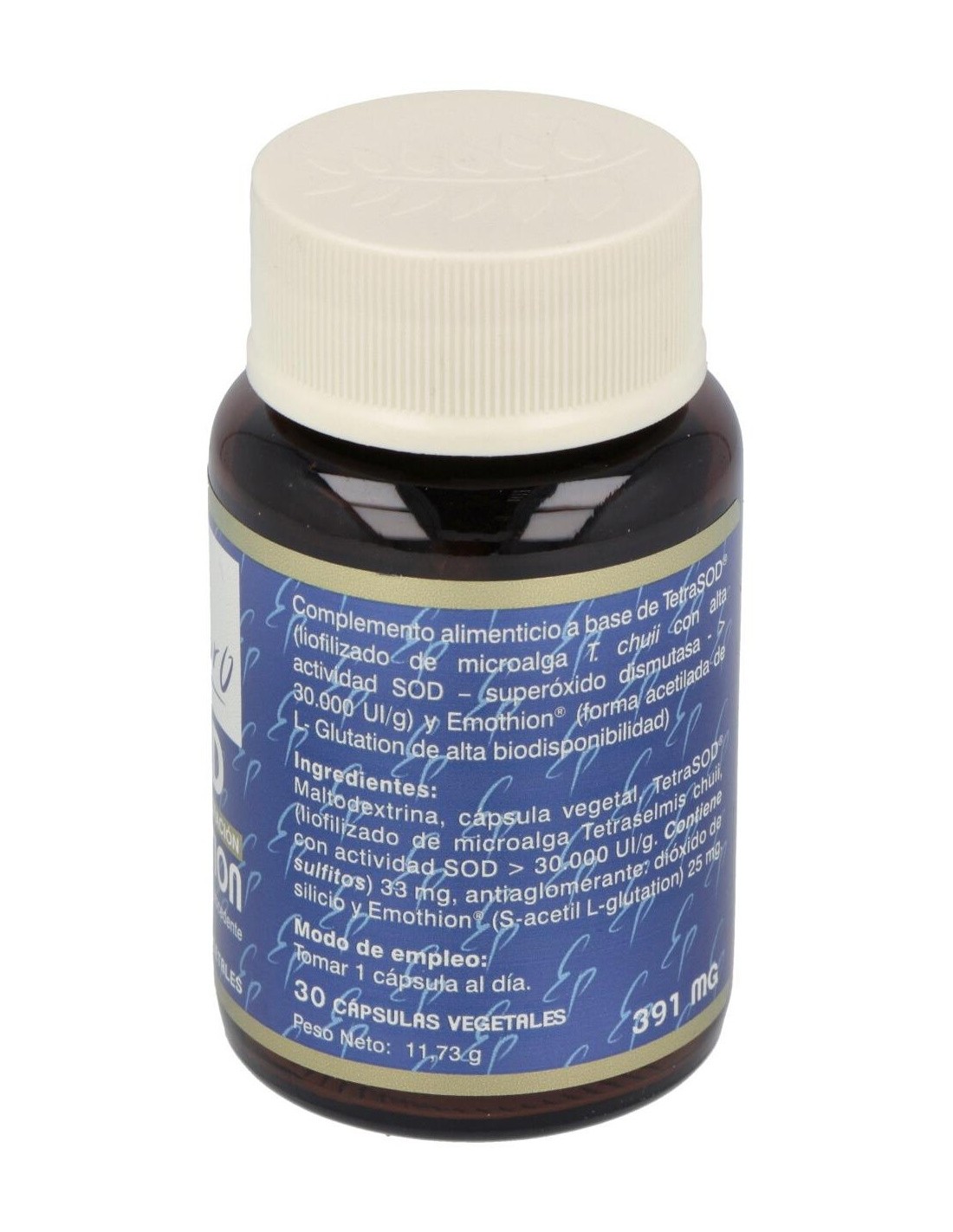 Complemento alimenticio a base de TetraSOD® (liofilizado de microalga T. chuii con alta actividad SOD superóxido dismutasa-) y Emothion® (forma acetilada de Glutation de alta biodisponibilidad). Apto para veganos.