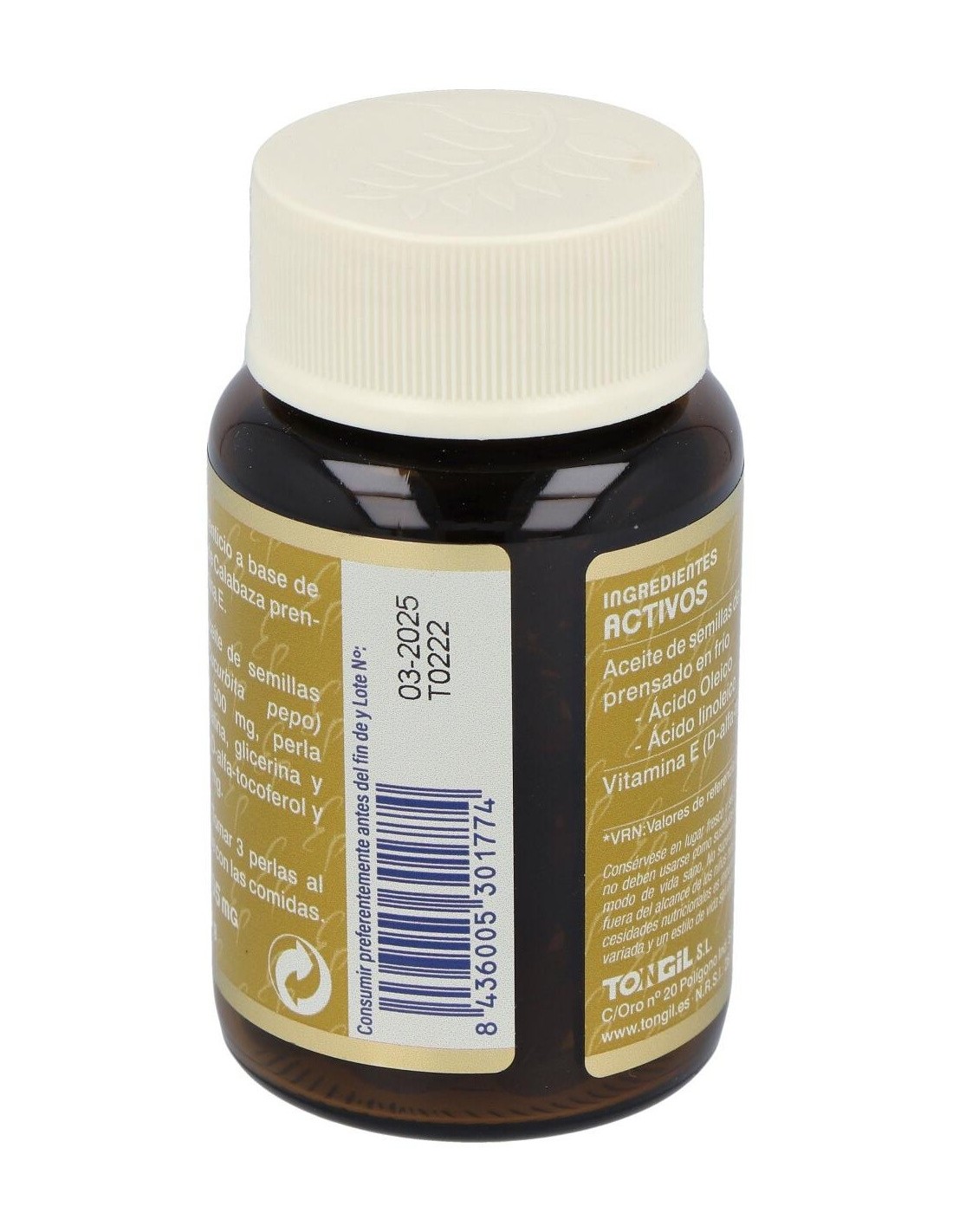 Aceite de semillas de Calabaza (Cucurbita pepo) prensado en frío 500 mg, perla envolvente de gelatina, glicerina y agua y vitamina E (D-alfa-tocoferol y aceite de girasol) 5 mg