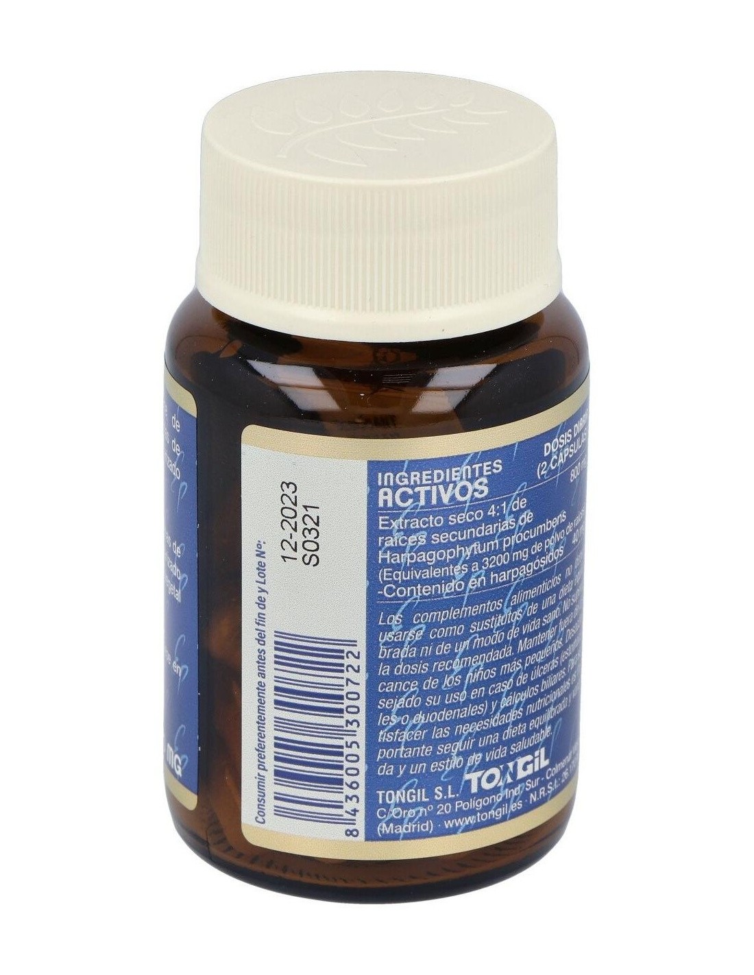 Extracto seco 4:1 de raíces secundarias de Harpagophytum procumbens (Equivalentes a 1600 mg de polvo de raíces)......................400 mg