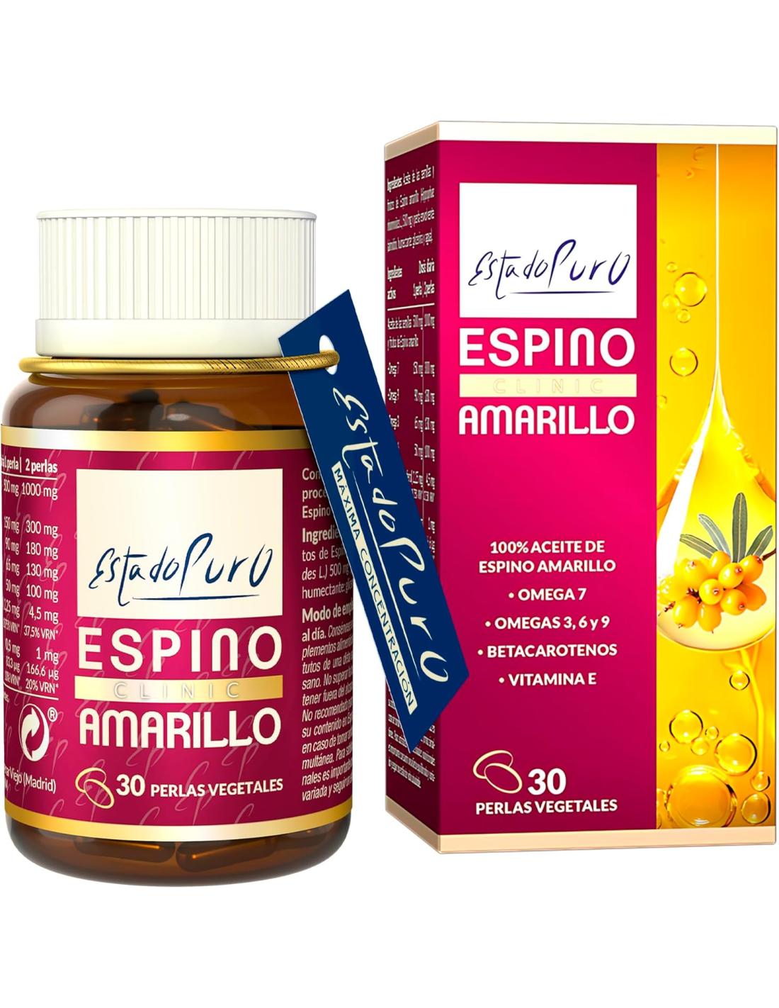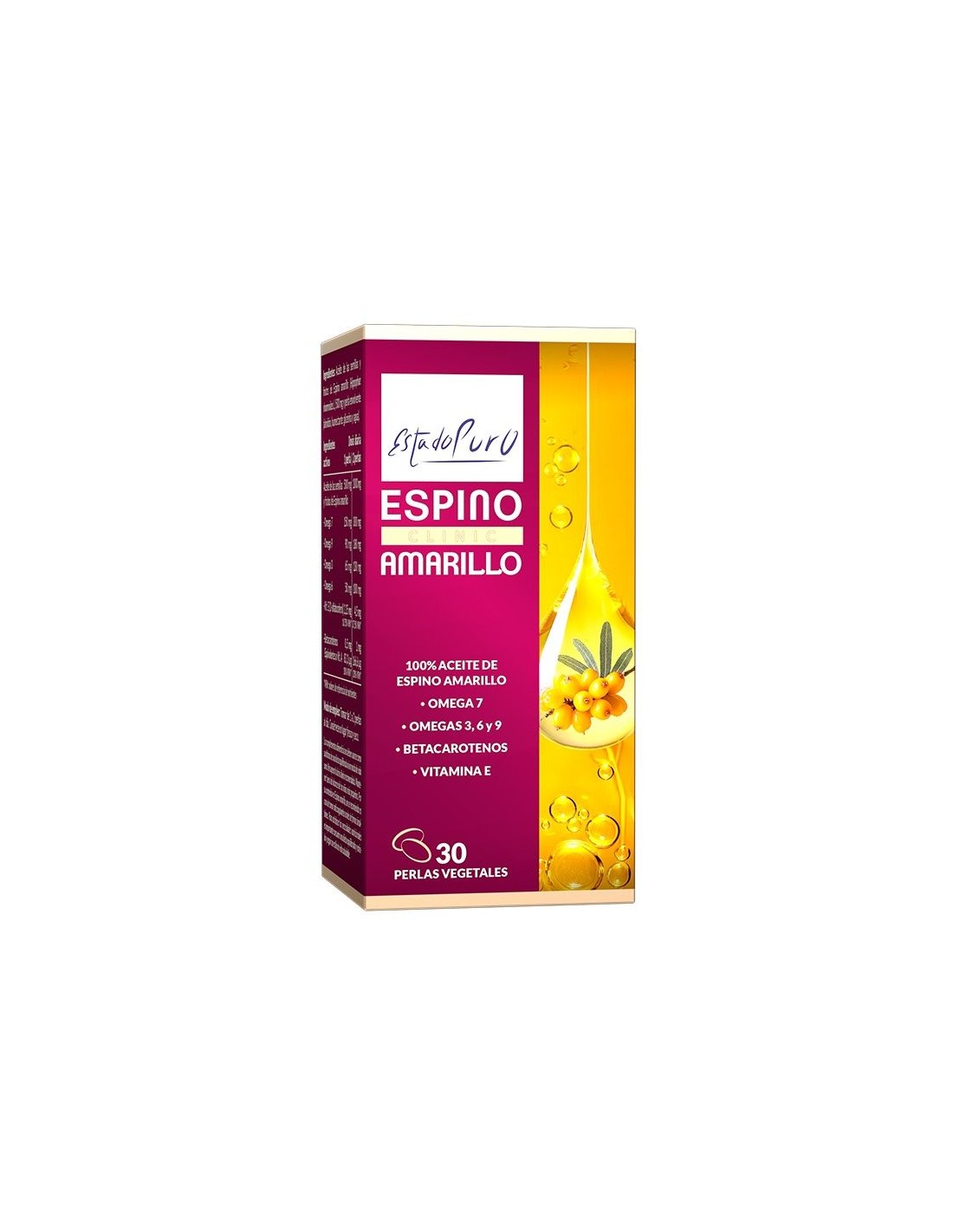 Contiene aceite de Espino amarillo (Hippophae rhamnoides) originario del Tíbet, que representa la fuente más concentrada de omega 7 de la naturaleza. Además, aporta de forma natural ácidos grasos omega 3, 6 y 9, betacarotenos y vitamina E.l aceite se obtiene con la avanzada tecnología de extracción y purificación de CO2 supercrítico a partir de los semillas y frutos del espino amarillo, preservando sus cualidades y la pureza y concentración de todos sus componentes.El resultado final es un aceite de espino amarillo concentrado de la máxima calidad, 100% natural, exento de solventes químicos, que proporciona el espectro completo de ácidos grasos omega (estandarizado al 30% omega 7, 13% omega 3, 10% omega 6, 18% omega 9), y vitamina E y betacarotenos, que contribuye a mantener la piel y mucosas en condiciones normales.Composición activa por perla:500 mg de aceite de semillas y frutos de espino amarillo (150 mg de Omega 7, 90 mg de omega 9, 65 mg de omega 3, 50 mg de omega 6, 2,25 mg de vitamina E y 0,5 mg de betacaroteno(83,3 mcg de vitamina A)).Otros ingredientes:Perla envolvente (almidón, humectante: glicerina vegetal y agua).Modo de empleo:Tomar de 1 a 2 perlas al día.Presentación:Envase de 30 perlas vegetales.Recomendaciones y advertencias:Apto para veganos.