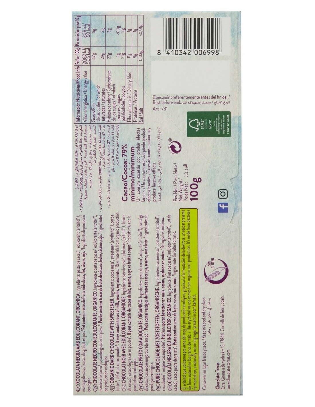Chocolate negro al 79% cacao puro, sin gluten ni azúcares añadidos. La semilla de cacao tiene propiedades antiinflamatorias y cardioprotectoras. Contribuye a la producción y segregación de endorfinas, hormonas relacionadas con el bienestar. Es una fuente de fibras y favorece el equilibrio de la presión arterial. Es un producto vegano elaborado con ingredientes de origen ecológico. Apto para diabéticos.