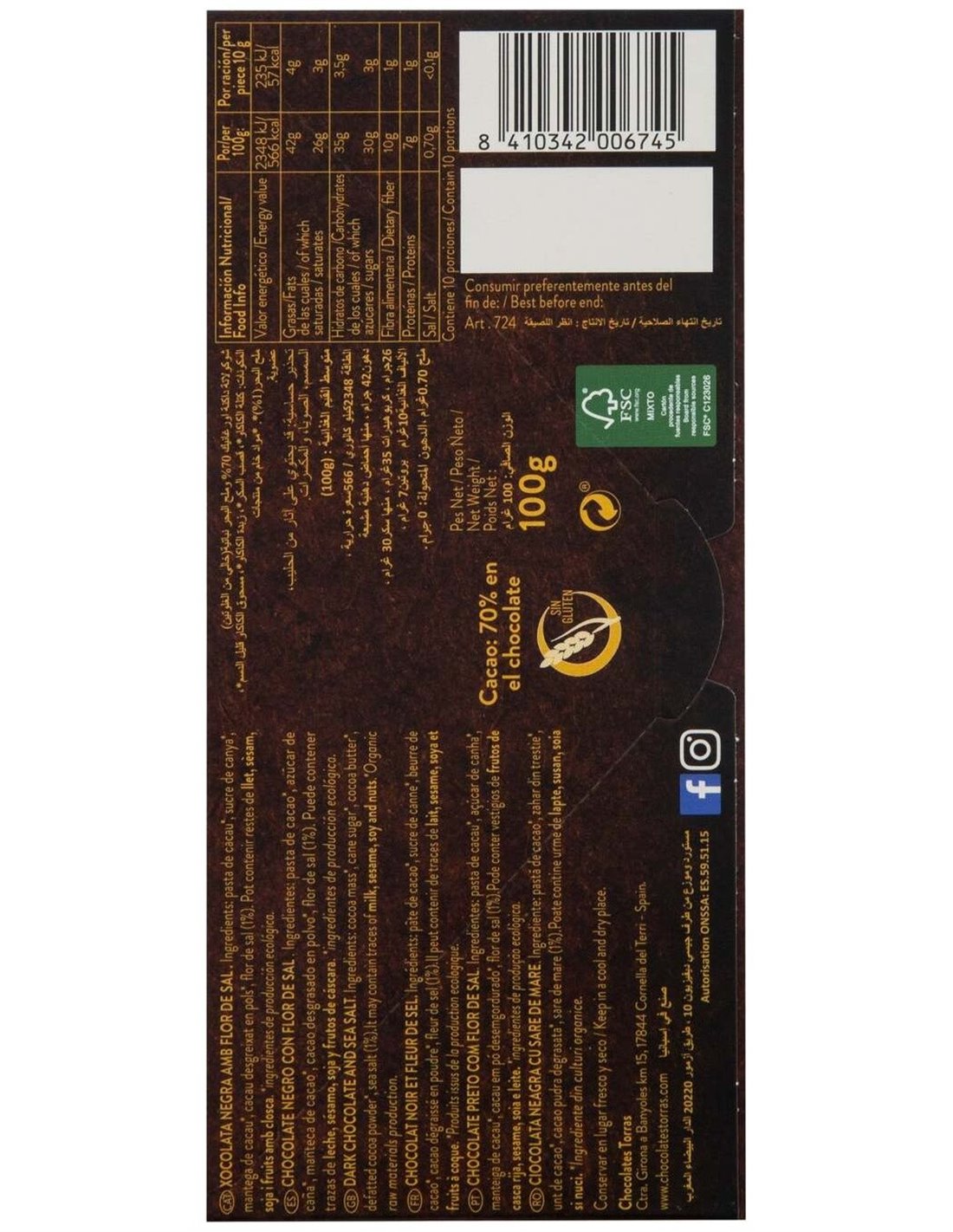 Chocolate Negro 70% Con Flor De Sal 100G Bio Sg de Torras