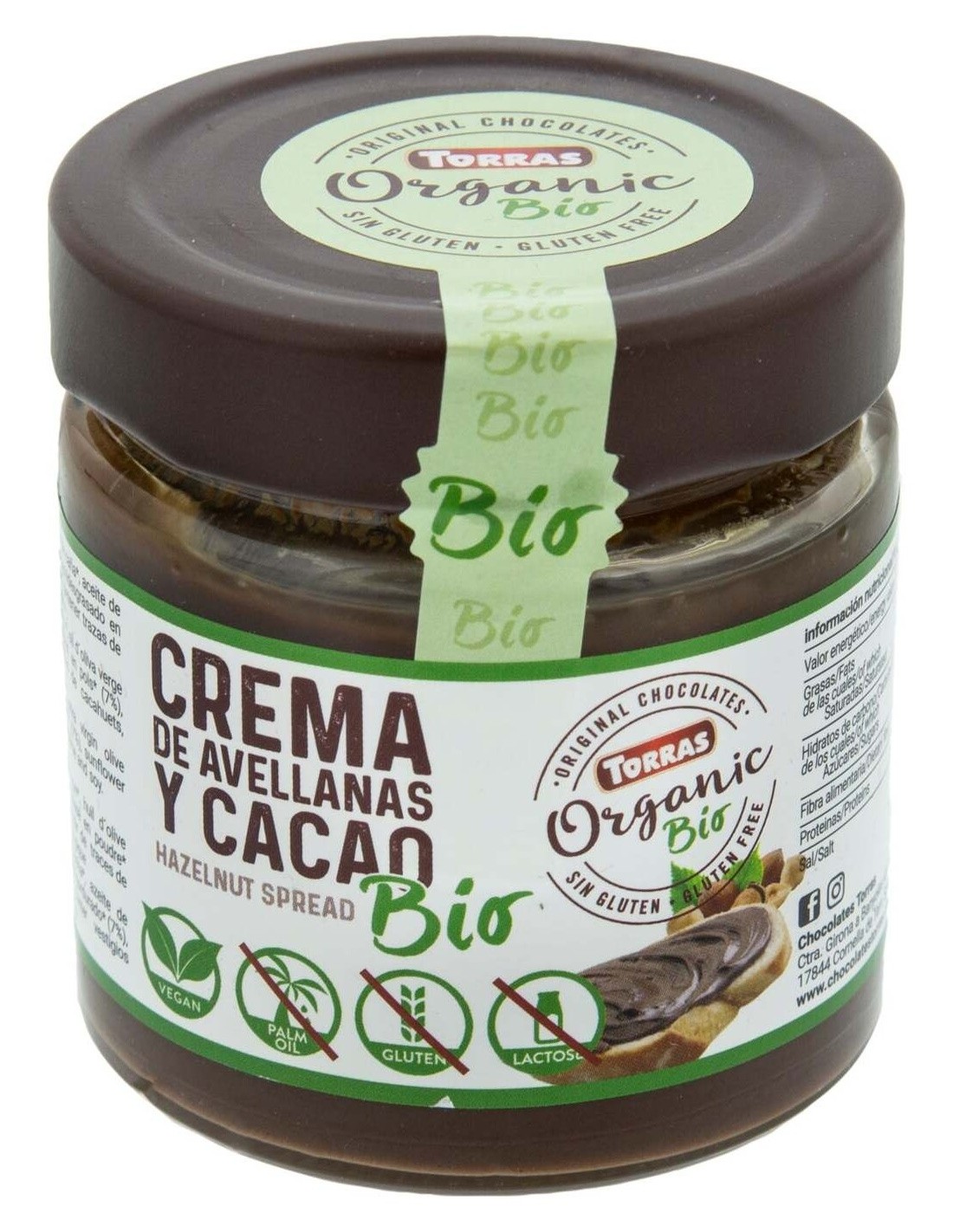 TORRASCrema de avellanas y cacao orgánico. Libre de bisfenol. Vegano, sin gluten.
