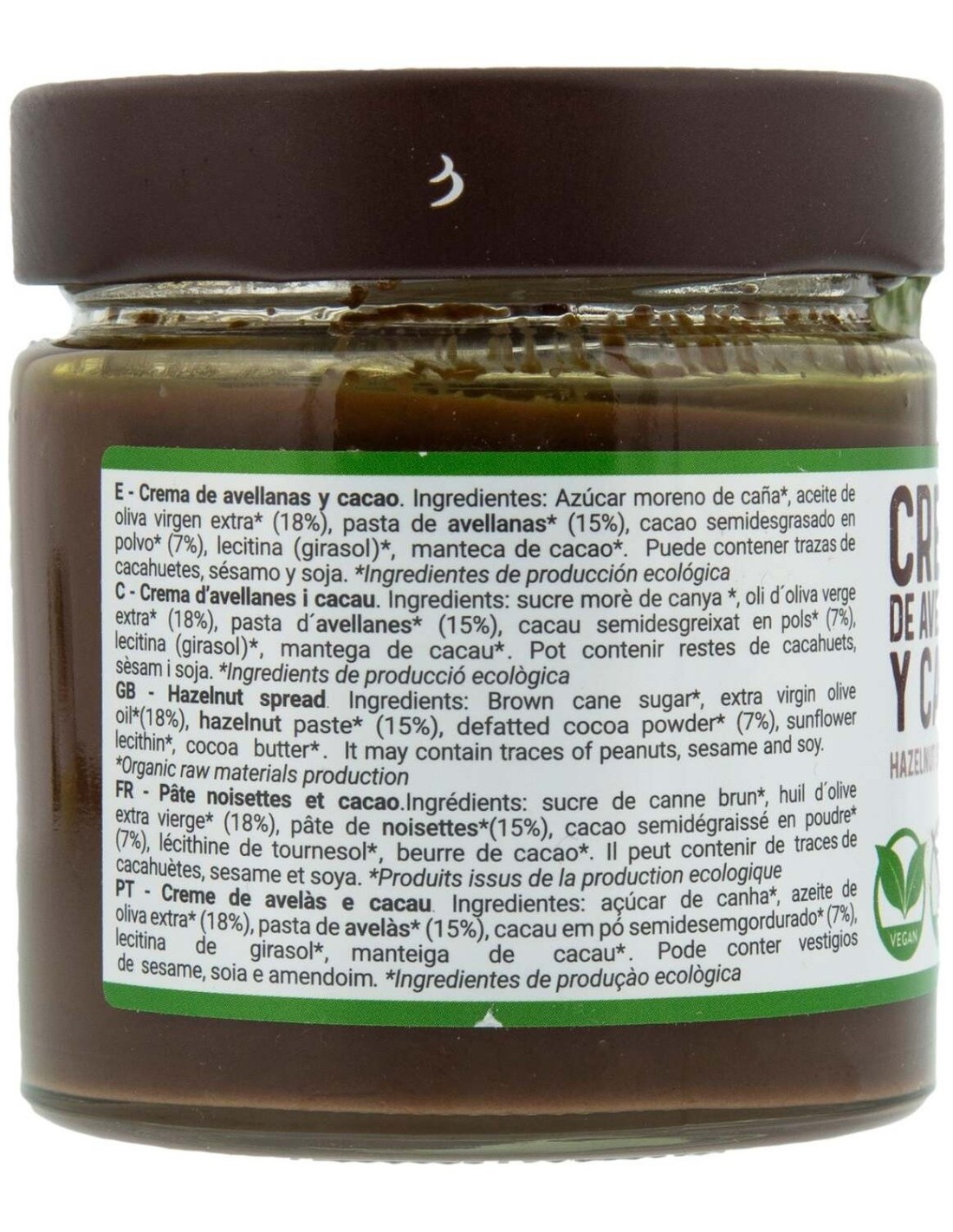 Azúcar moreno de caña*, aceite de oliva virgen extra*, pasta de avellanas* (15%), cacao semidesgrasado en polvo*, manteca de cacao*, emulgente (lecitina de girasol*). \ \ Valor nutricional por 100 g:\ Valor energético (kJ/kcal): 2200 KJ / 526 kcal\ Grasas: 28 g\ de las cuales saturadas: 4 g\ Hidratos de carbono: 62 g\ de las cuales Azúcares: 59 g\ Polialcoholes: 0 g\ Fibra alimentaria: 1 g\ Proteínas: 4 g\ Sal: 0,01 g\ \ (*)= Ingredientes de producción ecológica.