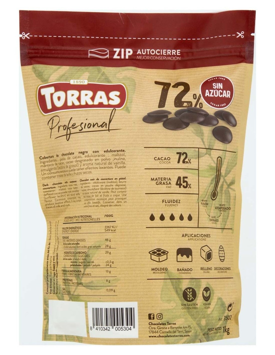 TORRASCobertura de chocolate negro con edulcorante. Producto semielaborado, destinado a obradores o pastelerías, a población que quiera seguir dietas bajas en azúcares y para la elaboración de coberturas. Alimento vegano, sin gluten.