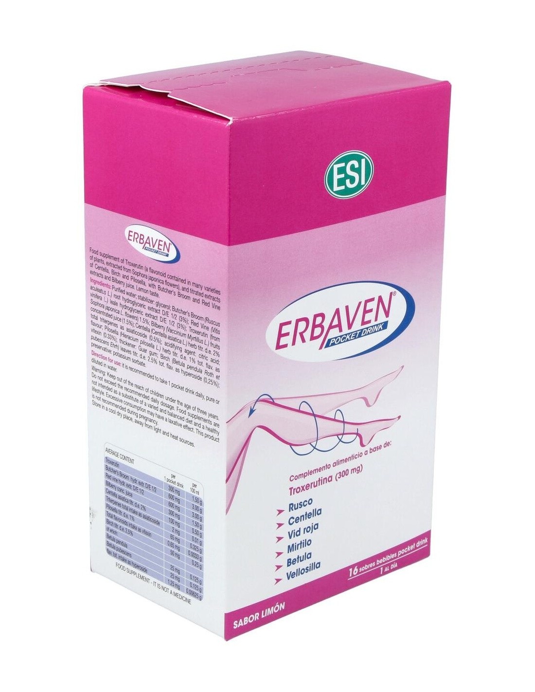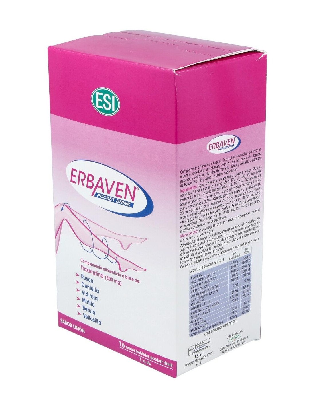 Erbaven Pocket Drink es un suplemento dietético indicado para el tratamiento de problemas circulatorios en las extremidades inferiores. Mejora el riego sanguíneo para que tus piernas se sientan ligeras y descansadas, evitando varices y flevitis.