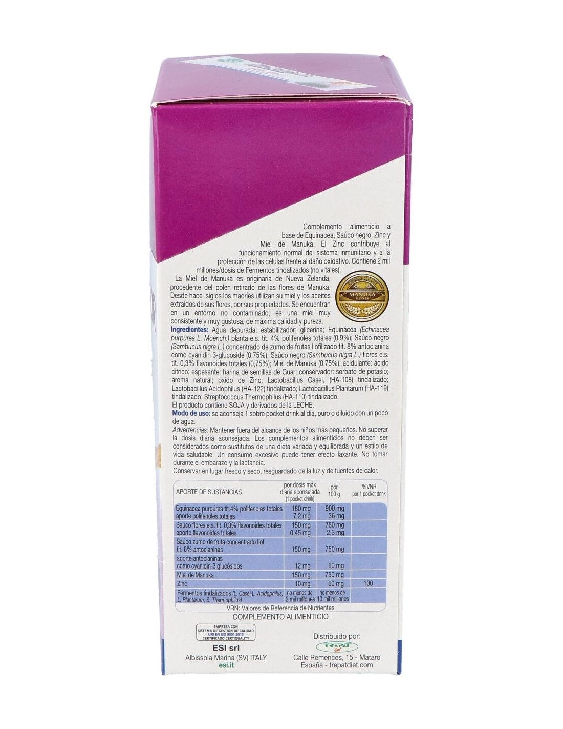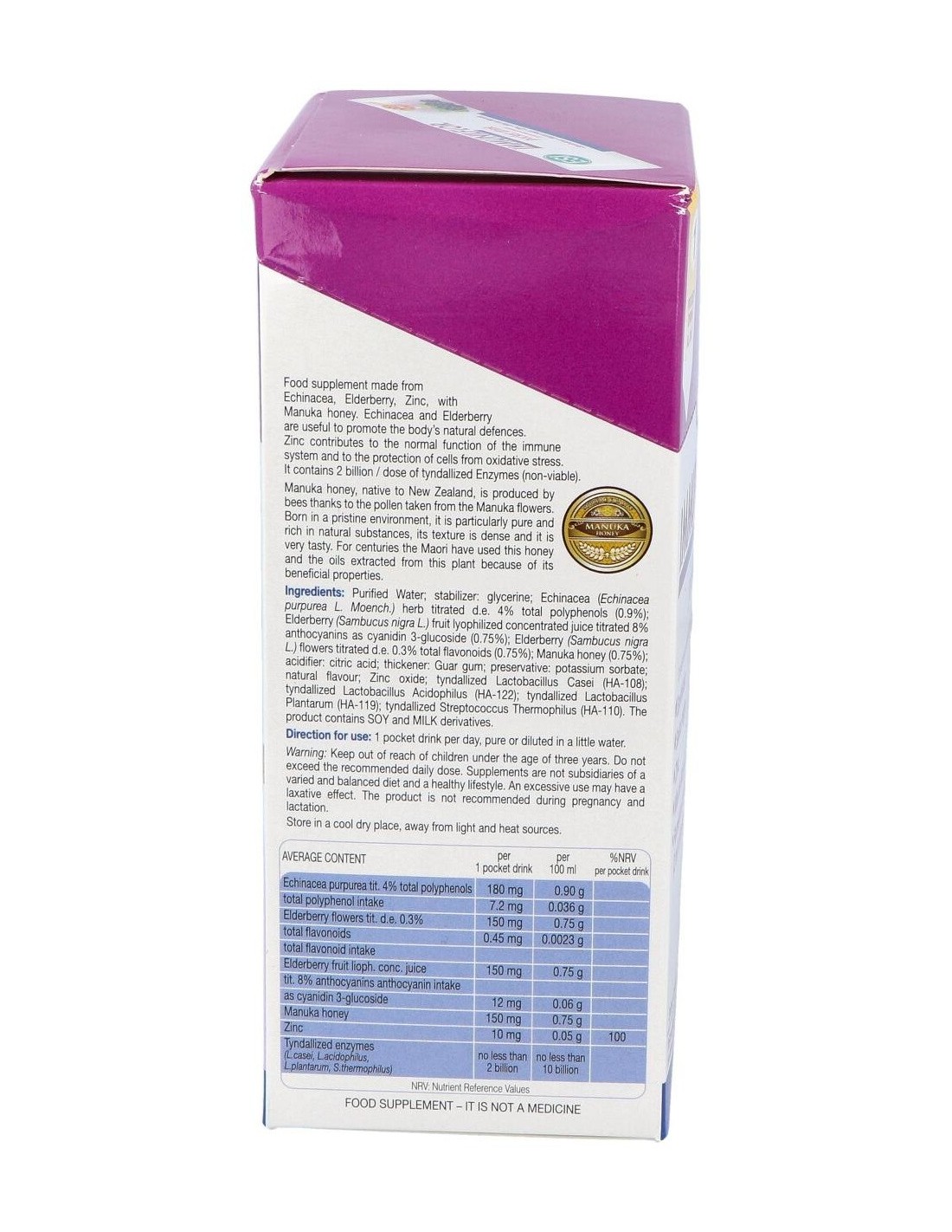 Complemento alimenticio a base de Equinácea, Saúco, Zinc, con Miel de Manuka. La Equinácea y el Saúco son útiles para favorecer las defensas naturales del organismo. El Zinc contribuye al funcionamiento normal del sistema inmunitario y a la protección de las células contra el estrés oxidativo.