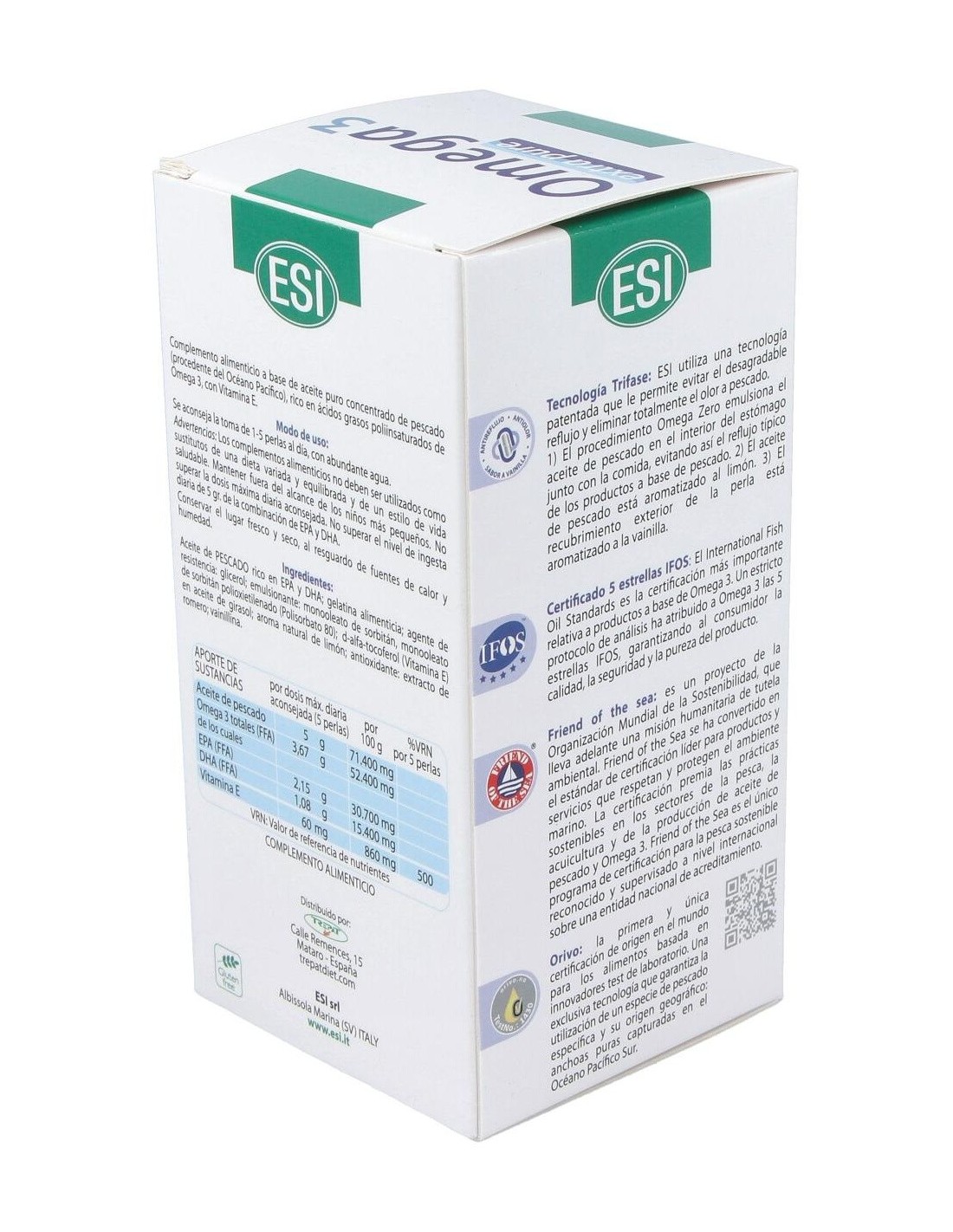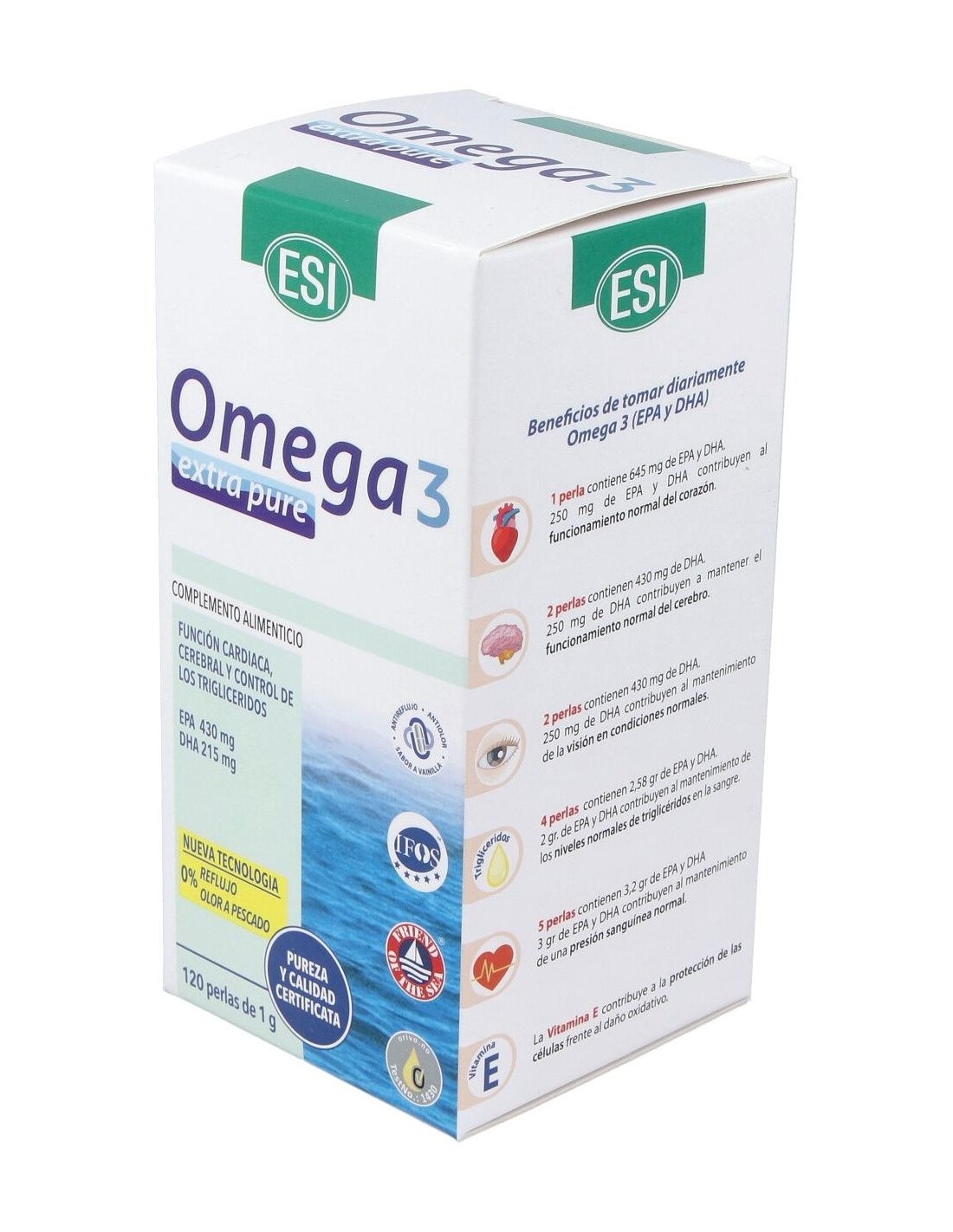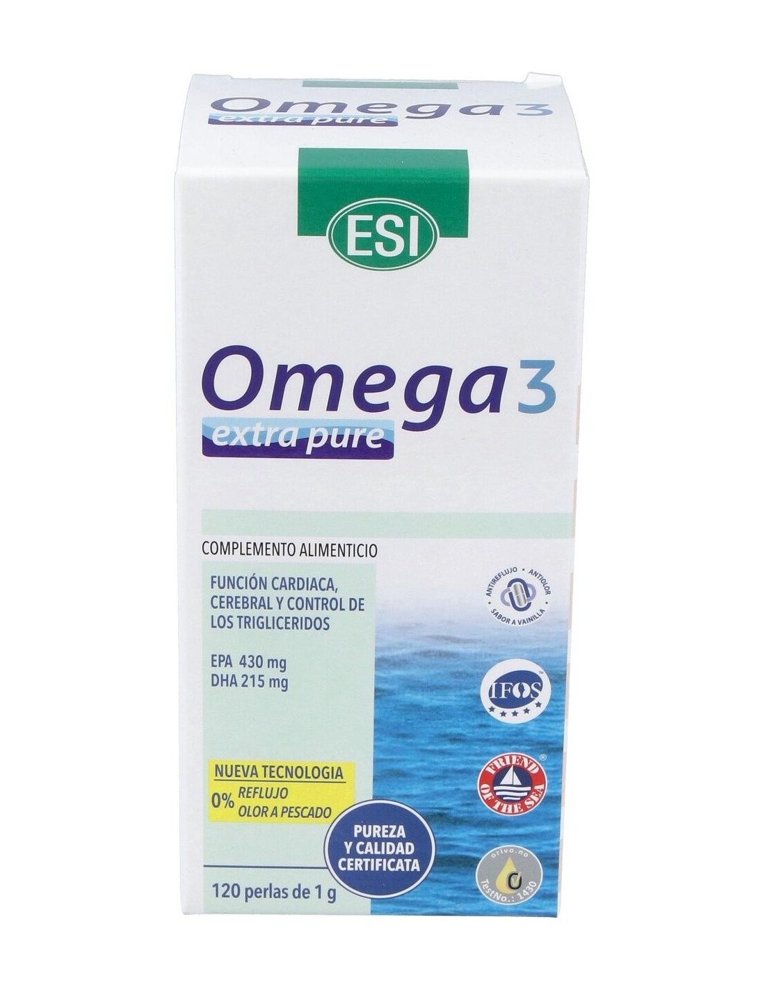 Suplemento a base de aceite puro concentrado de pescado (procedente del océano pacífico) rico en ácidos grasos poliinsaturados de la serie Omega 3, estandarizado y altamente concentrado. El producto se presenta en forma de perlas con una tecnología antirreflujo. La alta concentración y pureza está avalada por la certificación 5 estrellas IFOS que garantiza la calidad, seguridad y pureza del producto. Omega 3 extra pure se presenta en forma de ácidos grasos libres naturales. No contiene dioxinas ni metales pesados.