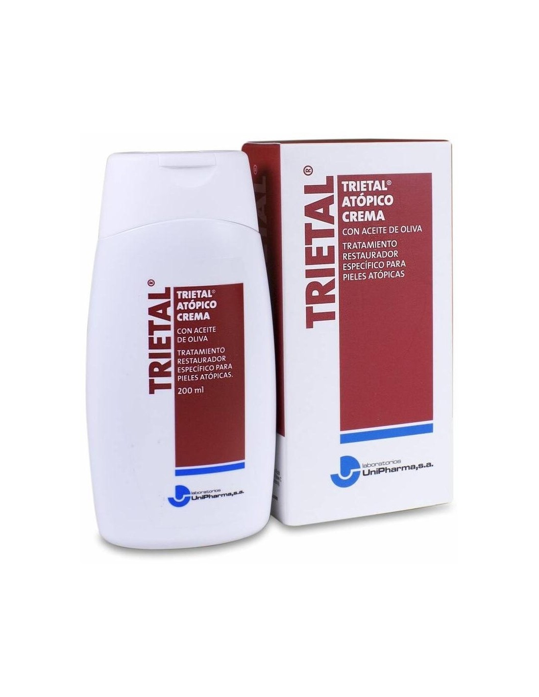 Unipharma Trietal® Atópico crema 200 ml es una crema hidratante y lubricante indicada para pieles secas o atópicas ya que le devuelve su natural superficie suave. Su excelente formulación contribuye a reconstruir la película hidrolipidica de la piel imprescindible para proteger la piel de las agresiones externas. De esta manera, la crema facilita la hidratación de la capa cornea y minimiza la descamación de la piel.