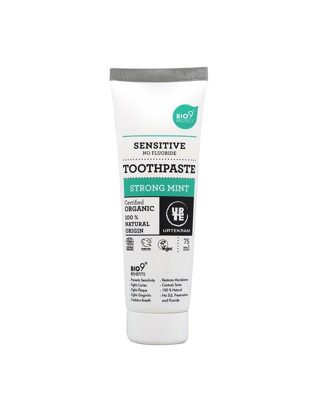 El dentífrico con extracto de corteza de sauce probiótico. Desarrollada para equilibrar la defensa natural de la boca y aliviar los dientes sensibles, además de la protección natural de la pasta dental Urtekram. Puede usarlo por separado o junto con el enjuague bucal sensible a la menta fuerte URTEKRAM® para un mejor resultado.Bio9® da 9 fuertes beneficios. Ayuda a Prevenir la sensibilidad y a combatir la caries. Lucha contra la placa. Ayuda a combatir la gingivitis y refresca el aliento- Sin SLS, conservantes y fluoruro.