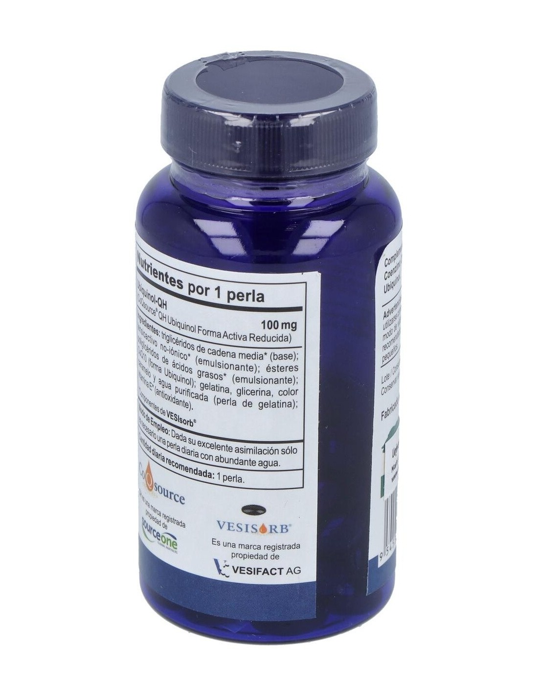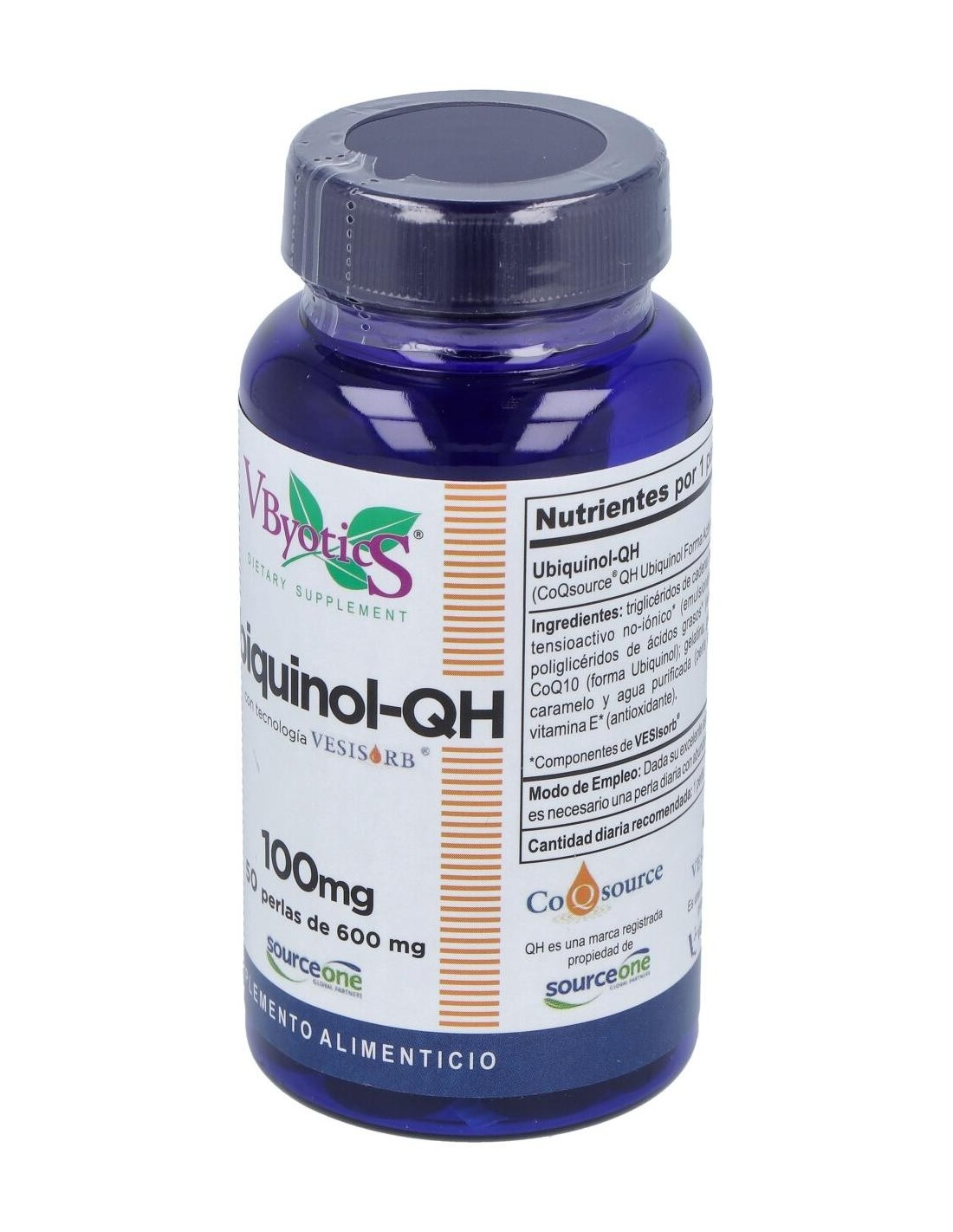 Ubiquinol coenzima Q10 activada (CoQsource®-QH): perla de gelatina (emulsionante: gelatina, glicerina: color: caramelo): triglicéridos de cadena media: emulsionantes: tensioactivo no-iónico, ésteres de poliglicero.