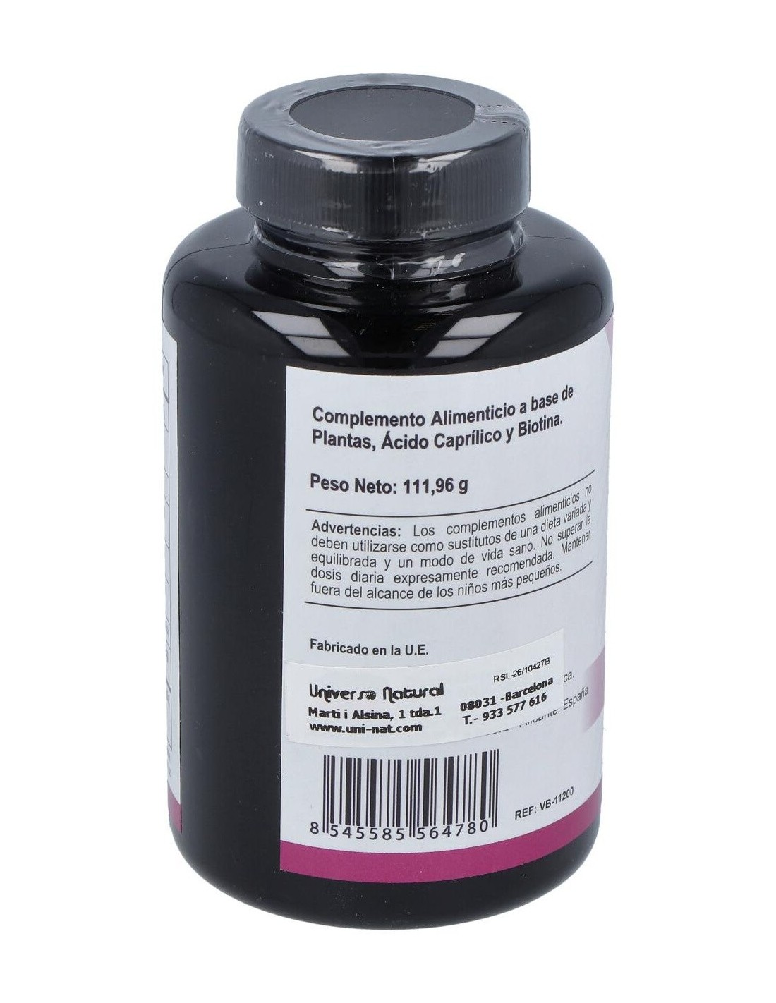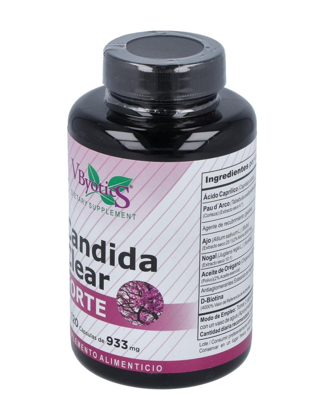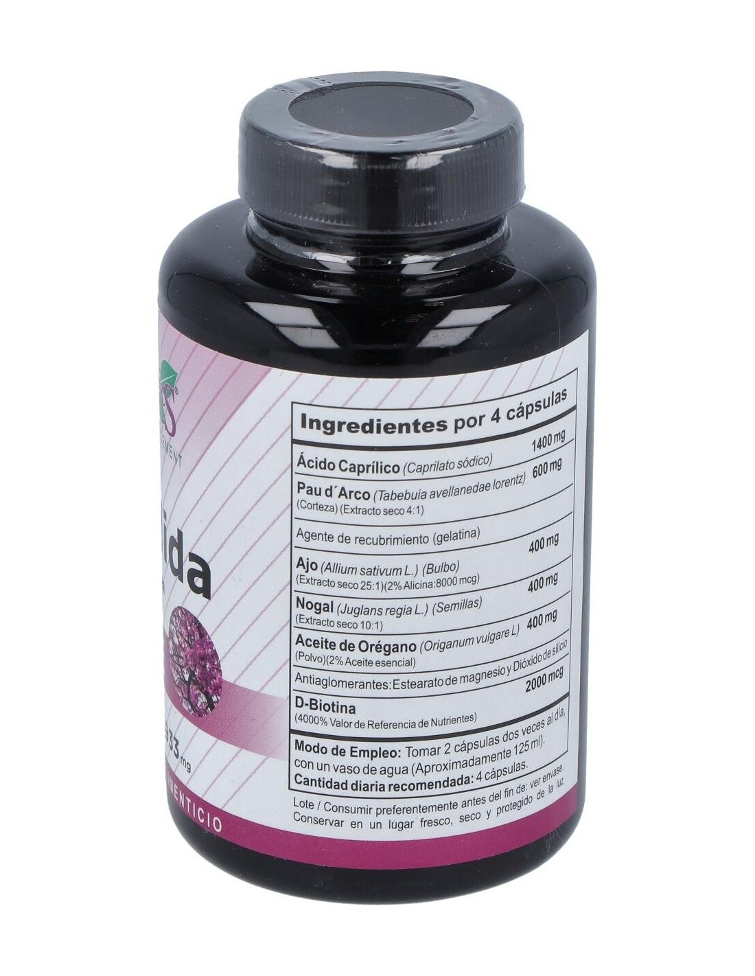 Composición por 4 cápsulas: Ácido caprílico: 1400 mg, Pau darco (corteza) (extracto seco 4:1) 600 mg, Ajo (bulbo) (extracto seco 25:1) 400 mg, Nogal (semillas) (extracto seco 10:1) 400 mg, Aceite de orégano (polvo) (2% aceite esencial) 400 mg, Dbiotina 2000 mcg, Estearato de magnesio, dióxido de silicio, gelatina. *Puede contener trazas de alérgenos.