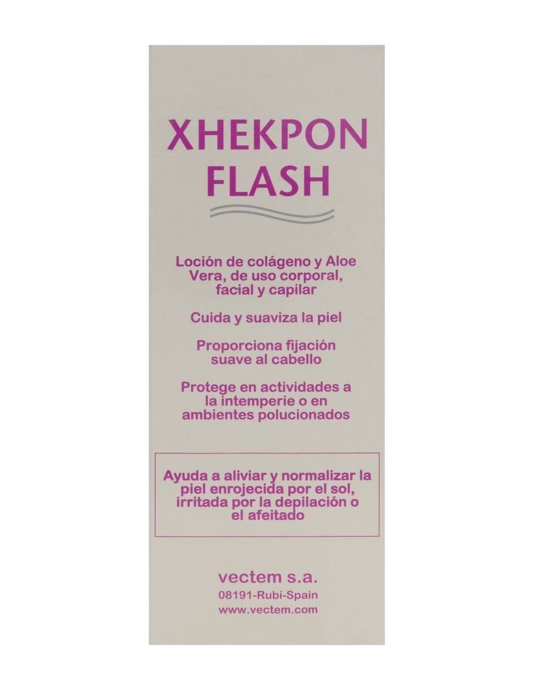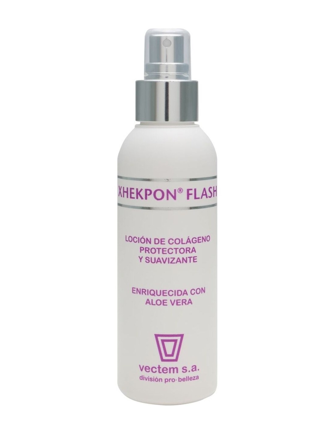 Xhekpon® Flash es una loción suavizante y protectora que combina los beneficios del colágeno con los del aloe vera. Este producto descongestiona e hidrata tu cutis, estimulando la creación de nuevas fibras de colágeno, así como protegiendo la piel de la contaminación ambiental.