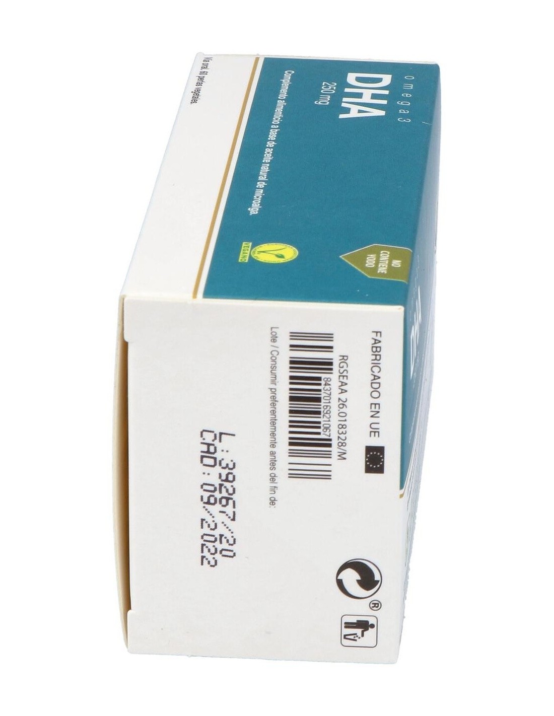 Aceite de microalga Schyzochitrium sp 625 mg (250mg de ácido docosahexaenoico (DHA)) contenido en cápsulas de softgel (perlas), gelatina vegetal, almidón de maíz modificado, glicerol, gelificante (carragenano), anitoxidante (mezcla de tocoferoles), aceite vegetal (triglicéridos de cadena media), emulgente (lecitina de girasol), antioxidante (palmitato de ascorbilo), corrector de acidez (carbonato de sodio), antioxidante (extracto de romero)