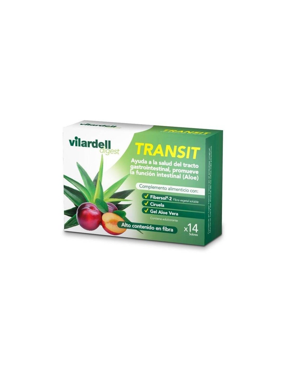 VILARDELLComplemento alimenticio con Fibra vegetal soluble (Fibersol®-2), Ciruela deshidratada en polvo y Gel de Aloe que ayuda a la función normal del tracto gastrointestinal (Aloe). Gracias a su alto contenido en fibra vegetal soluble con Fibersol®-2 (maltodextrina resistente a la digestión) e inulina, Vilardell Digest Transit ayuda a mantener una regularidad intestinal normal, además de promover eficazmente el crecimiento de una variedad de bacterias beneficiosas en el colon. La especial fibra Fibersol®-2 por su lenta fermentación no produce gases. Además, Vilardell Digest Transit contiene Ciruela y Aloe vera que ayudan a restablecer la flora intestinal y promueven la función intestinal.