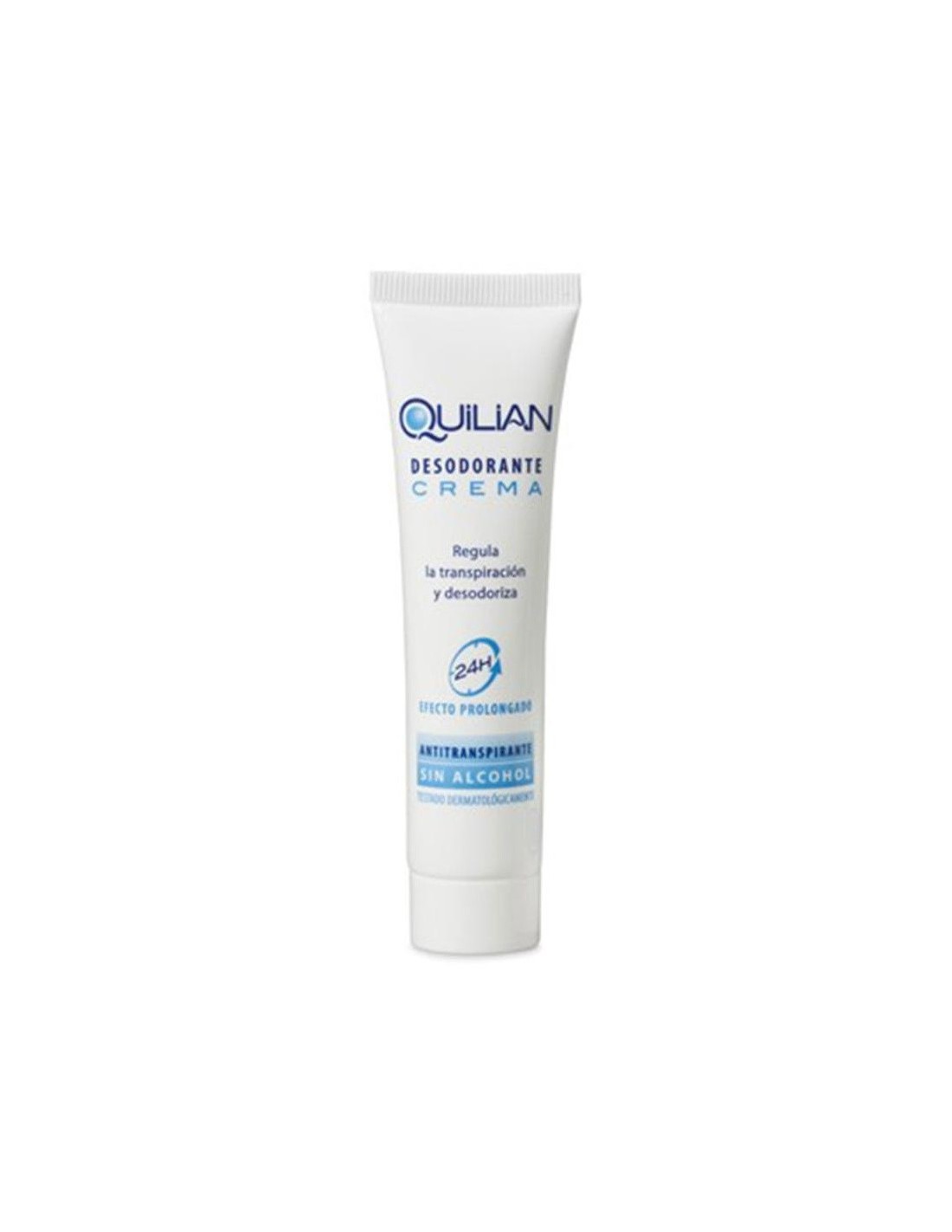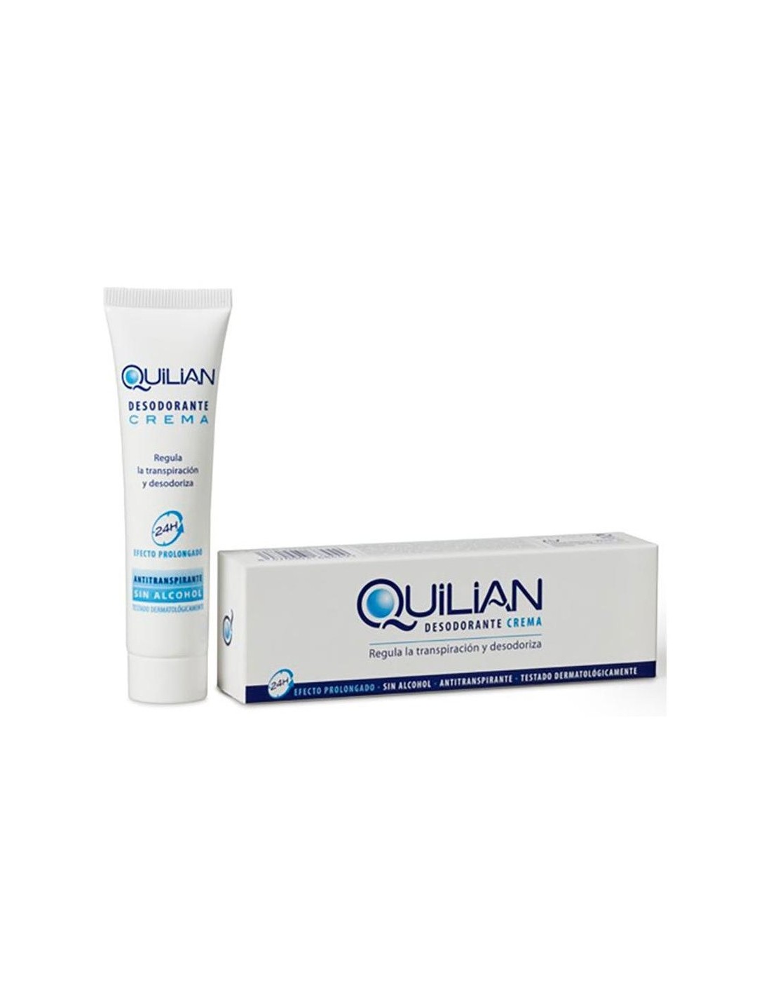 Quilian Desodorante Crema regula la transpiración corporal y evita la descomposición del sudor, suprimiendo el desagradable olor característico. Su textura suave y penetrante no mancha ni engrasa la piel. No contiene alcohol. Quilian Desodorante Crema se presenta en forma de tubo con aplicador, lo que asegura la máxima higiene y comodidad de uso.\ La potente acción de Quilian Desodorante Crema consigue que una sola aplicación del producto sea suficiente para que sus efectos se mantengan las 24 horas del día.