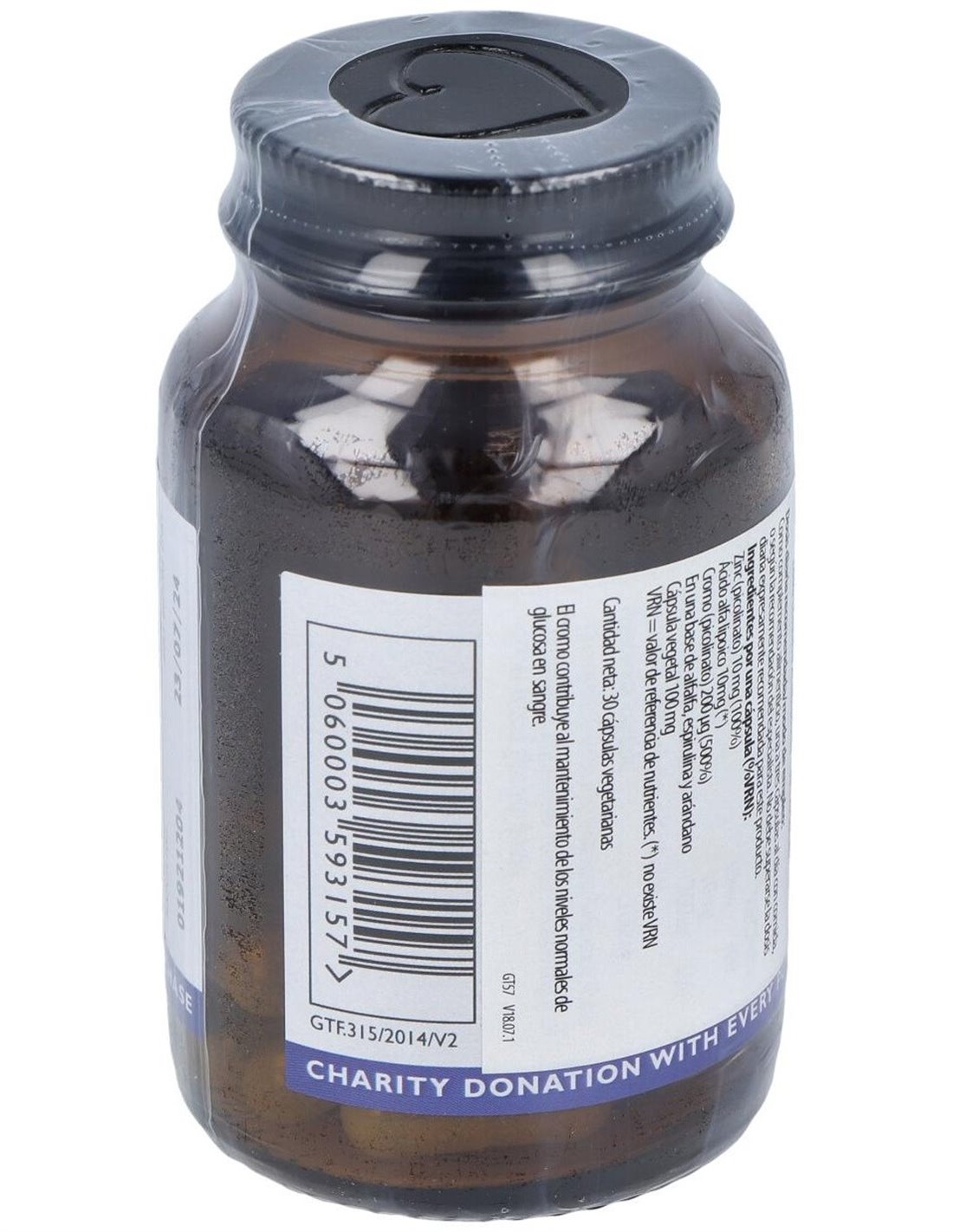 CINC (PICOLINATO) 10 MG, ÁCIDO ÁCIDO ALFA LIPOICO 10 MG, CROMO (PICOLINATO) 200 UG, CÁPSULA CELULOSA VEGETAL 100 MG, EN UNA BASE DE ALFALFA, ESPIRULINA Y ARÁNDANO.
